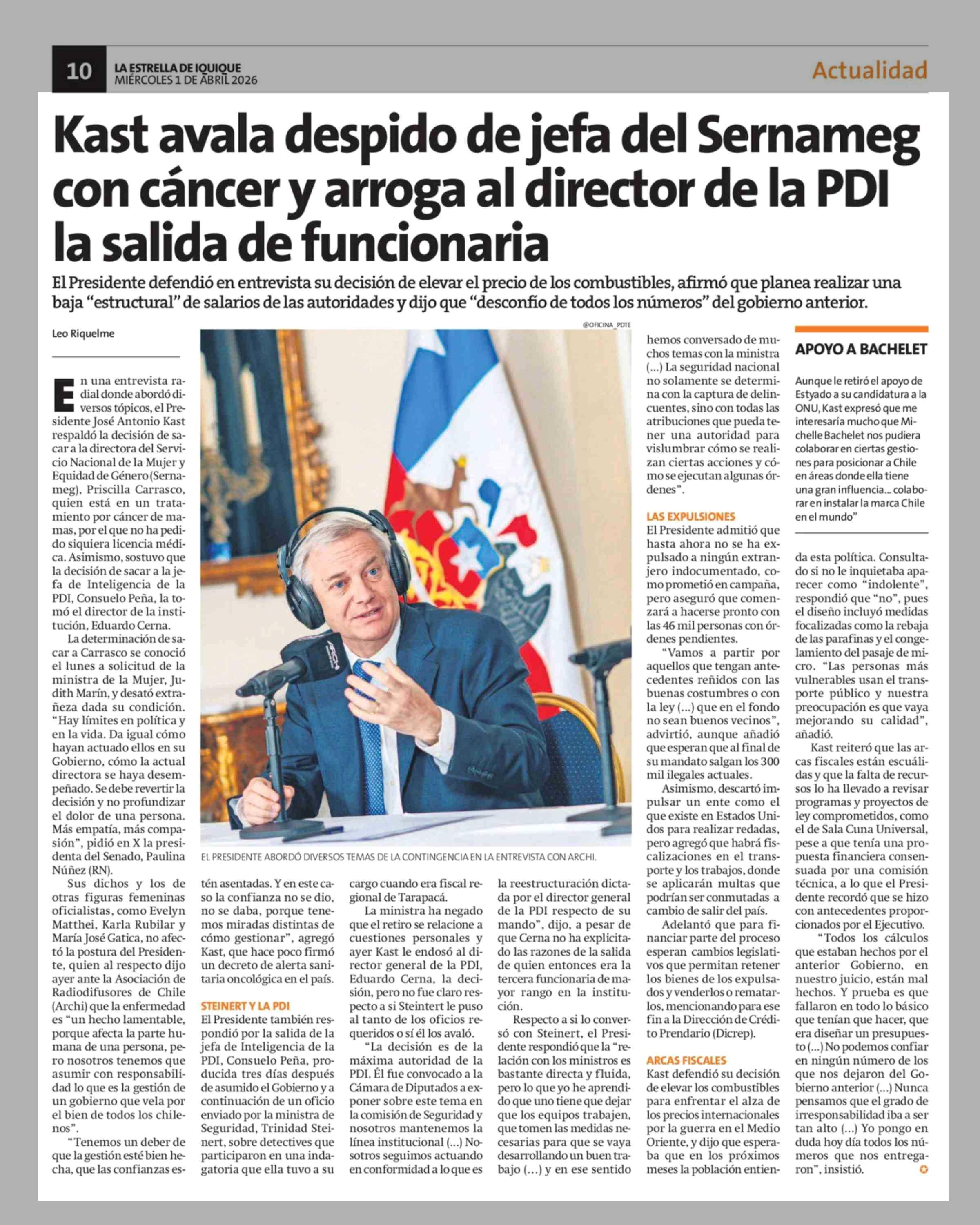 Título: Kast avala despido de jefa del Sernameg con cáncer y arroga al director de la PDI la salida de funcionaria