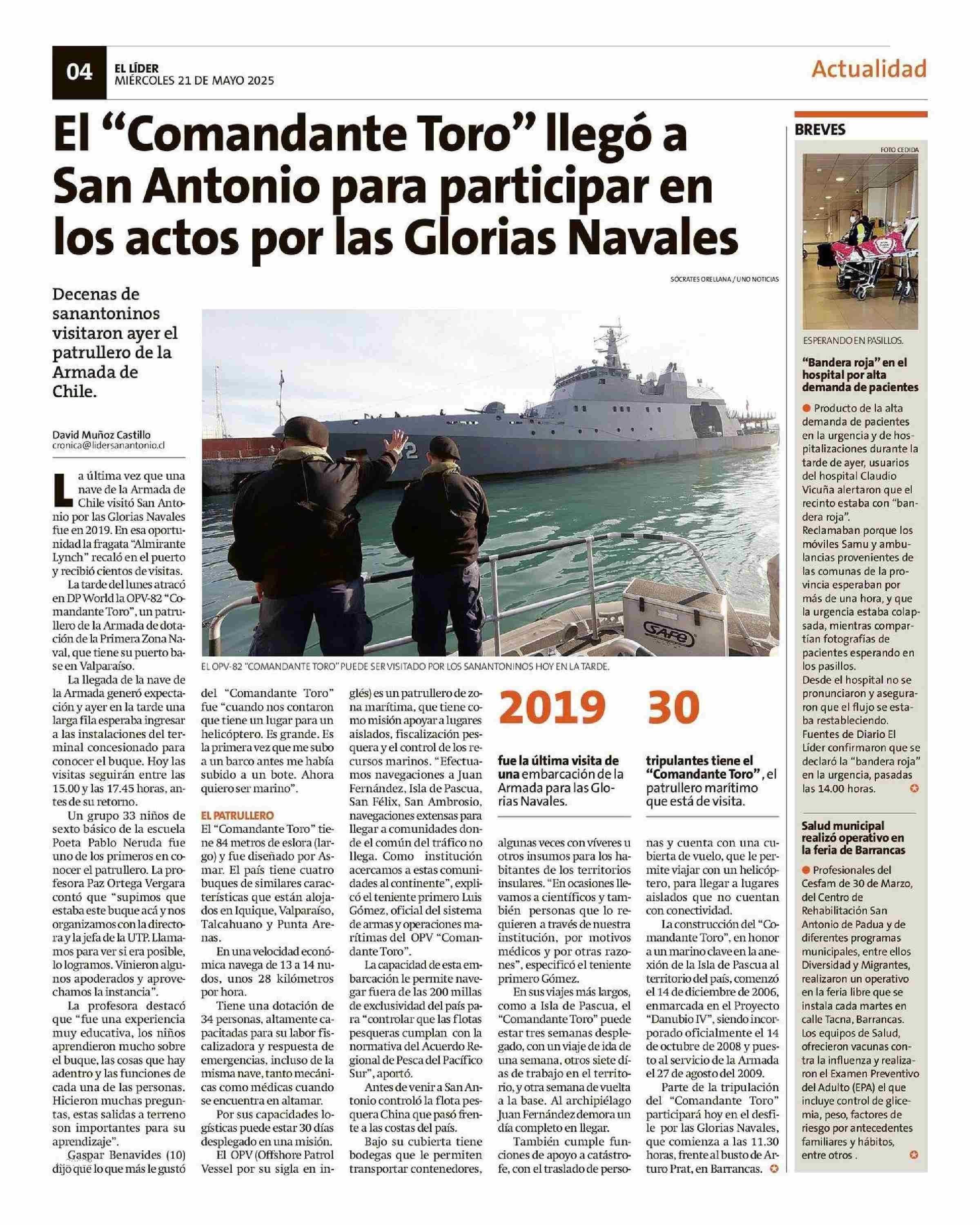 El “Comandante Toro” llegó a los actos por las Glorias Navales San Antonio para participar en 21-05-2025 El Líder |