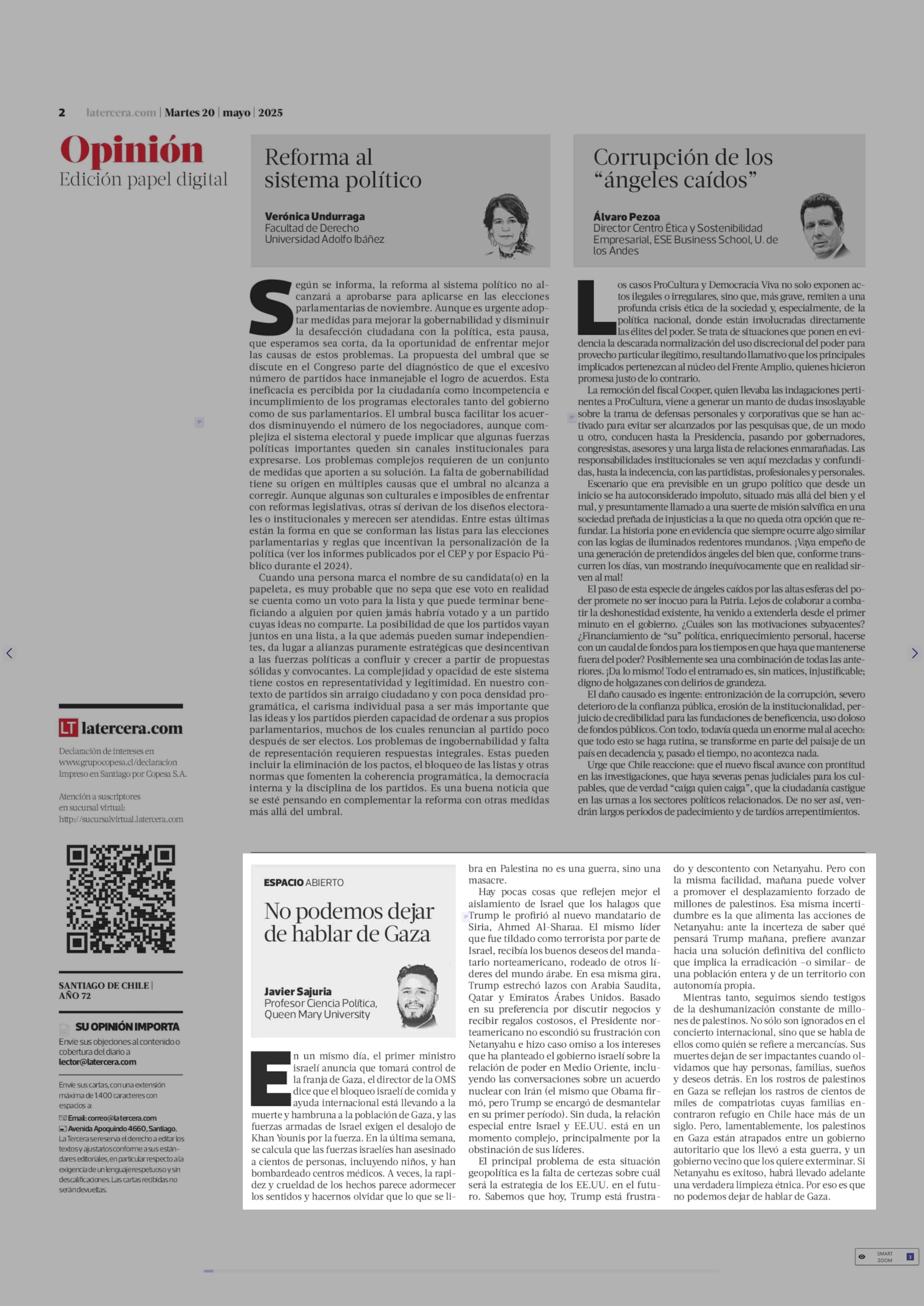 Columnas de Opinión: No podemos dejar de hablar de Gaza 20-05-2025 La Tercera |