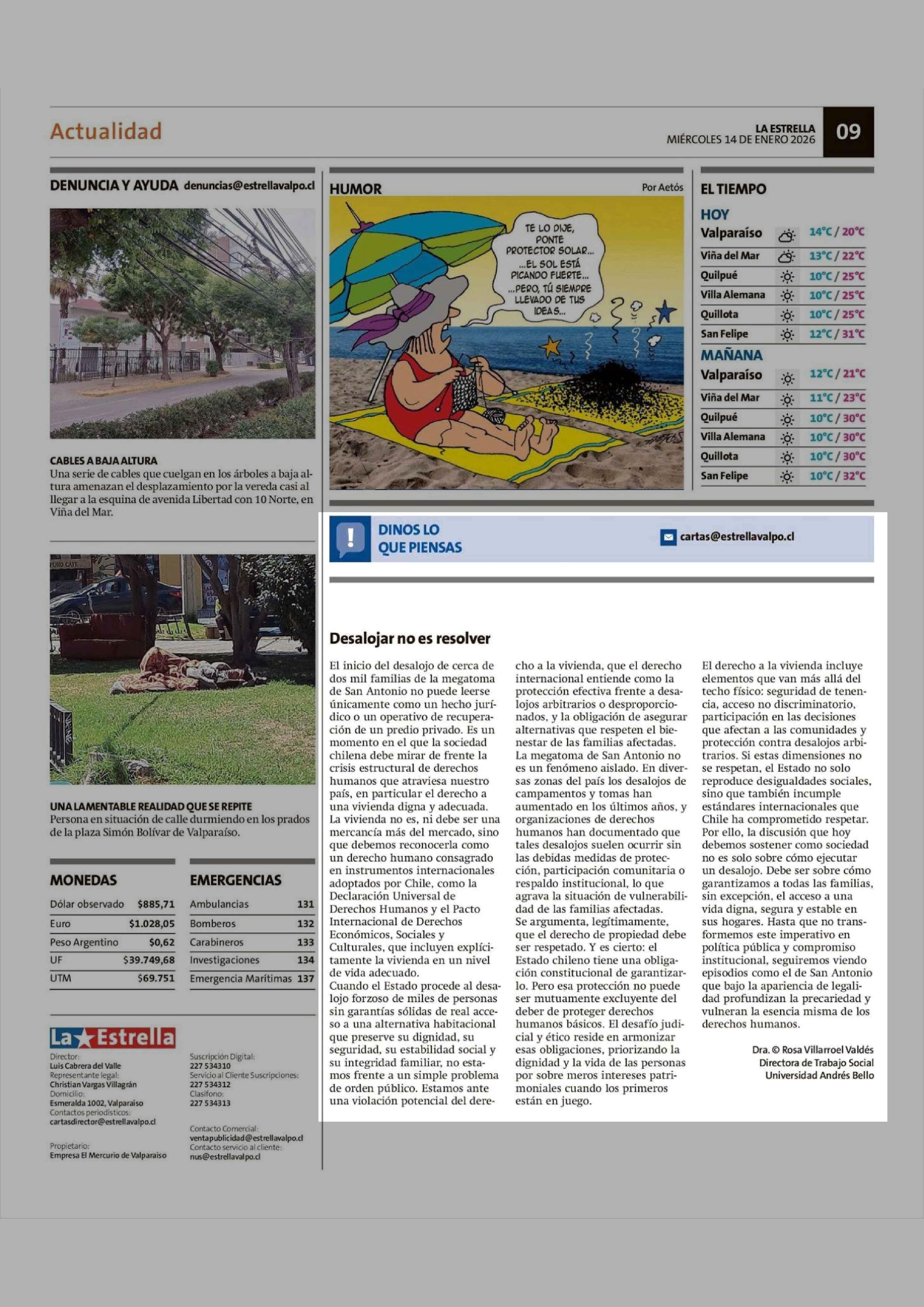 Cartas: Desalojar no es resolver 14-01-2026 La Estrella de Valparaíso |