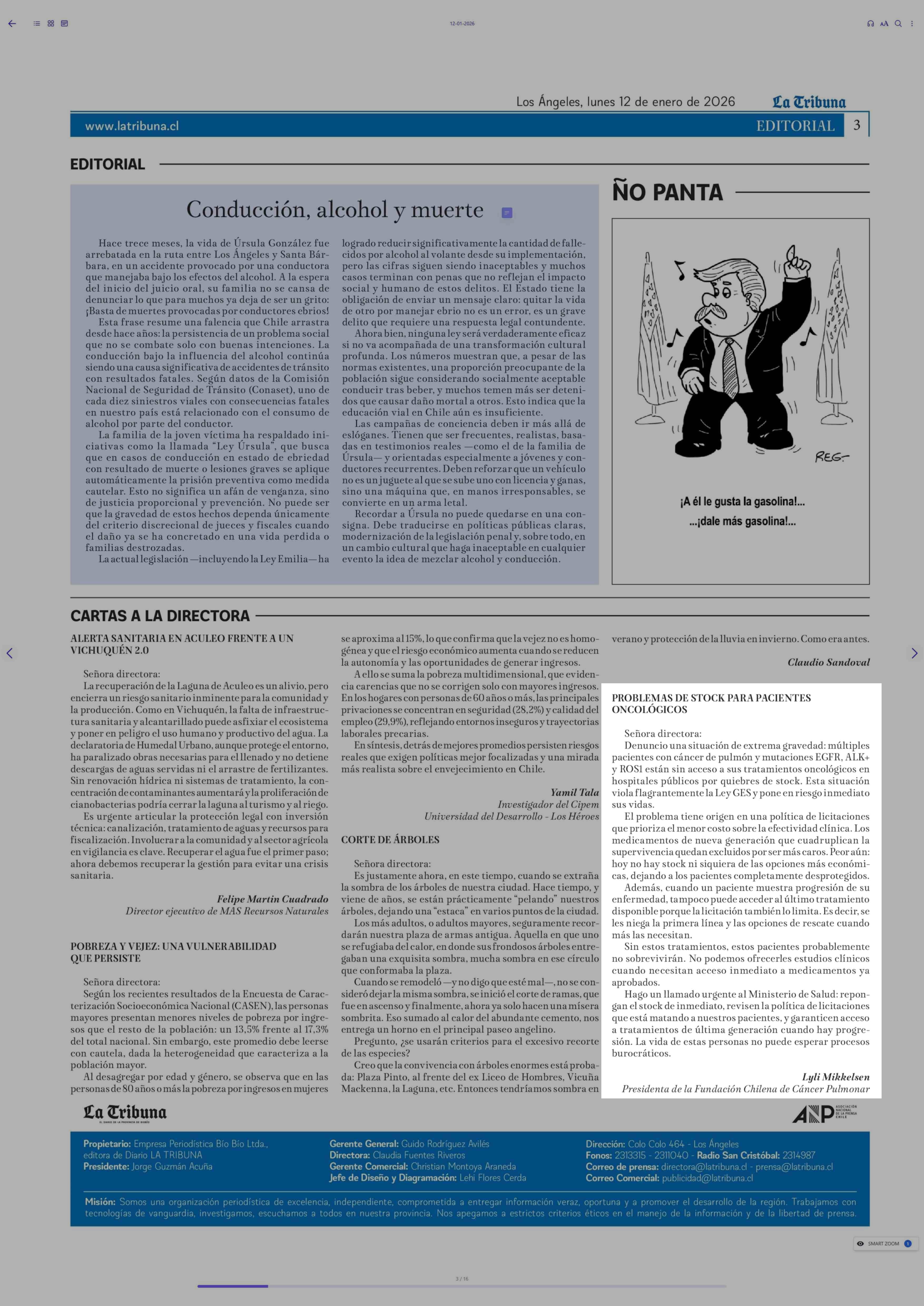 CARTAS: PROBLEMAS DE STOCK PARA PACIENTES ONCOLÓGICOS 12-01-2026 La Tribuna |