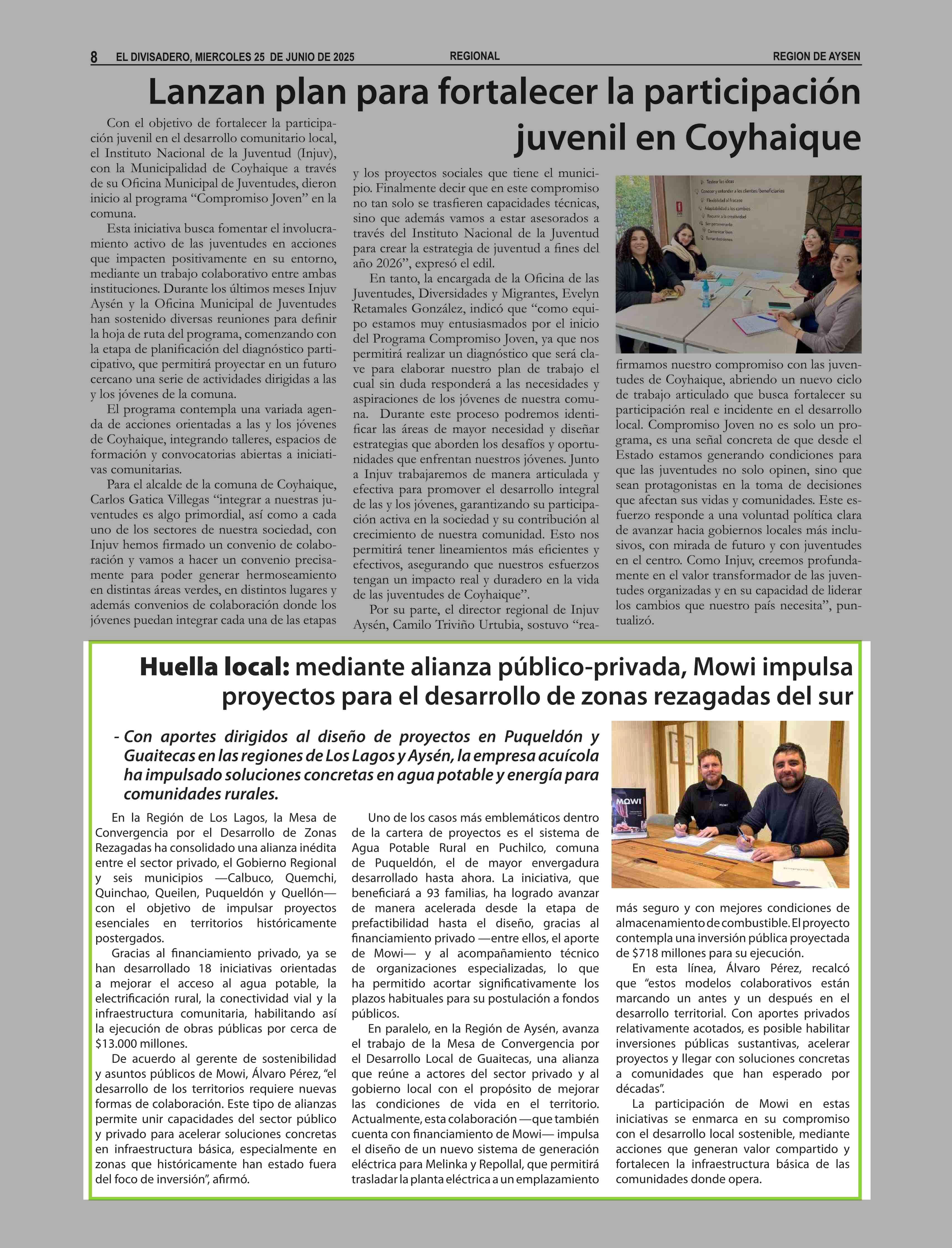Huella local: mediante alianza público-privada, Mowi impulsa proyectos para el desarrollo de zonas rezagadas del sur 25-06-2025 El Divisadero |