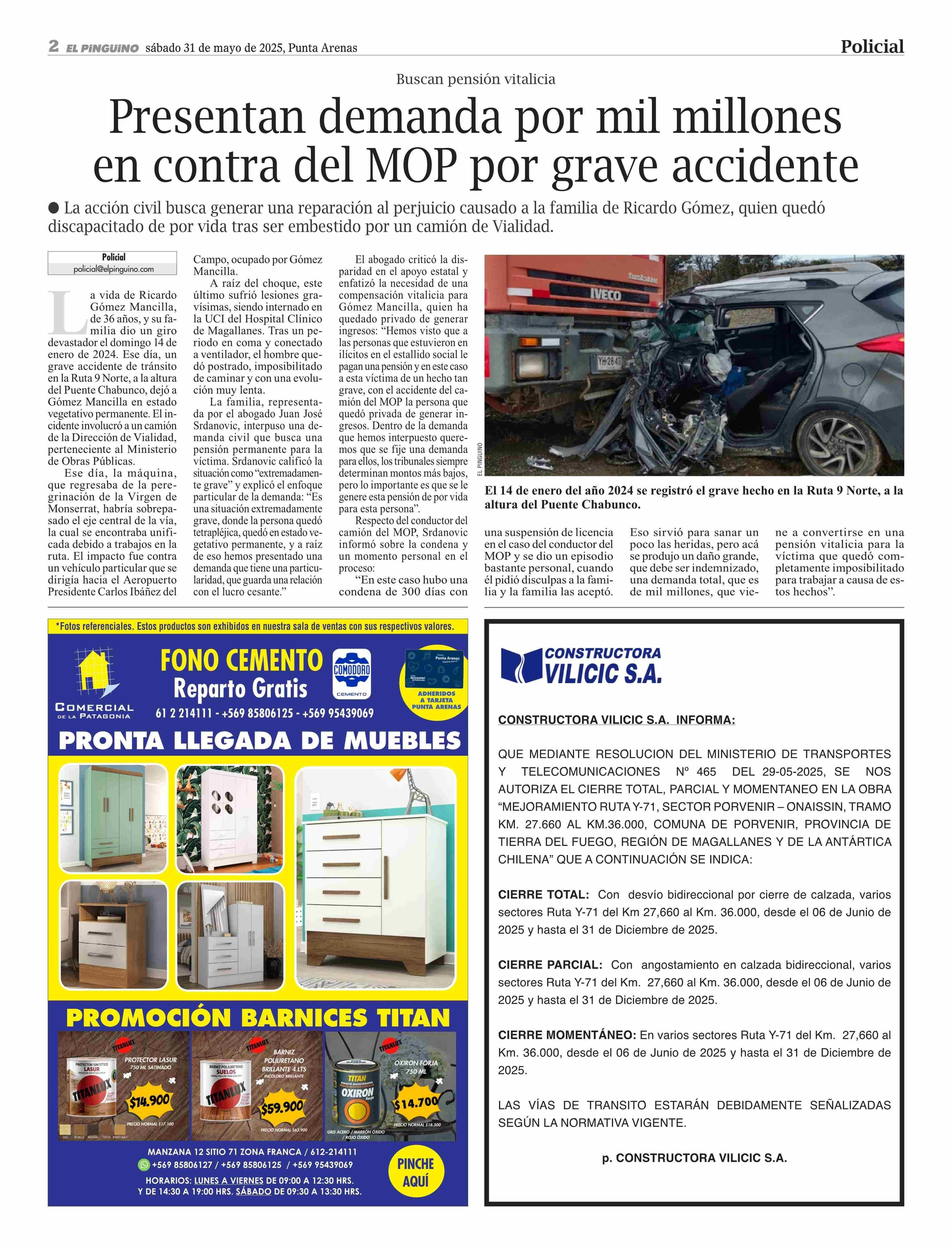 Presentan demanda por mil millones en contra del MOP por grave accidente 31-05-2025 El Pingüino |