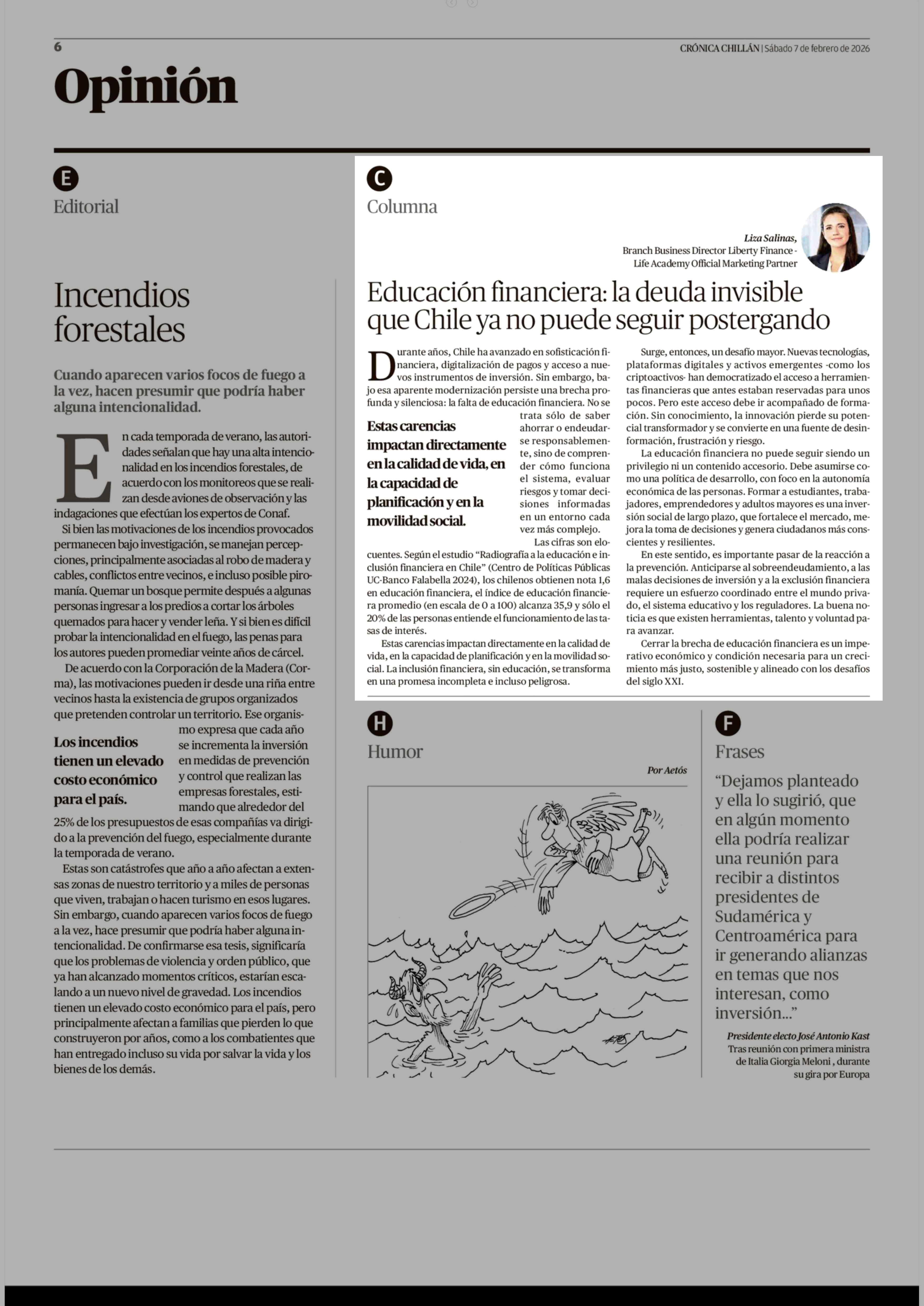 Columnas de Opinión: Educación financiera: la deuda invisible que Chile ya no puede seguir postergando 07-02-2026 Crónica de Chillán |