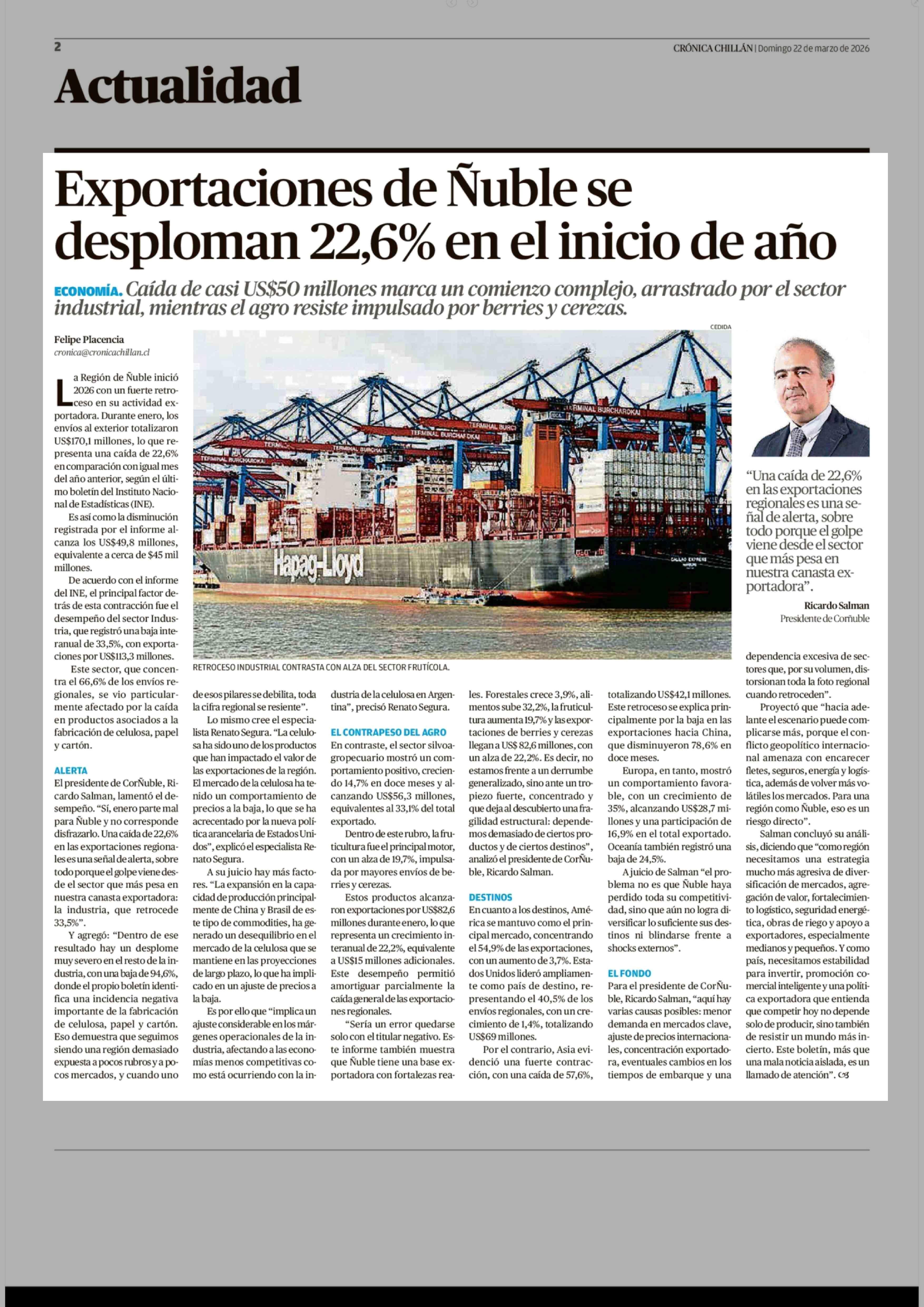 Exportaciones de Ñuble se desploman 22,6% en el inicio de año 22-03-2026 Crónica de Chillán |