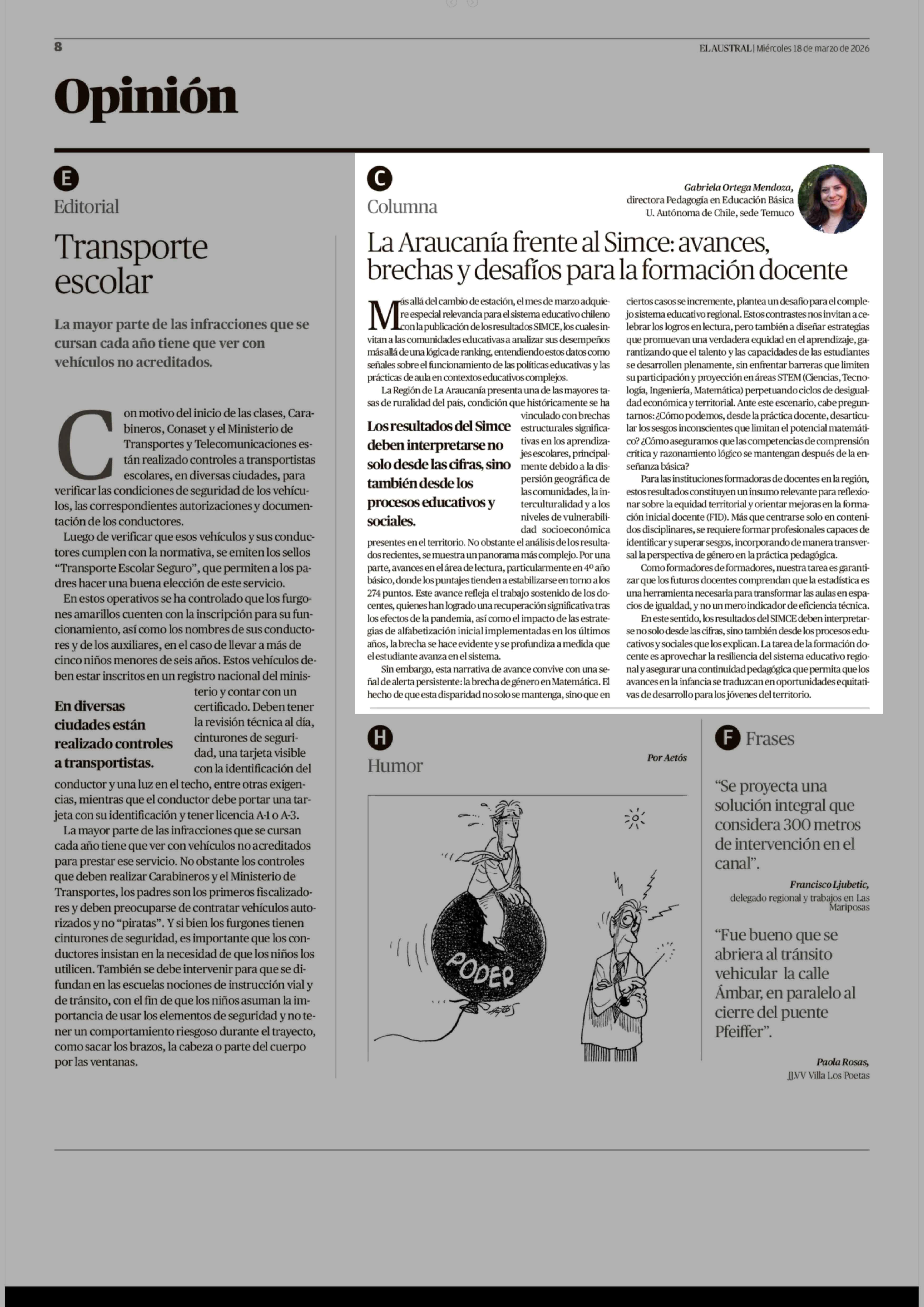 Columnas de Opinión: La Araucanía frente al Simce: avances, brechas y desafíos para la formación docente 18-03-2026 El Austral de la Araucanía |