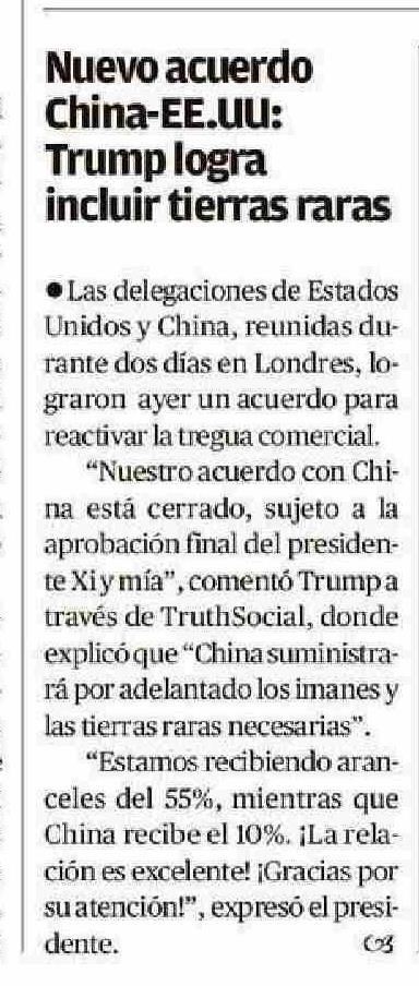 | Título: | Nuevo acuerdo China-EE.UU: Trump logra incluir tierras raras |