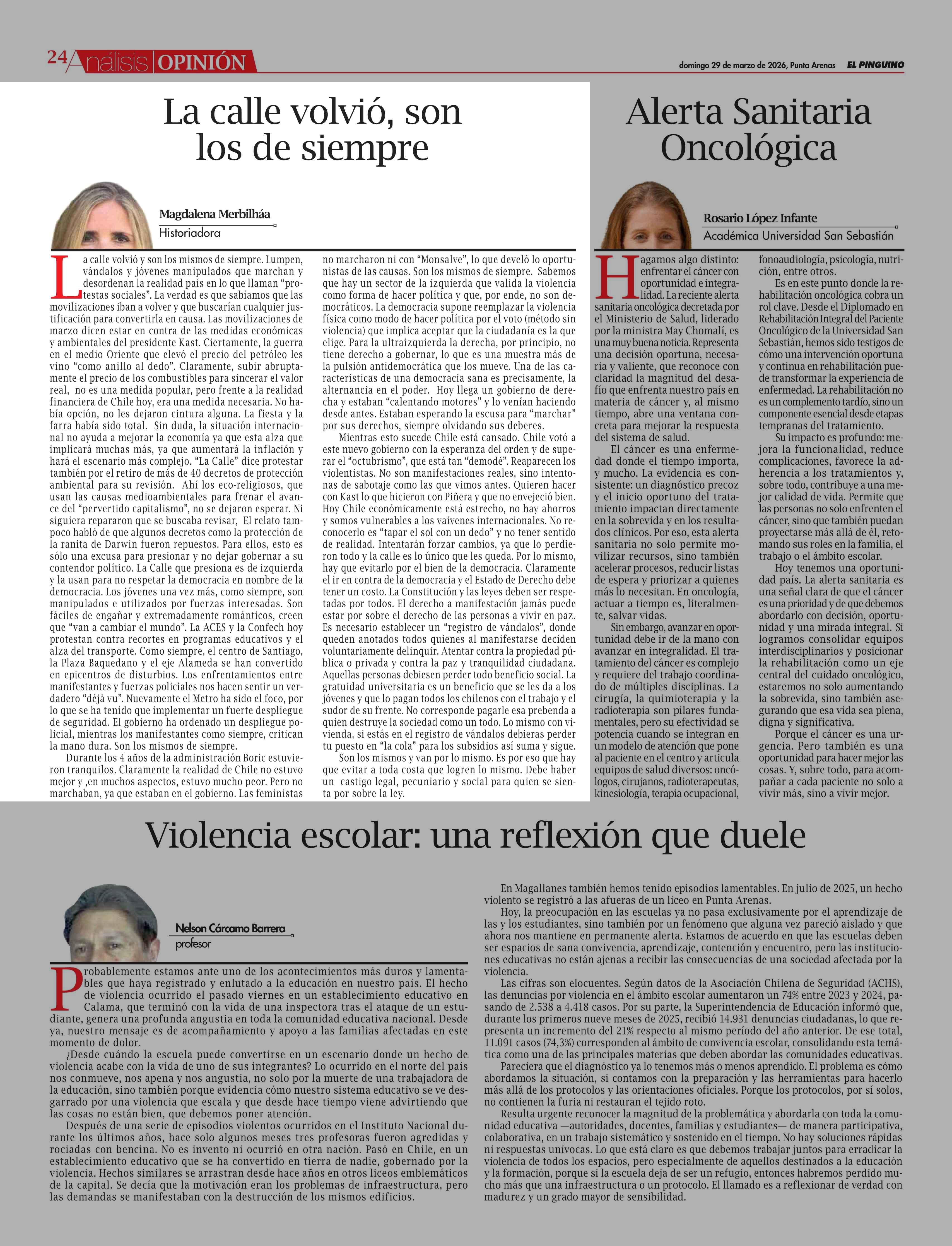 COLUMNAS DE OPINIÓN: La calle volvió, son los de siempre 29-03-2026 El Pingüino |