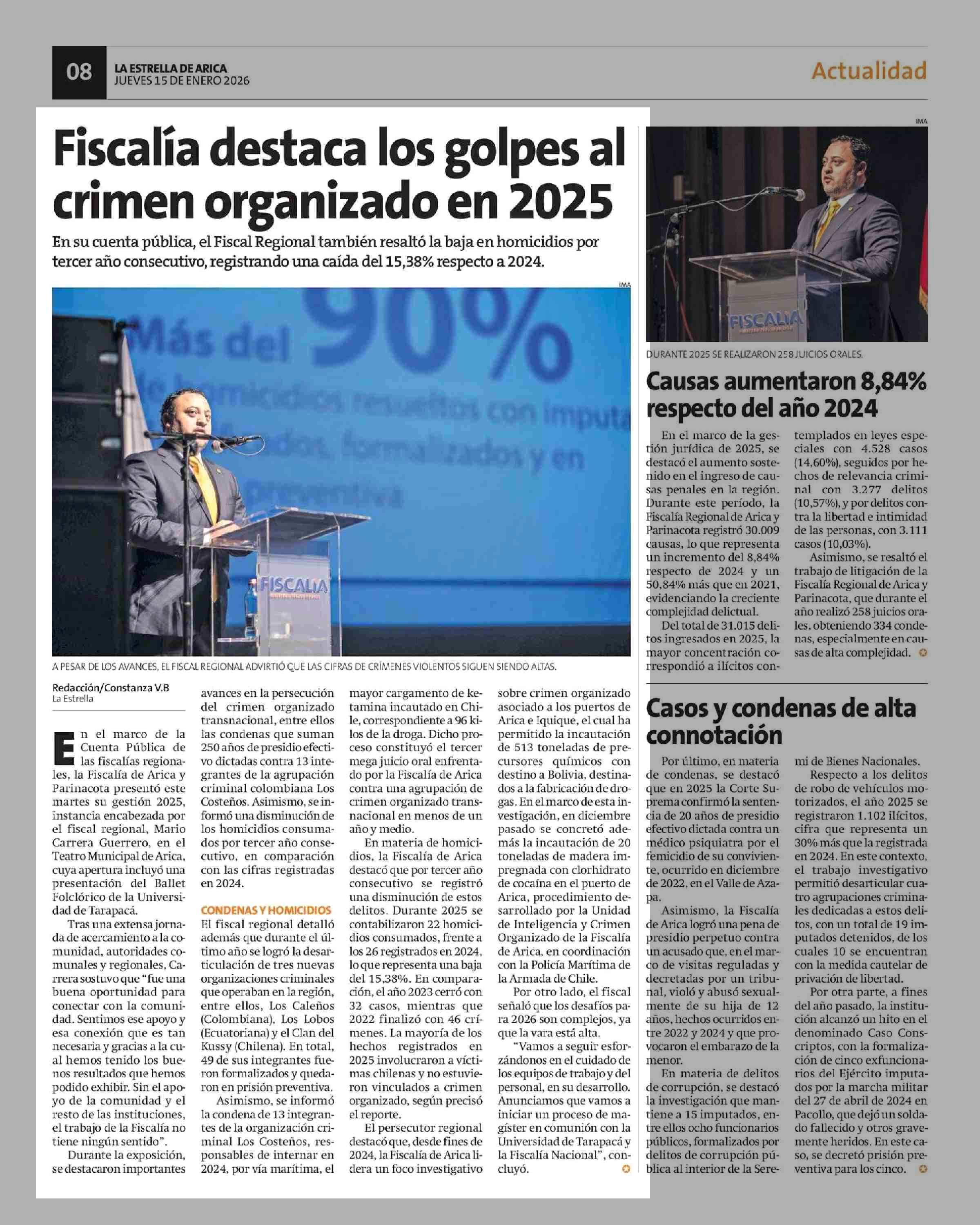 Fiscalía destaca los golpes al crimen organizado en 2025 15-01-2026 La Estrella de Arica |