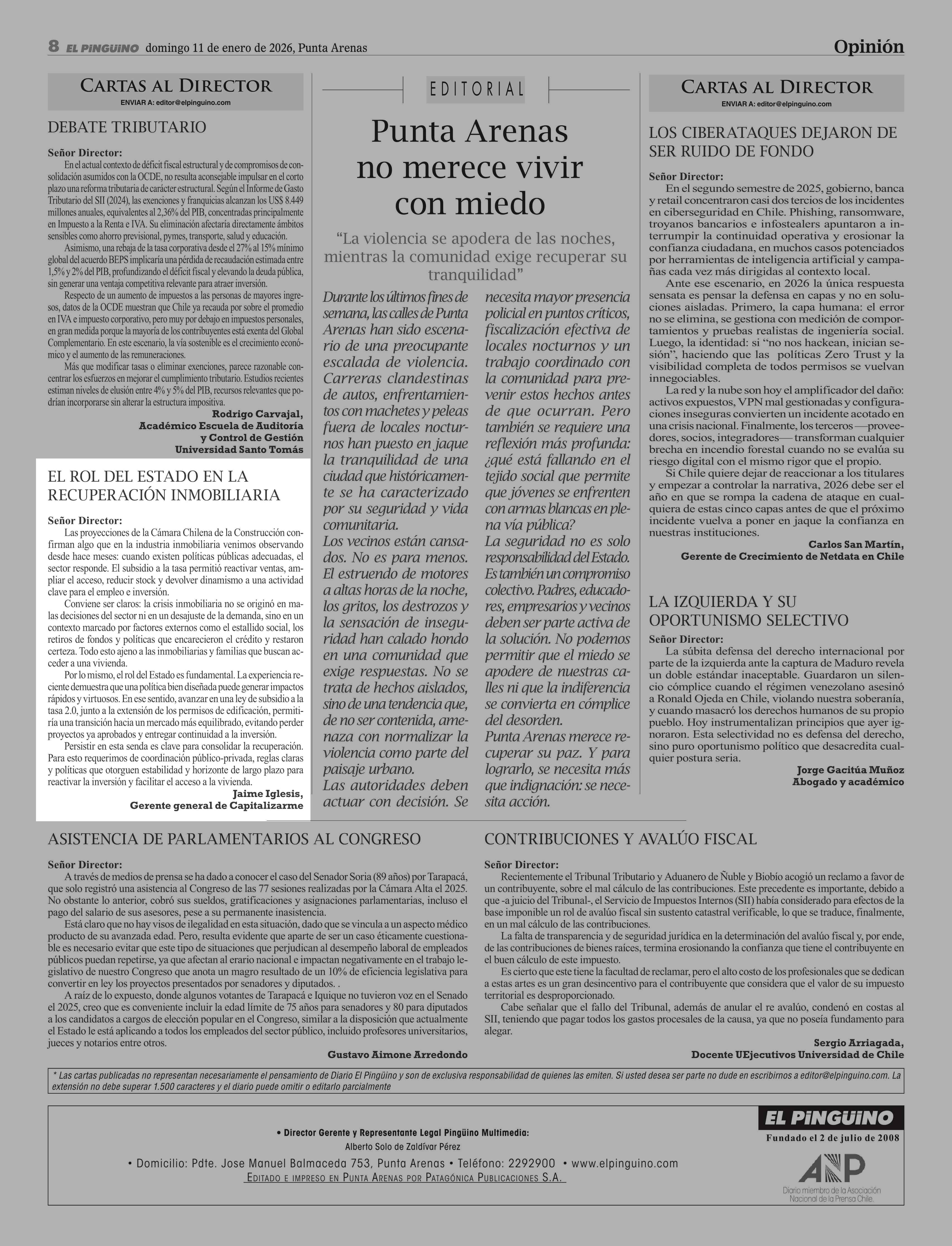 Cartas: EL ROL DEL ESTADO EN LA RECUPERACIÓN INMOBILIARIA 11-01-2026 El Pingüino |
