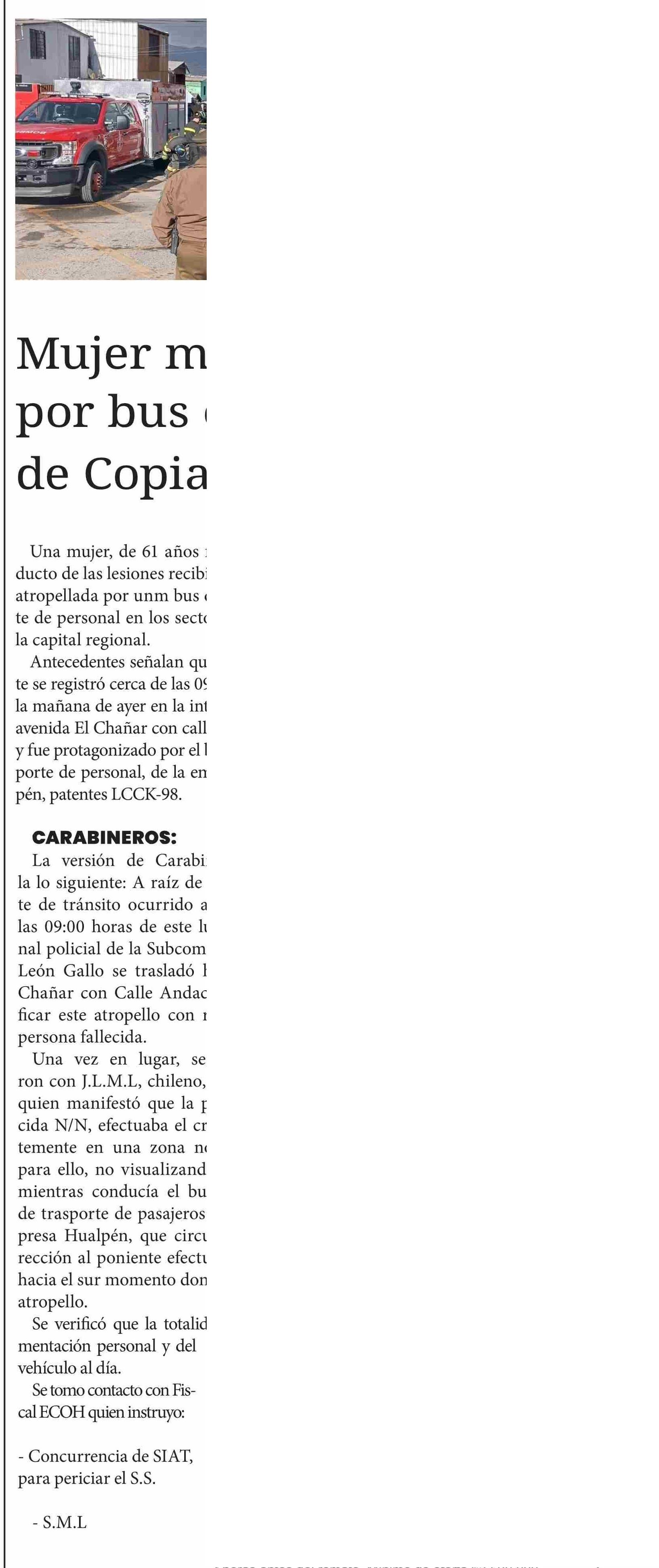 Título: Mujer muere atropellada por bus en sectores altos de Copiapó