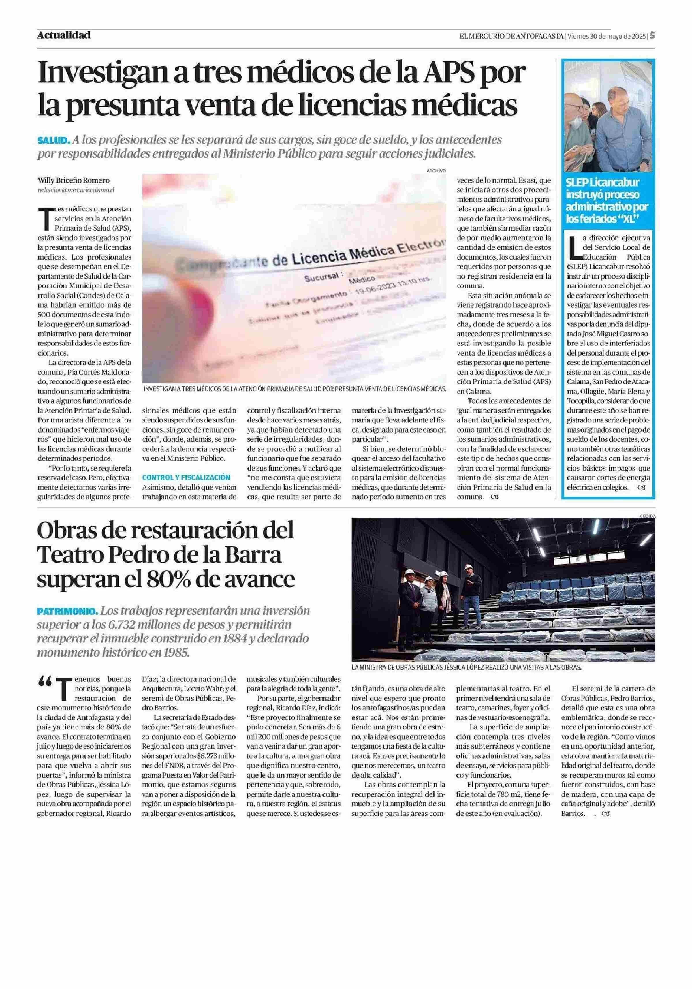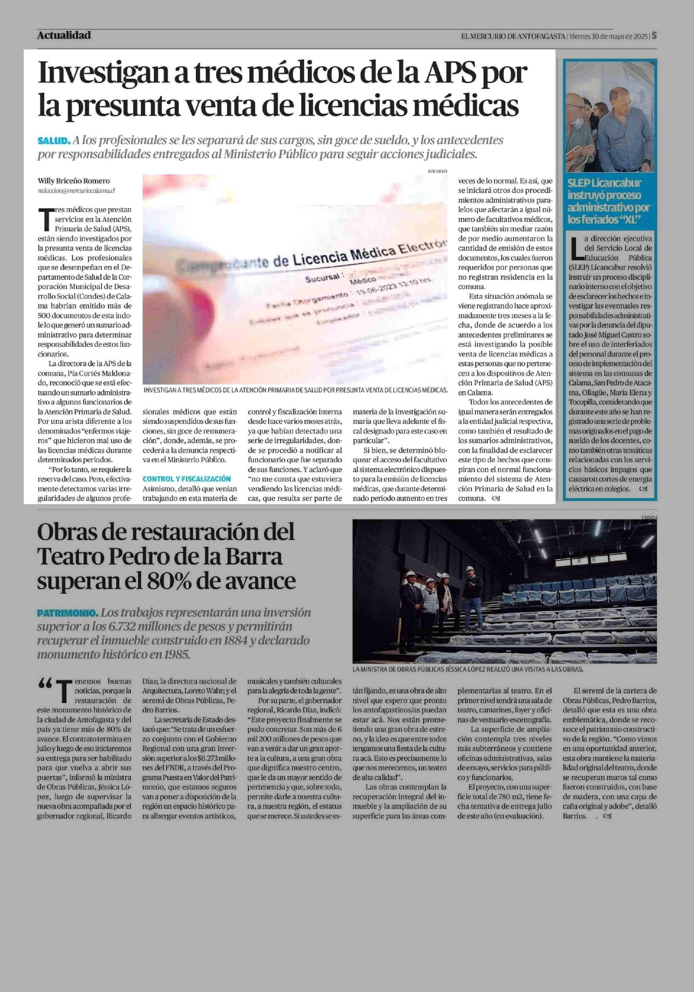 Investigan a tres médicos de la APS por la presunta venta de licencias médicas 30-05-2025 El Mercurio de Antofagasta |