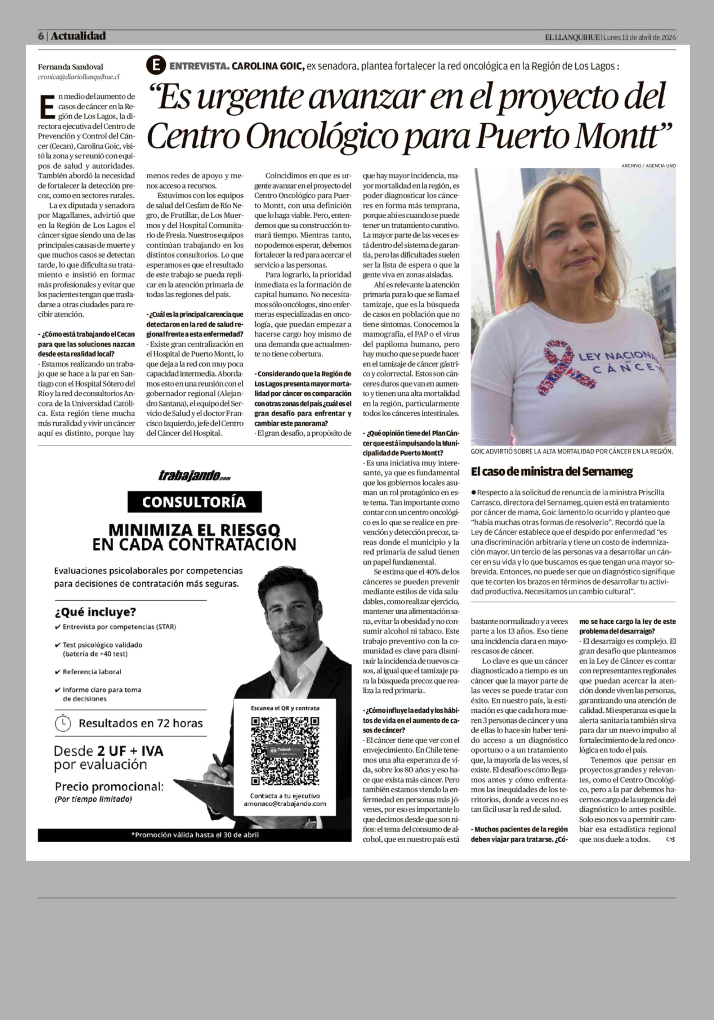 "Es urgente avanzar en el proyecto del Centro Oncológico para Puerto Montt" 13-04-2026 El Llanquihue |