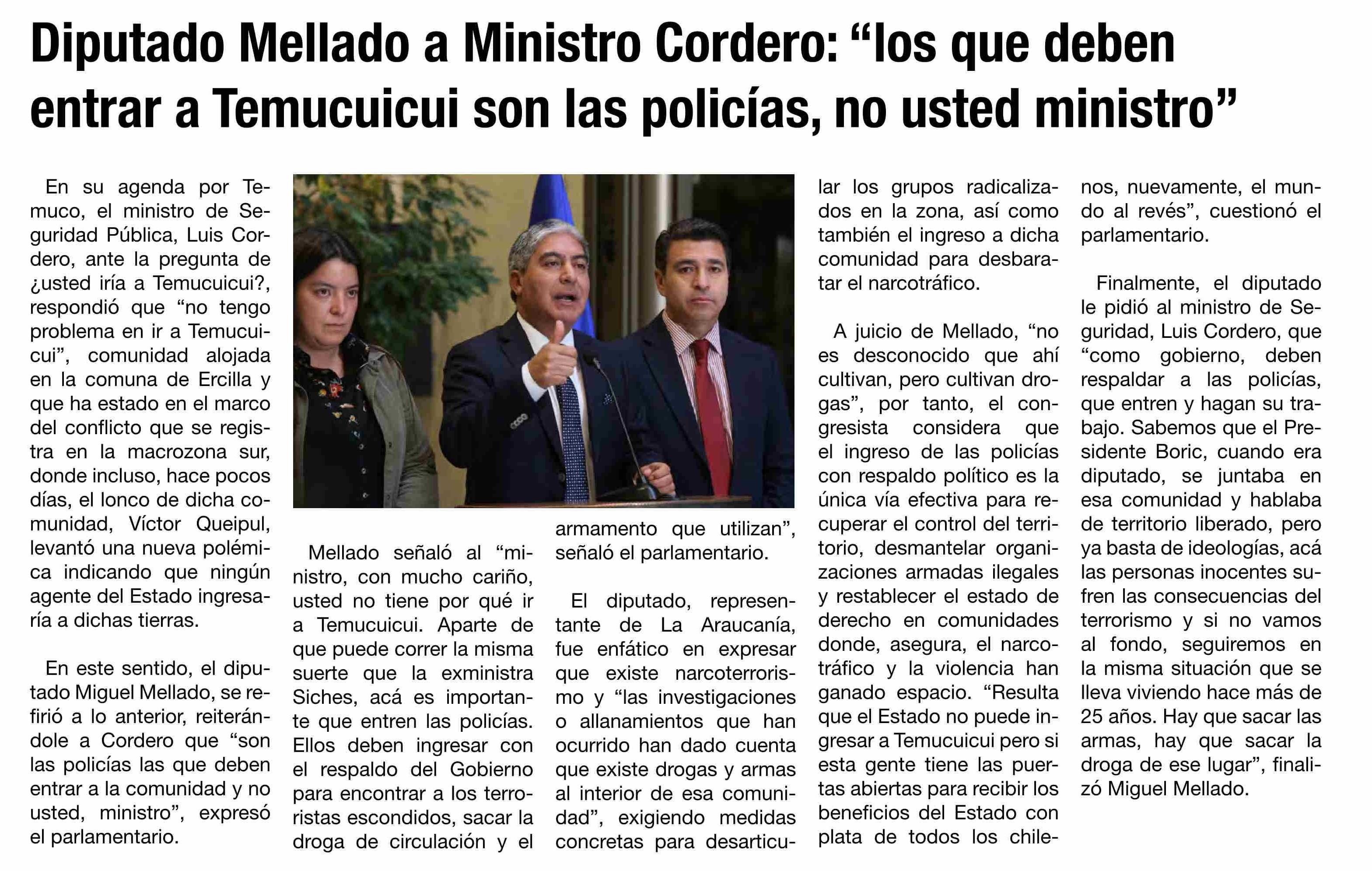 | Título: | Diputado Mellado a Ministro Cordero: “los que deben entrar a Temucuicui son las policías, no usted ministro” |