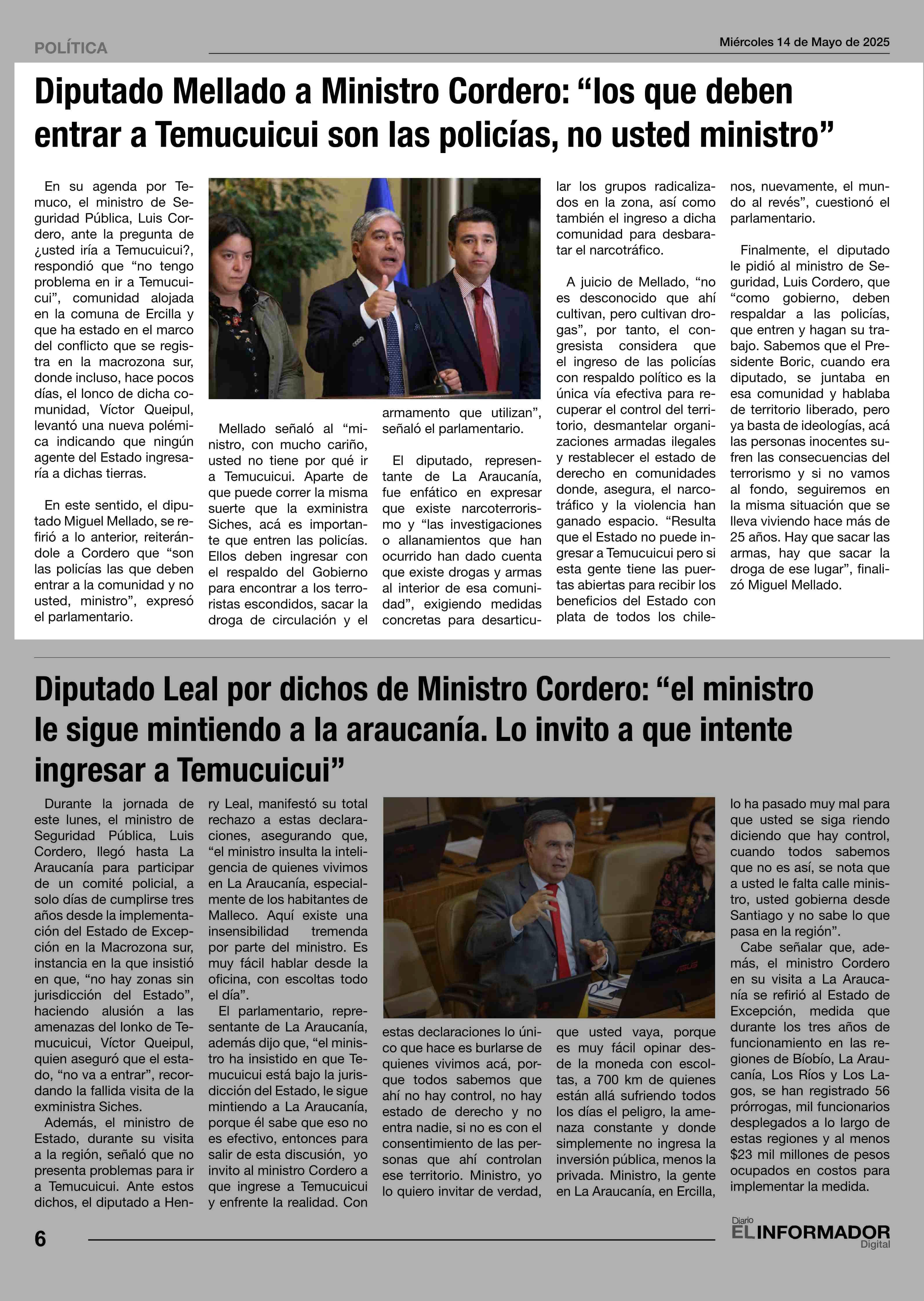Diputado Mellado a Ministro Cordero: “los que deben entrar a Temucuicui son las policías, no usted ministro” 14-05-2025 El Informador |