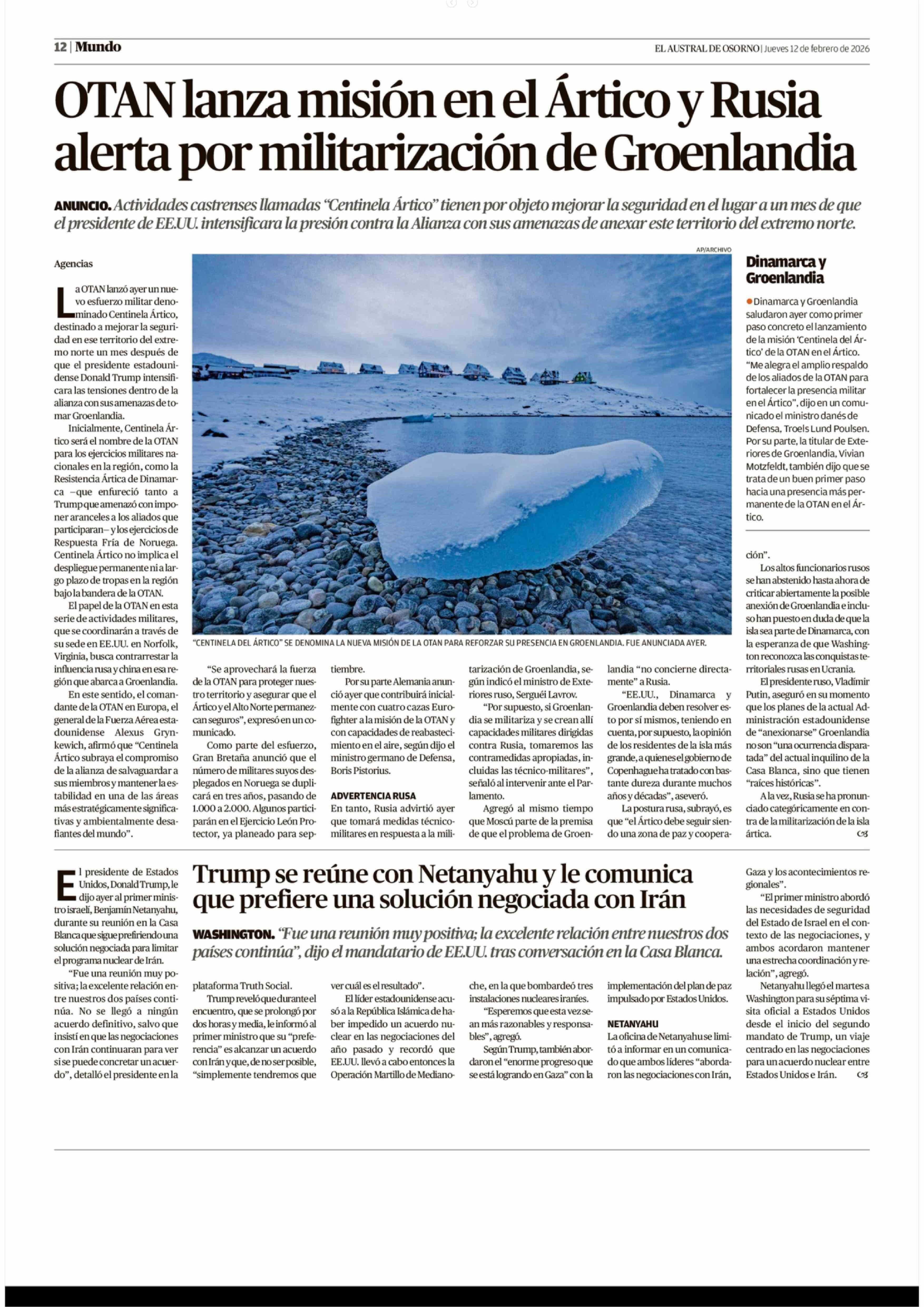 OTAN lanza misión en el Ártico y Rusia alerta por militarización de Groenlandia 12-02-2026 El Austral de Osorno |
