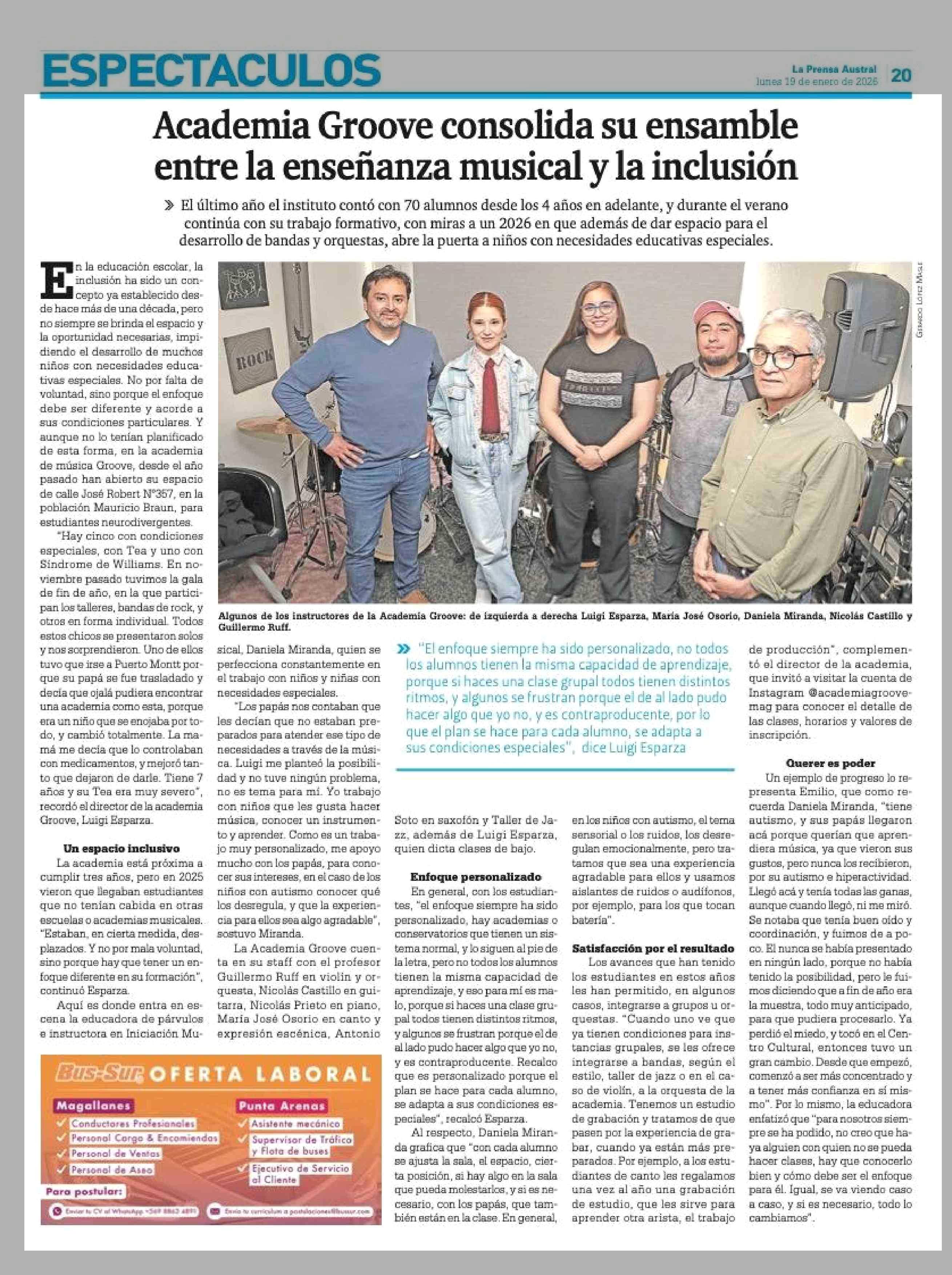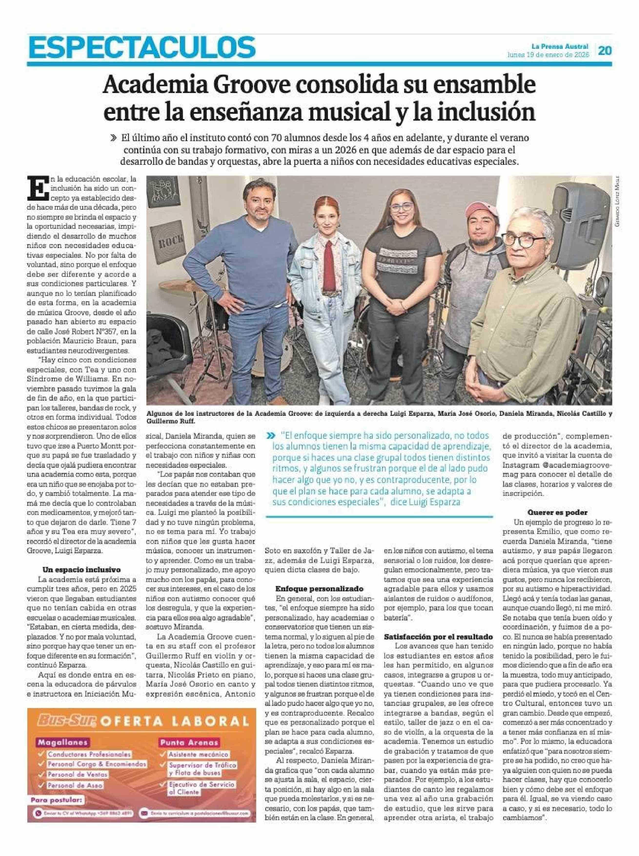 Academia Groove consolida su ensamble entre la enseñanza musical y la inclusión 19-01-2026 La Prensa Austral |