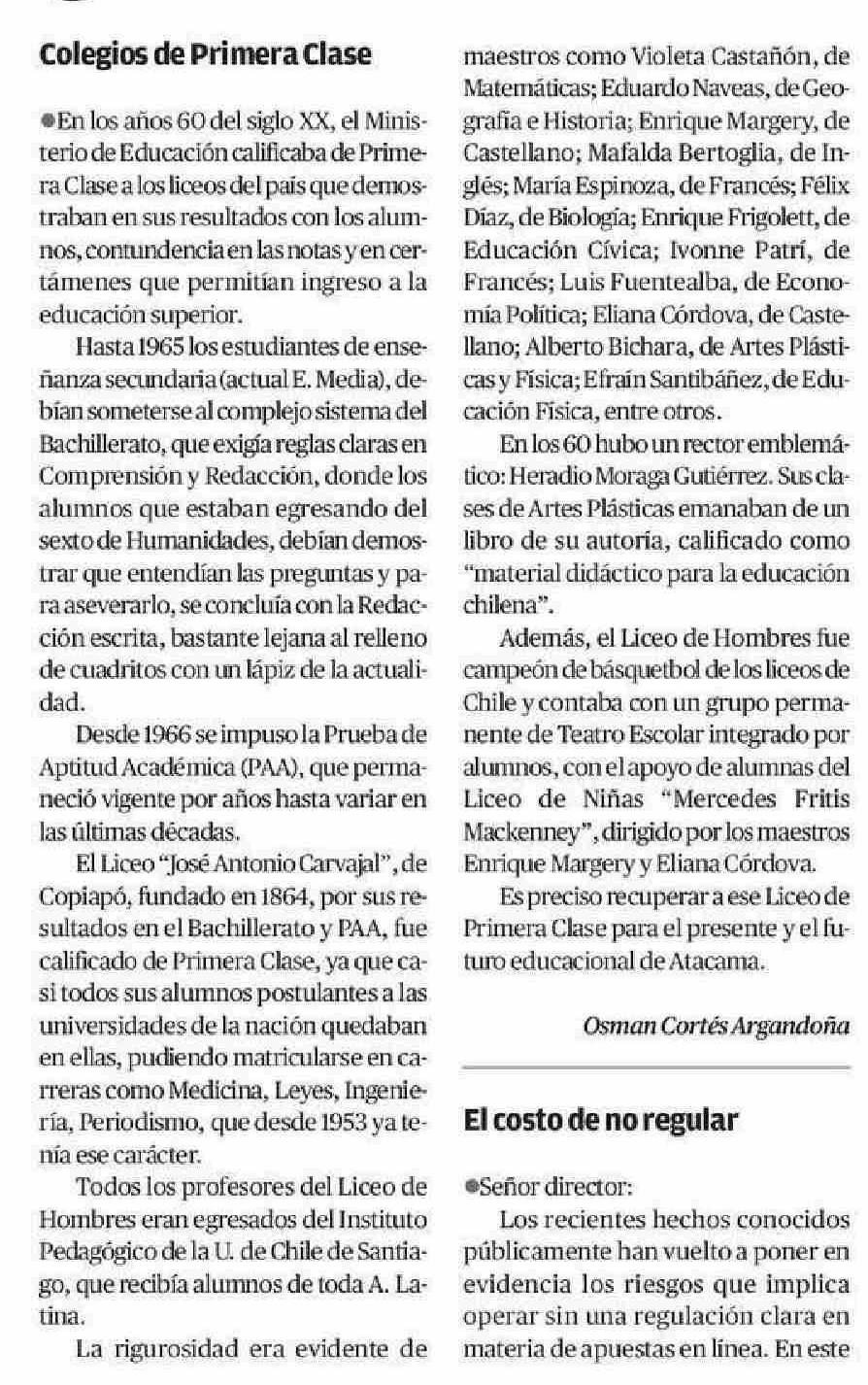 CARTAS: Colegios de Primera Clase 20-05-2025 El Diario de Atacama |