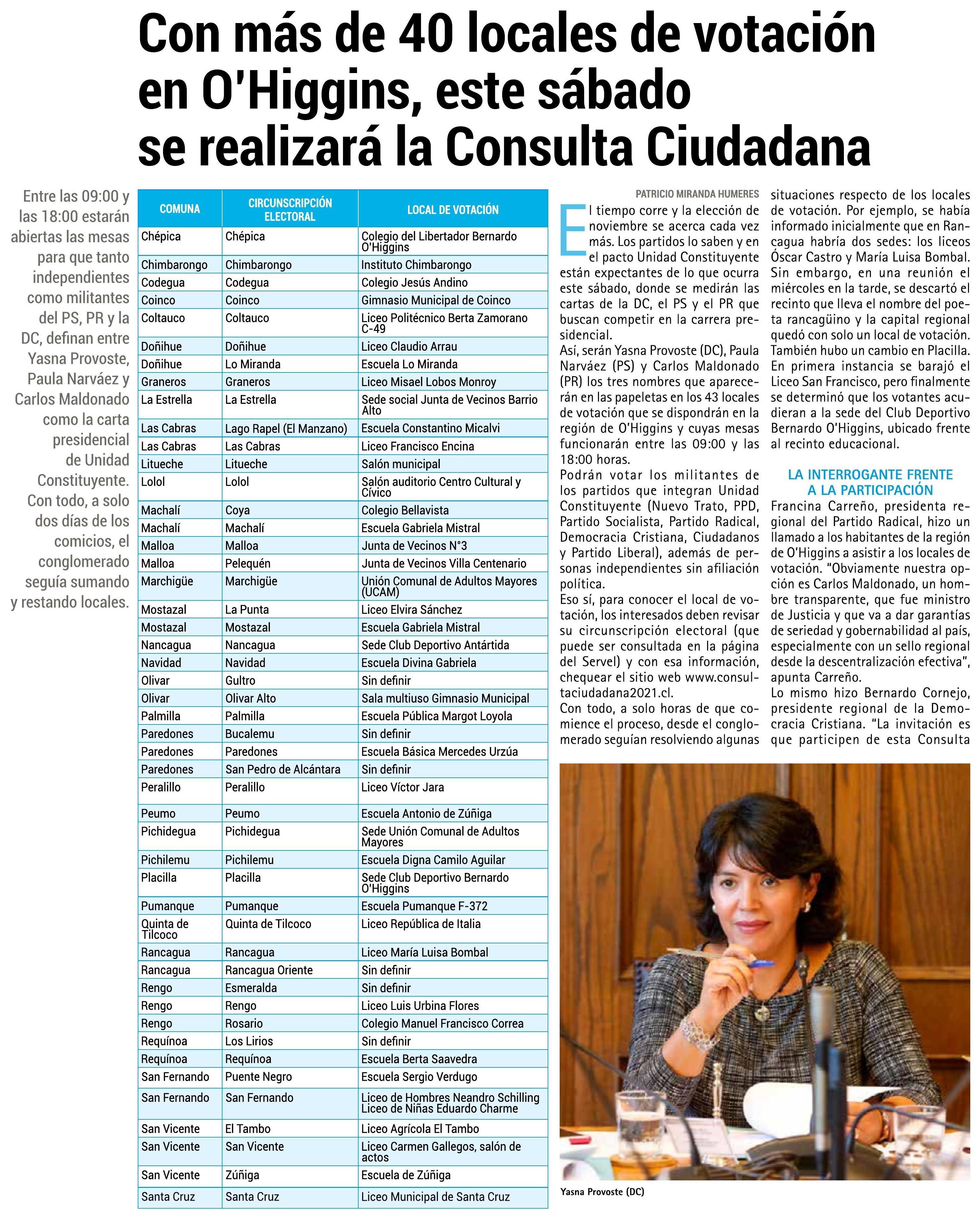 | Título: | Con más de 40 locales de votación en O'Higgins, este sábado se realizará la Consulta Ciudadana |