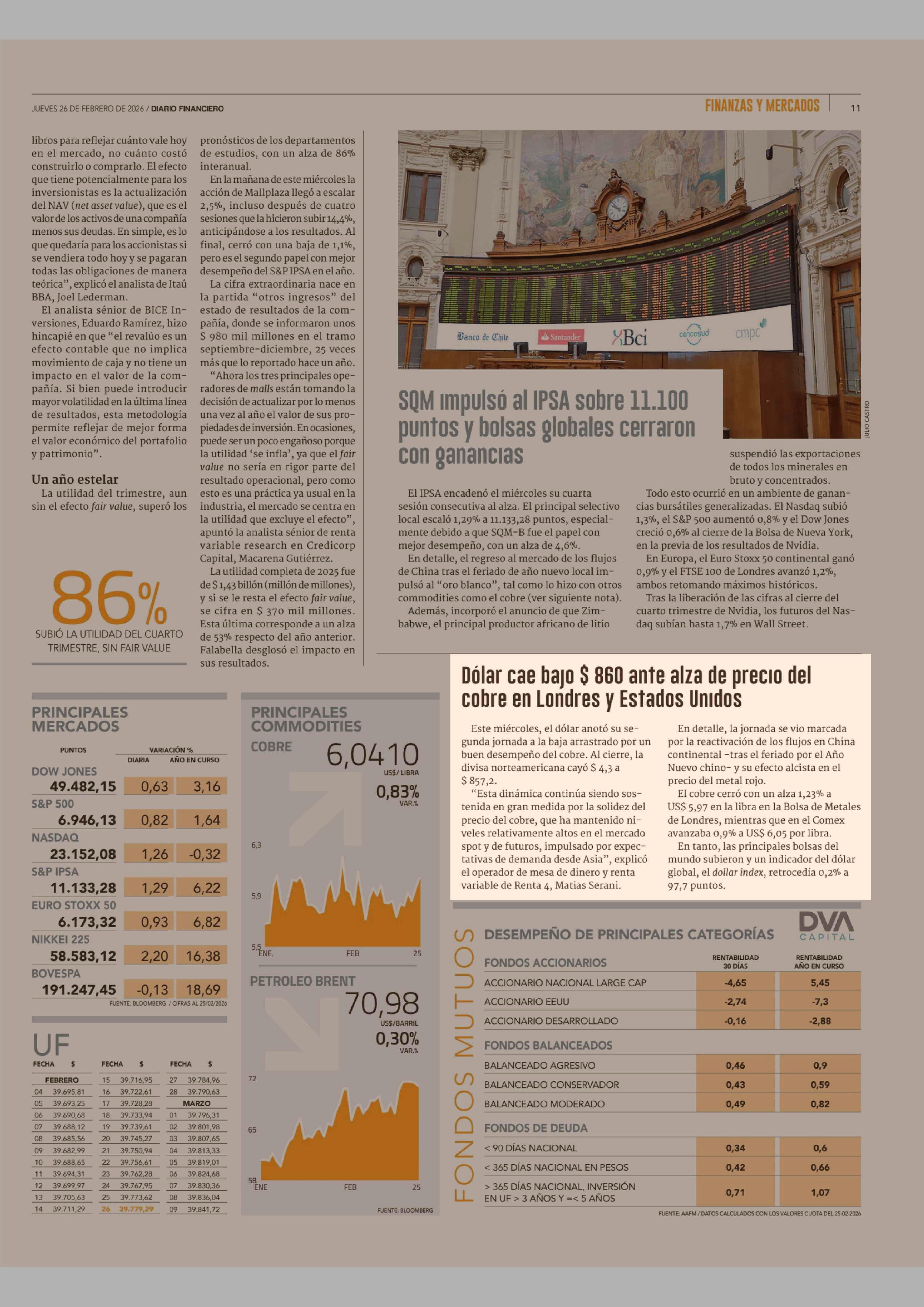Dólar cae bajo $ 860 ante alza de precio del cobre en Londres y Estados Unidos 26-02-2026 Diario Financiero |