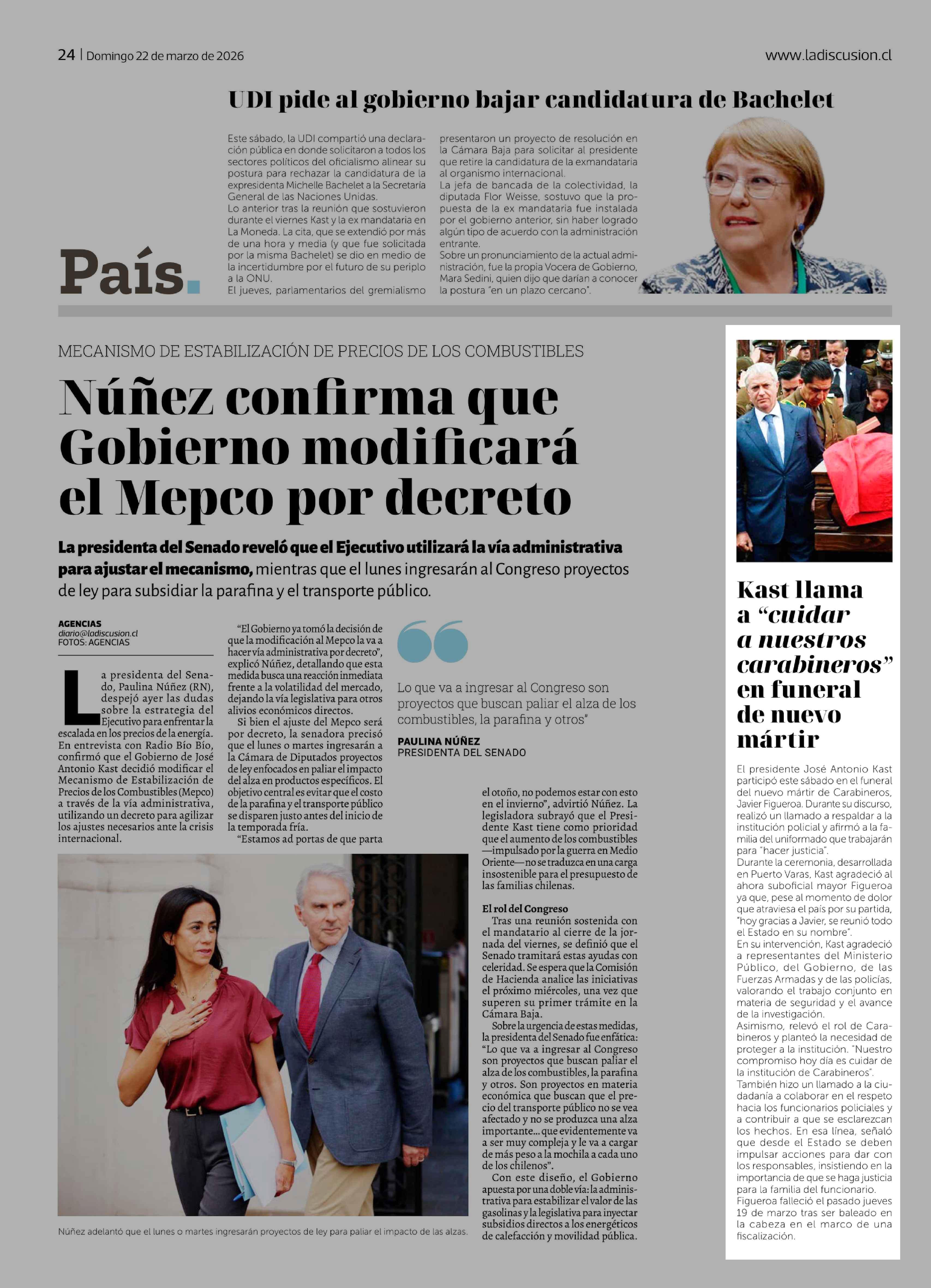 Kast llama a "cuidar a nuestros carabineros" en funeral de nuevo mártir 22-03-2026 La Discusión |
