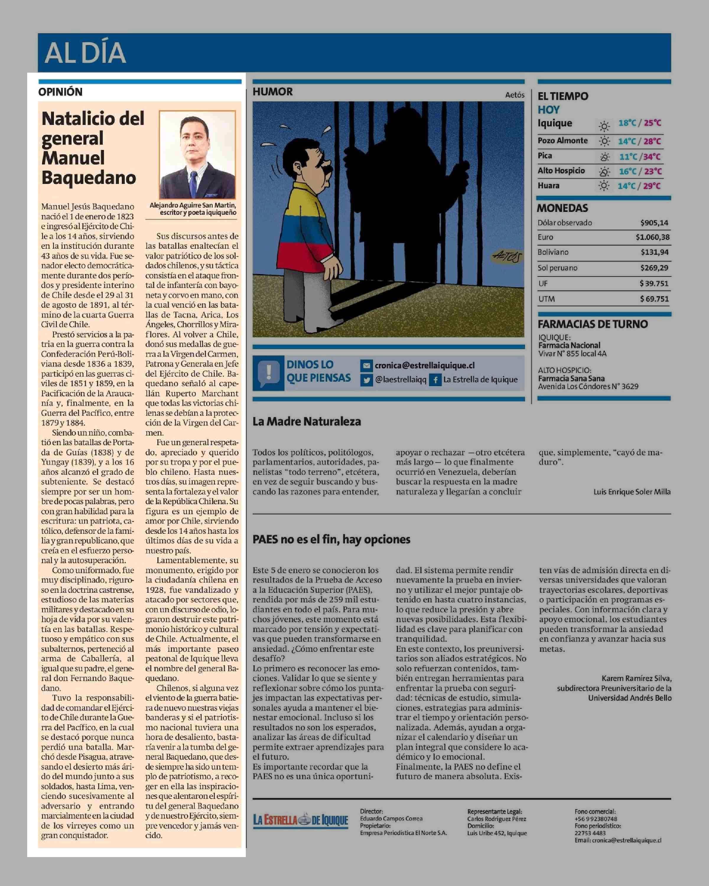 Columnas de Opinión: Natalicio del general Manuel Baquedano 06-01-2026 La Estrella de Iquique |