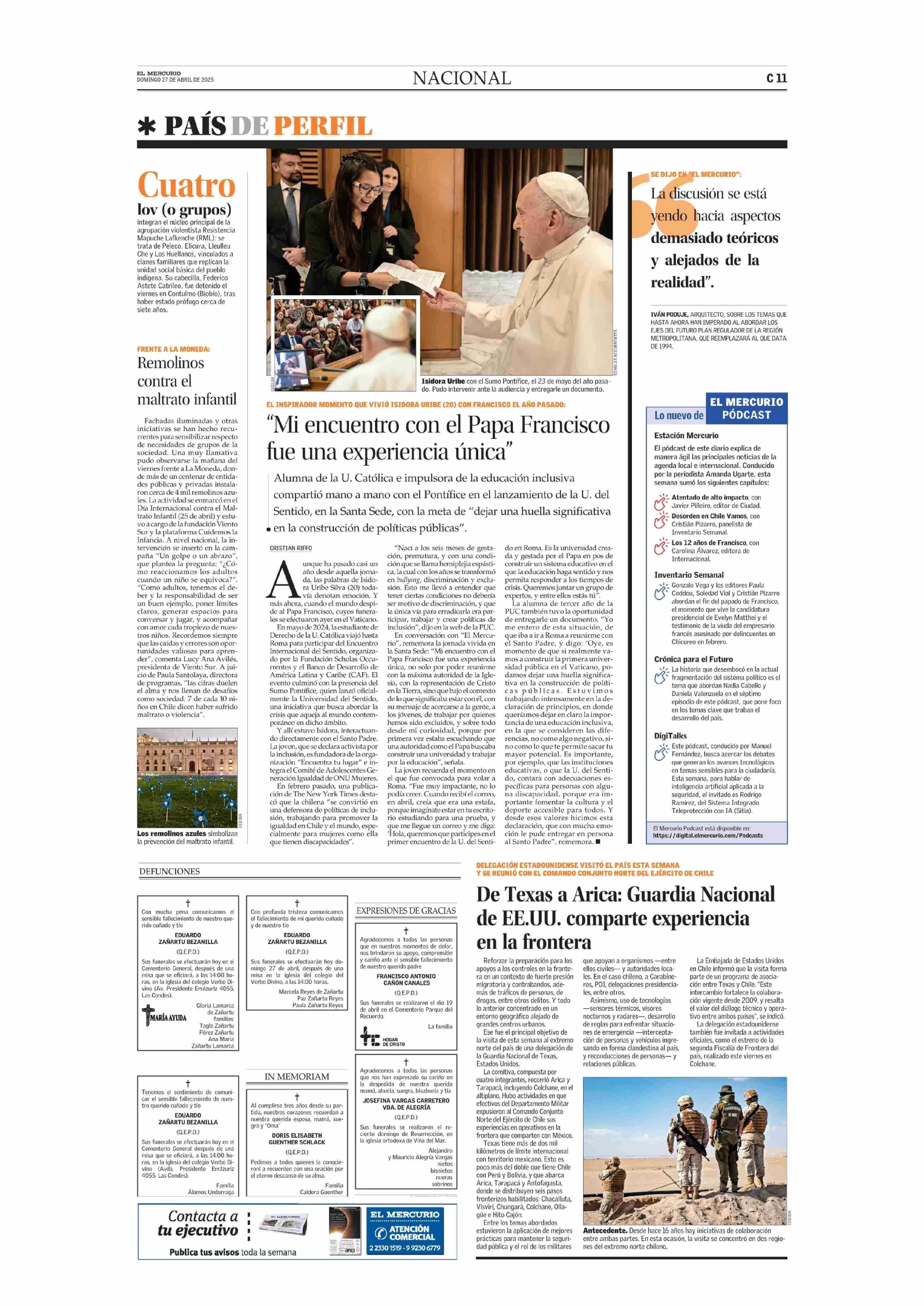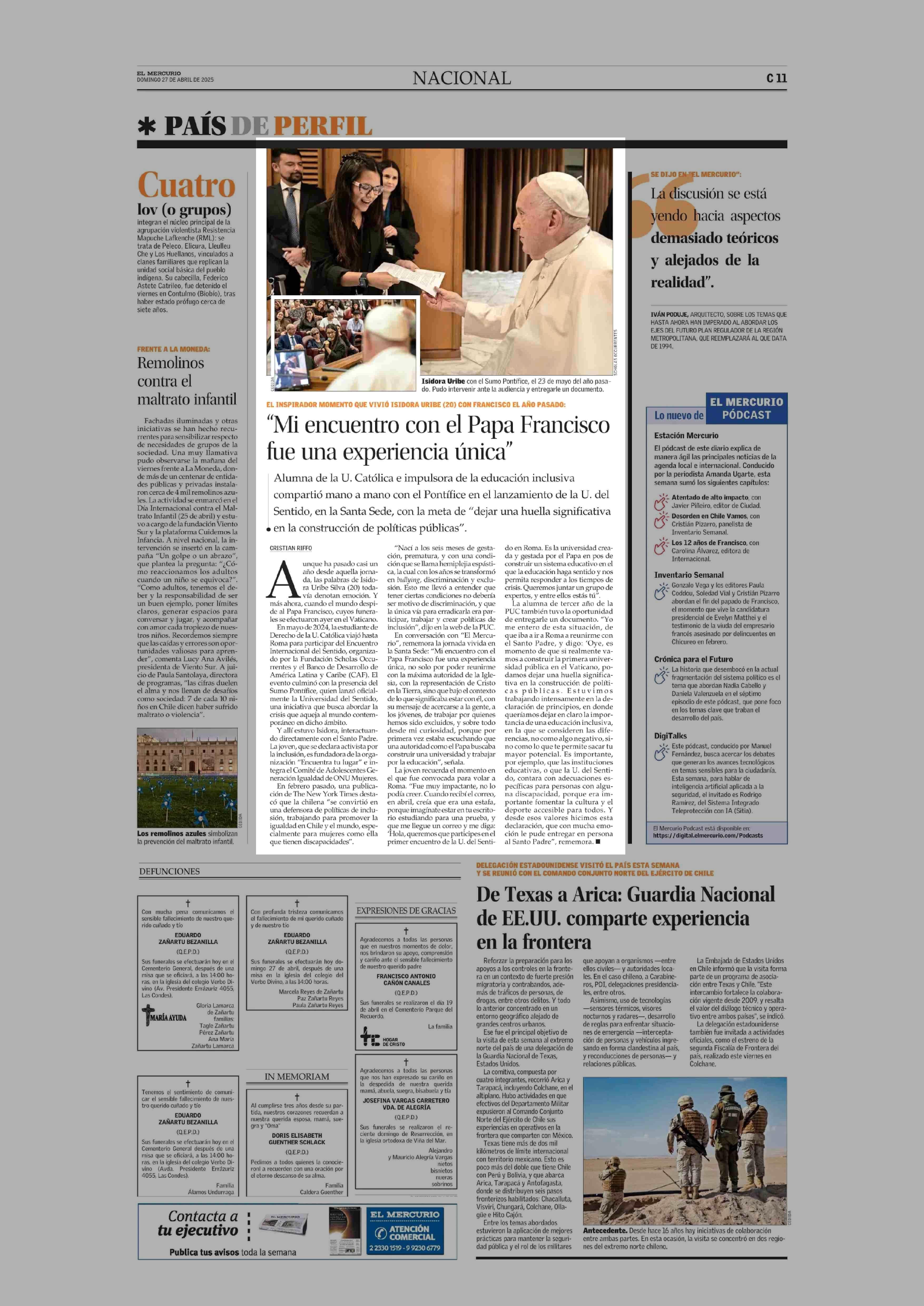 “Mi encuentro con el Papa Francisco fue una experiencia única” 27-04-2025 El Mercurio |