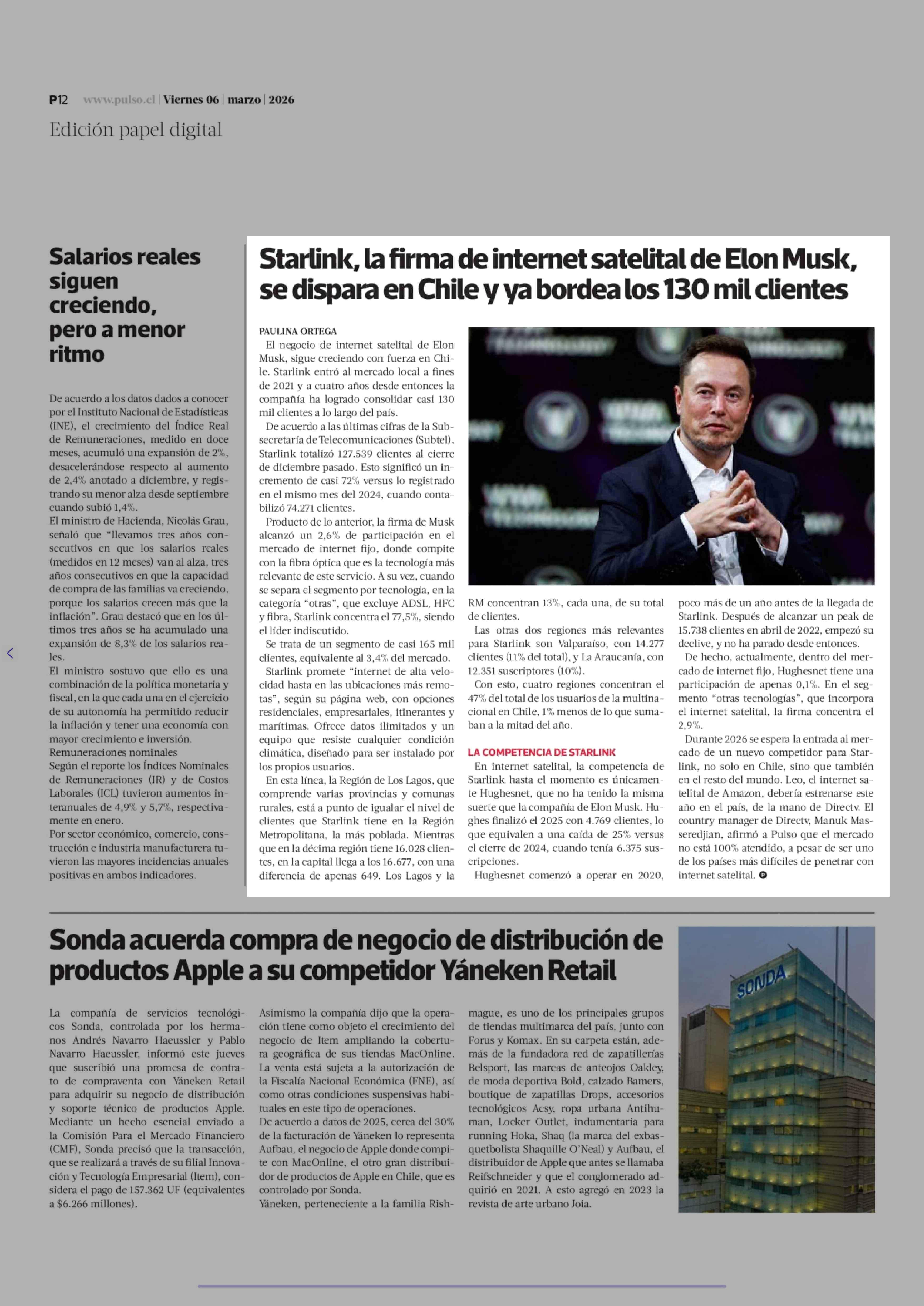 Starlink, la firma de internet satelital de Elon Musk, se dispara en Chile y ya bordea los 130 mil clientes 06-03-2026 La Tercera |