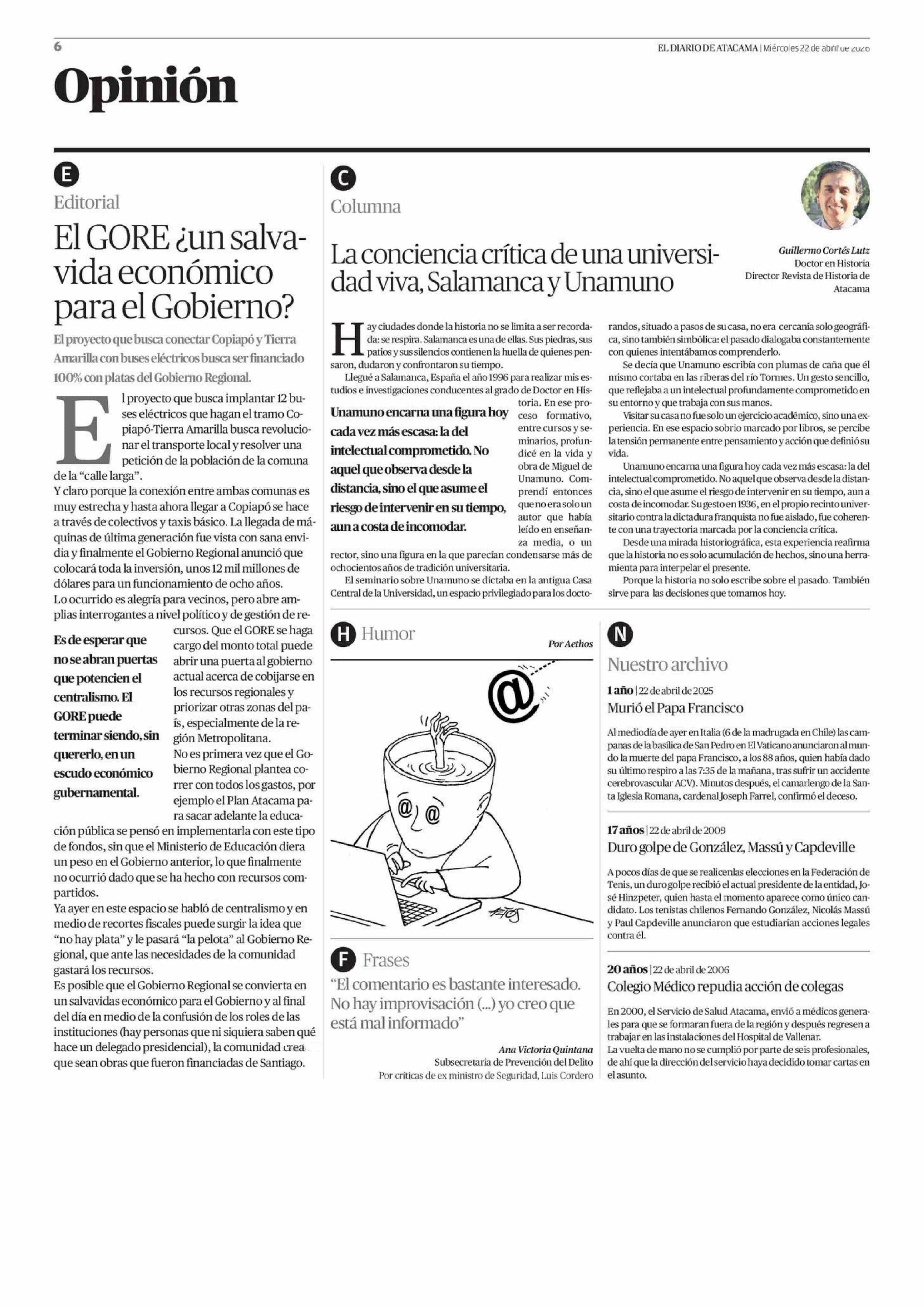 Editorial: El GORE ¿un salvavida económico para el Gobierno? 22-04-2026 El Diario de Atacama |