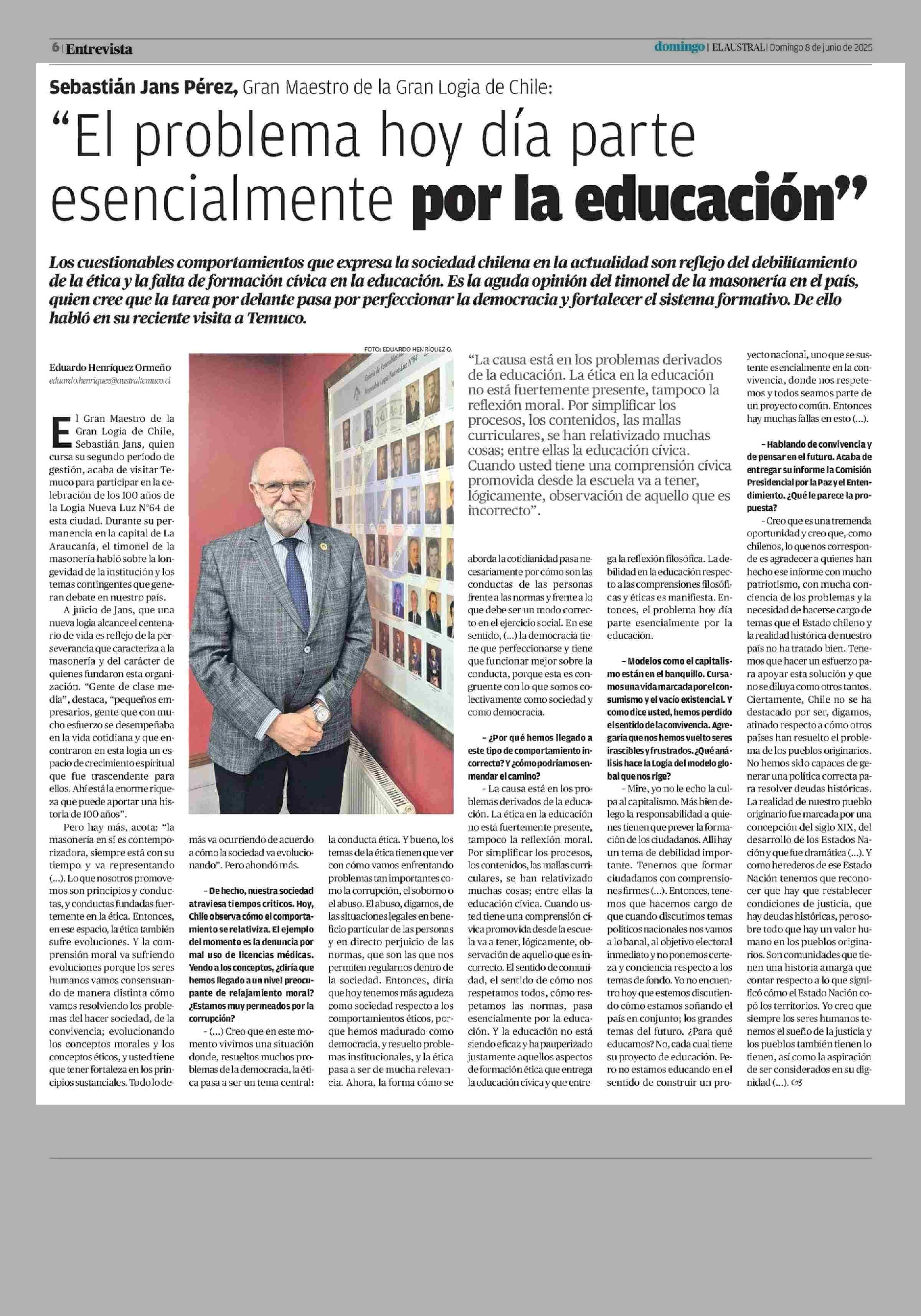 “El problema hoy día parte esencialmente por la educación” 08-06-2025 El Austral de la Araucanía |