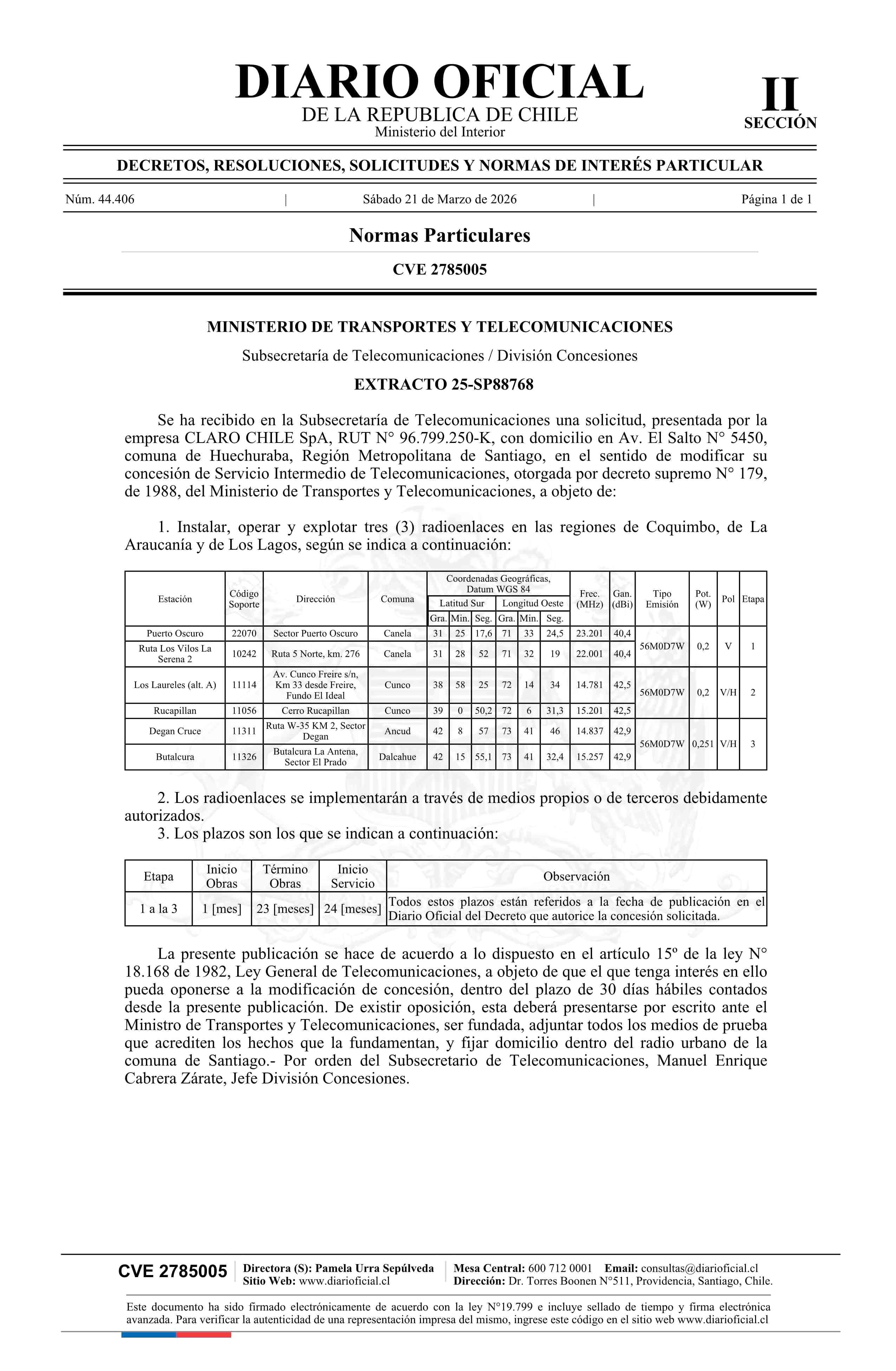 Solicitud número 25-SP88768.- Claro Chile SpA 21-03-2026 Diario Oficial Edición Electrónica |