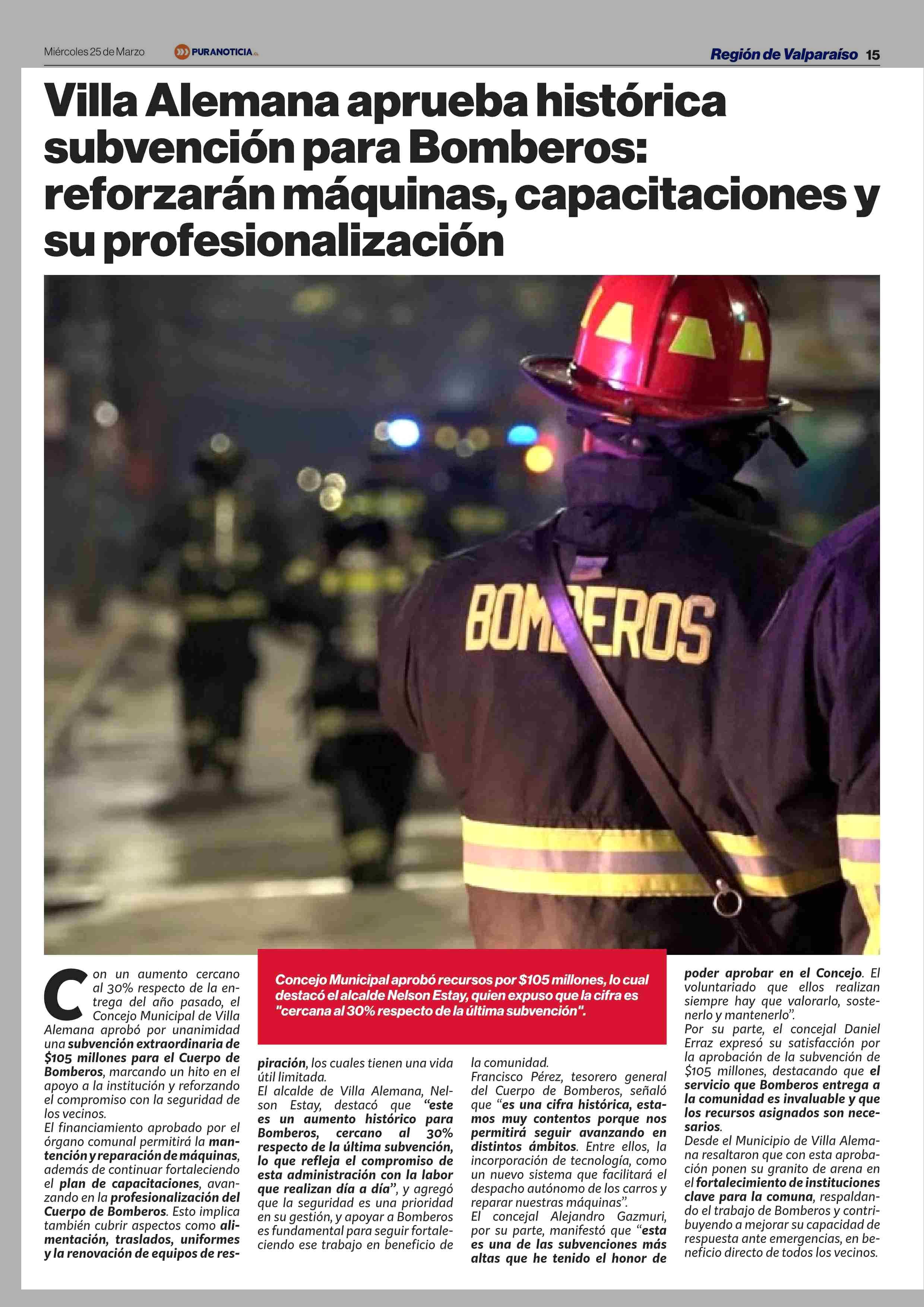 Villa Alemana aprueba histórica subvención para Bomberos: reforzarán máquinas, capacitaciones y su profesionalización 25-03-2026 Puranoticia.cl |