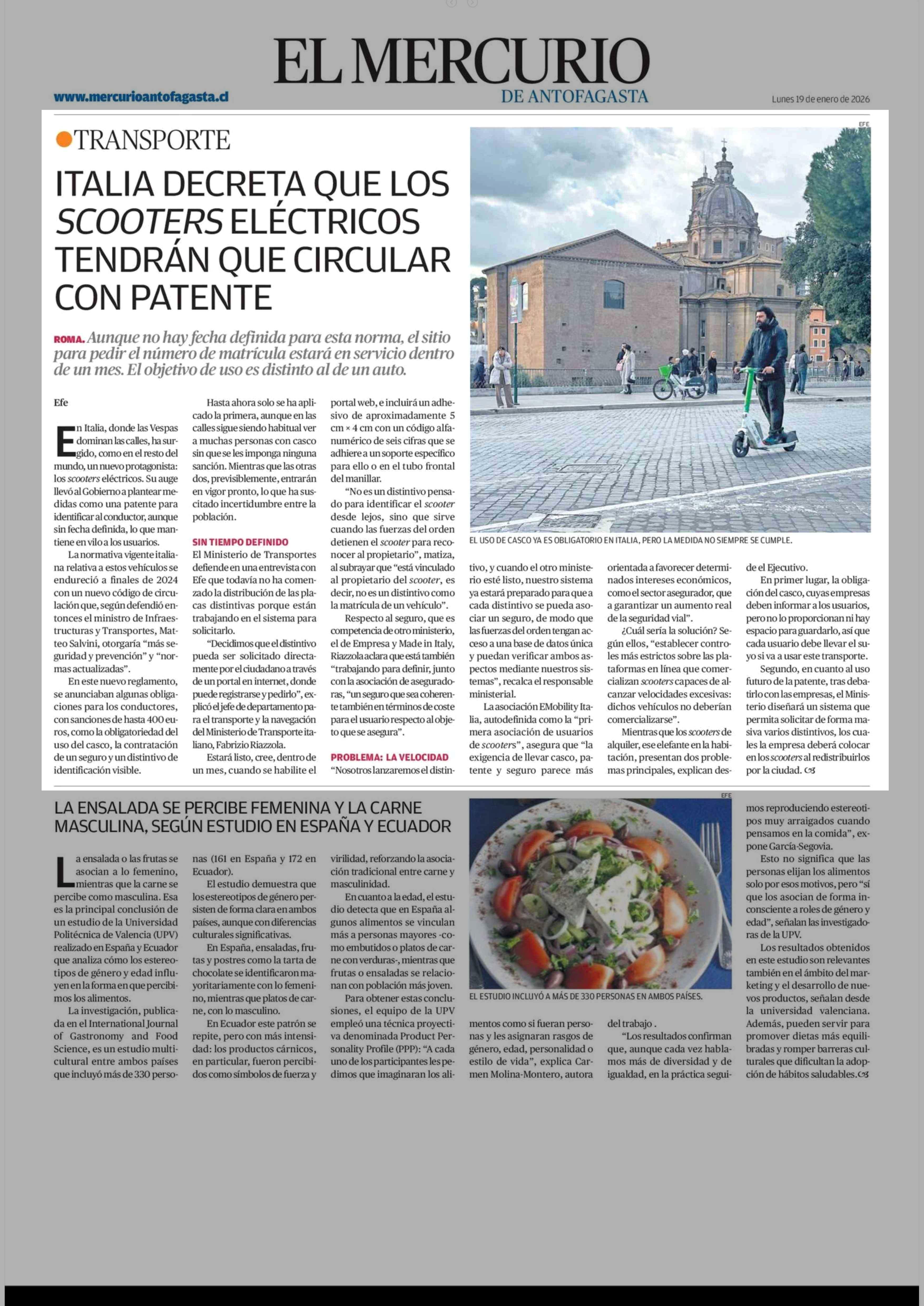 ITALIA DECRETA QUE LOS SCOOTERS ELÉCTRICOS TENDRÁN QUE CIRCULAR CON PATENTE 19-01-2026 El Mercurio de Antofagasta |