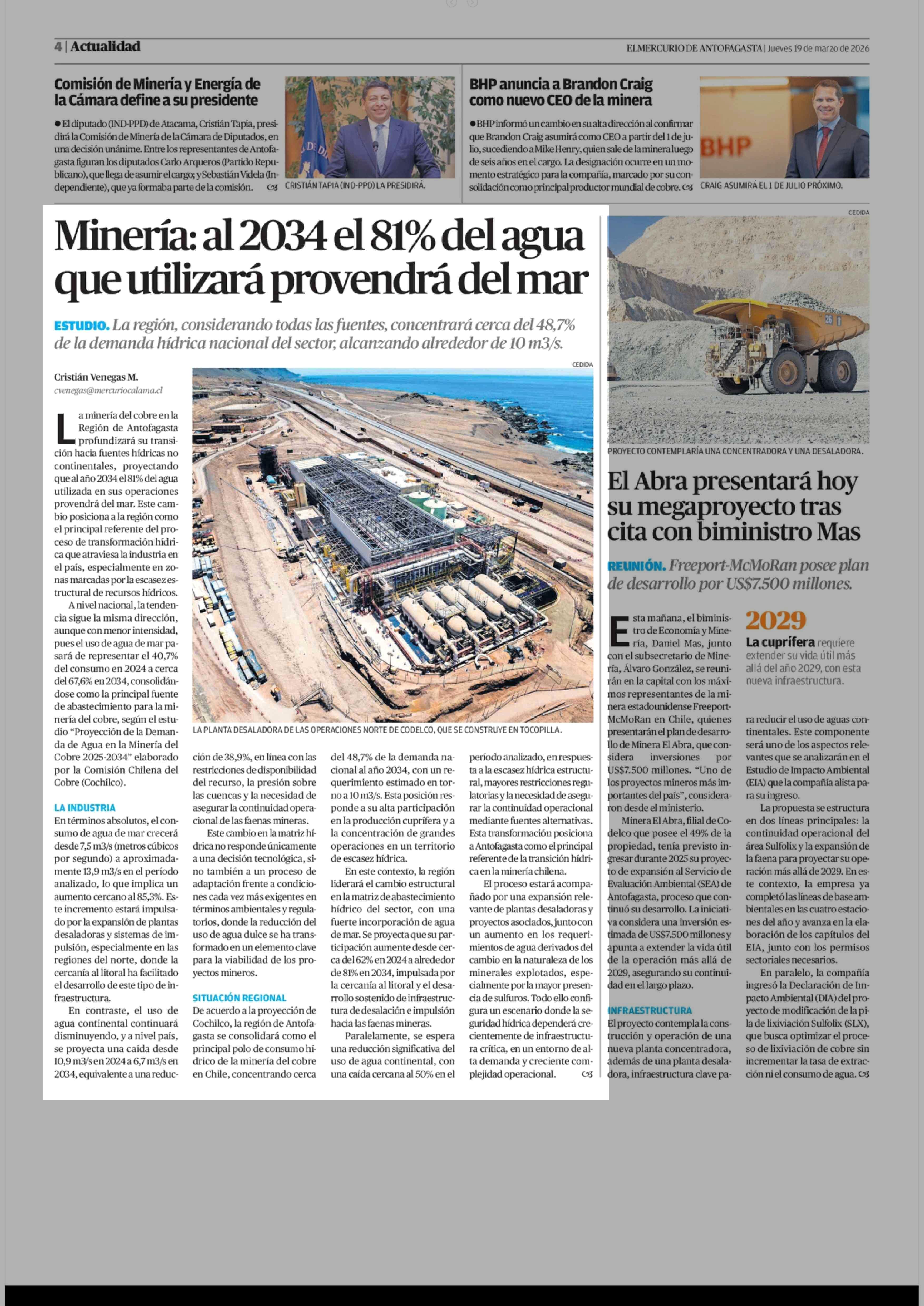 Minería: al 2034 el 81% del agua que utilizará provendrá del mar 19-03-2026 El Mercurio de Antofagasta |