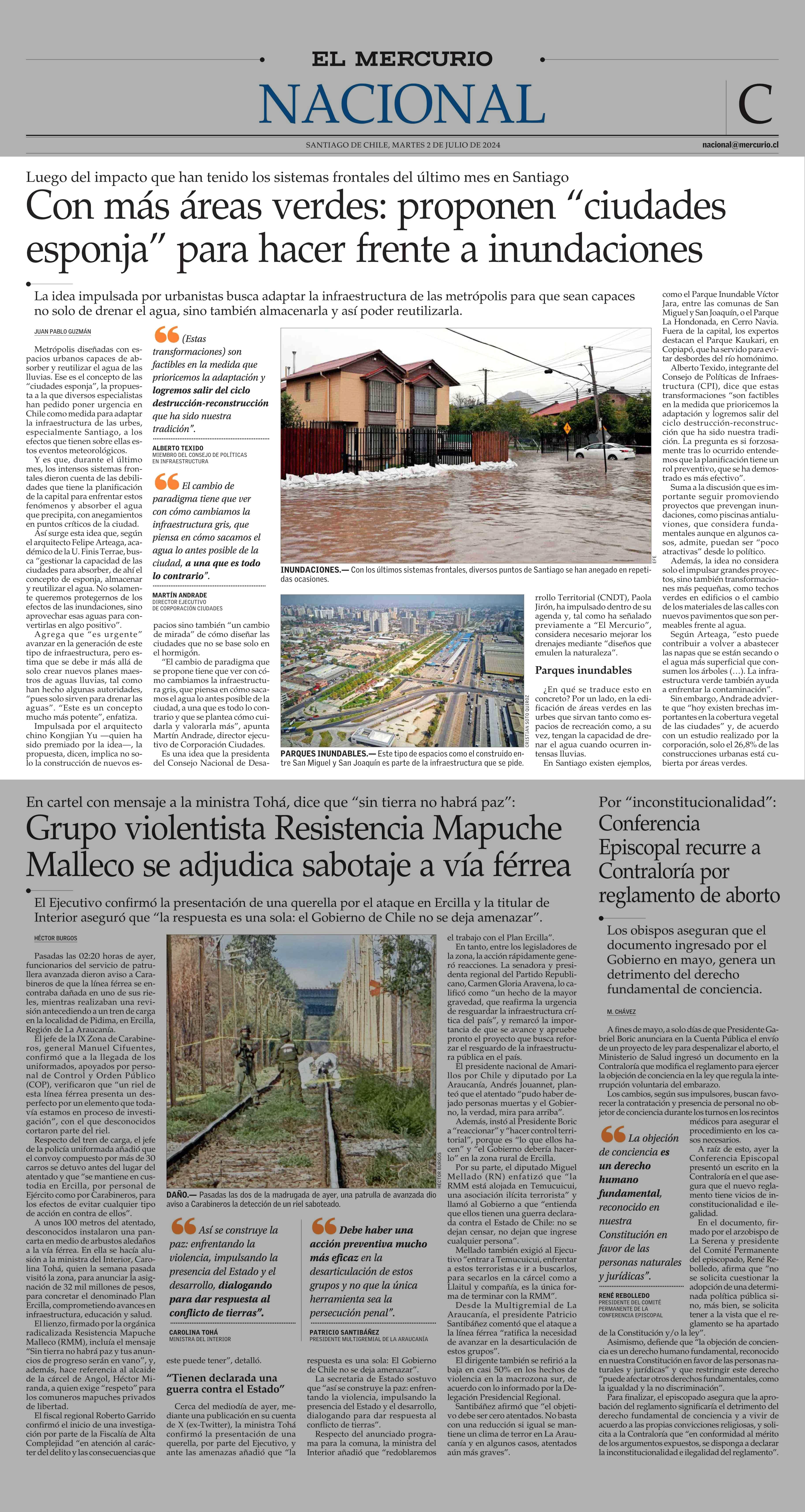 Con más áreas verdes: proponen “ciudades esponja” para hacer frente a inundaciones 02-07-2024 El Mercurio |
