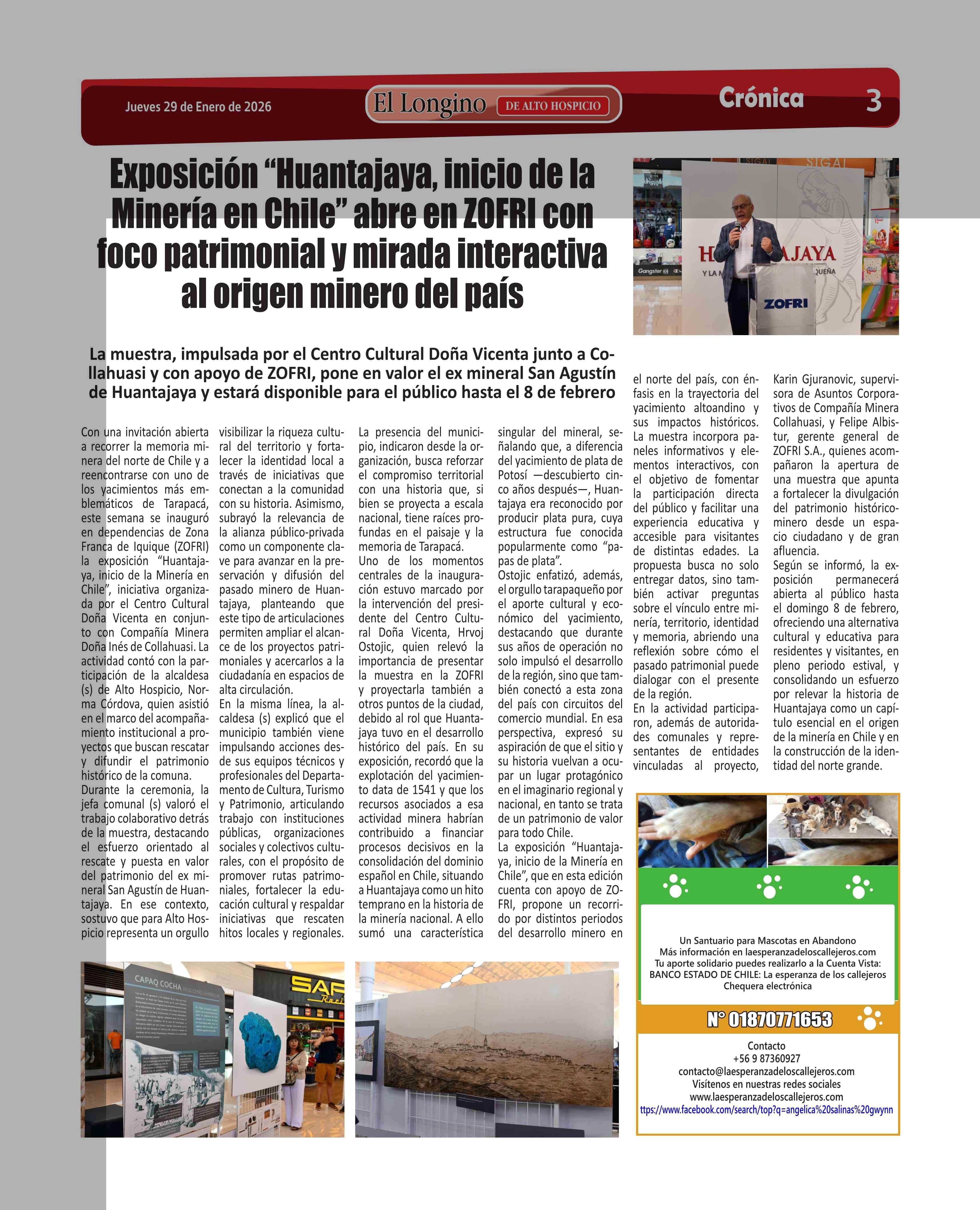 Título: Exposición "Huantajaya, inicio de la Minería en Chile" abre en ZOFRI con foco patrimonial y mirada interactiva al origen minero del país