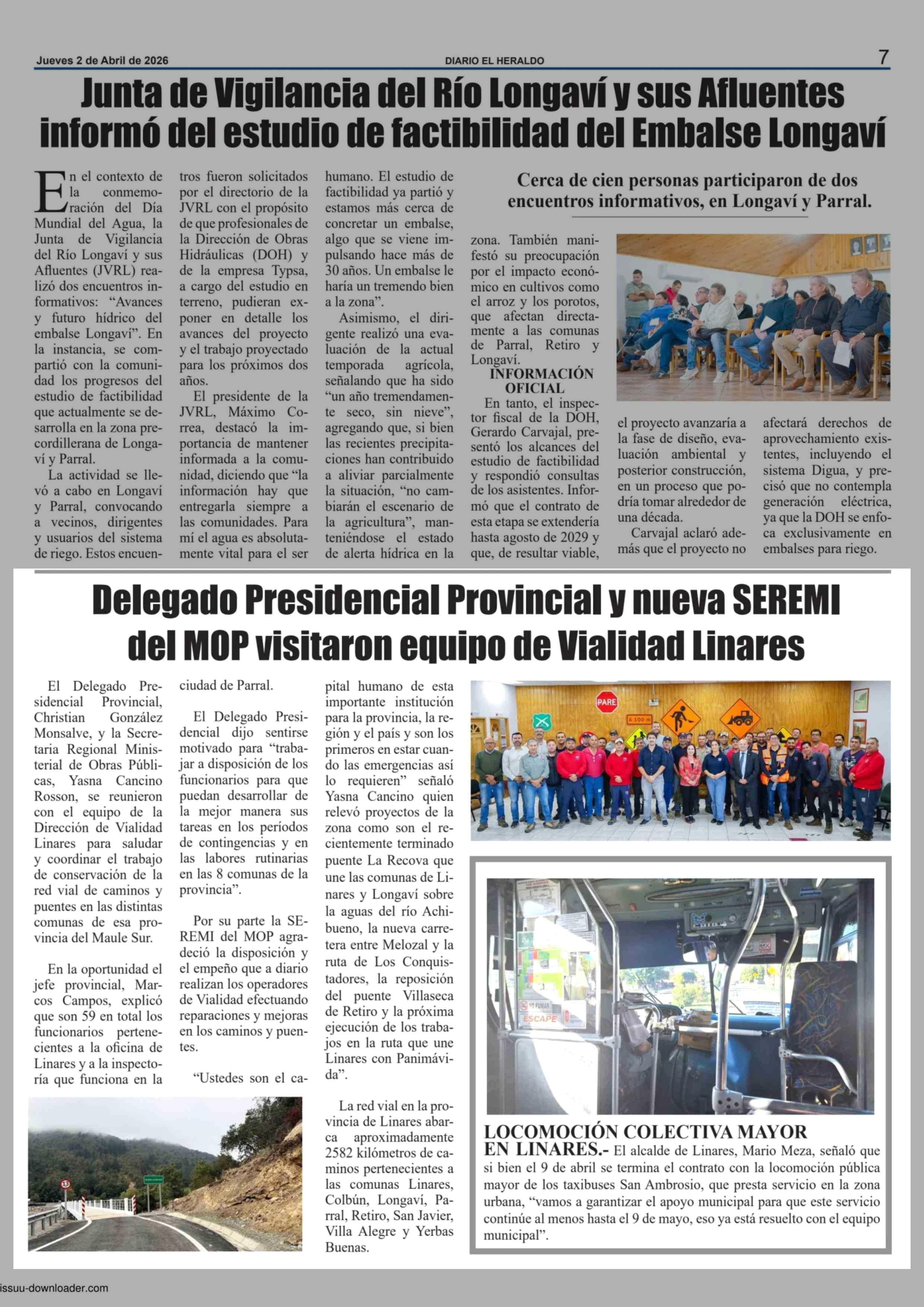 Delegado Presidencial Provincial y nueva SEREMI del MOP visitaron equipo de Vialidad Linares 02-04-2026 El Heraldo |