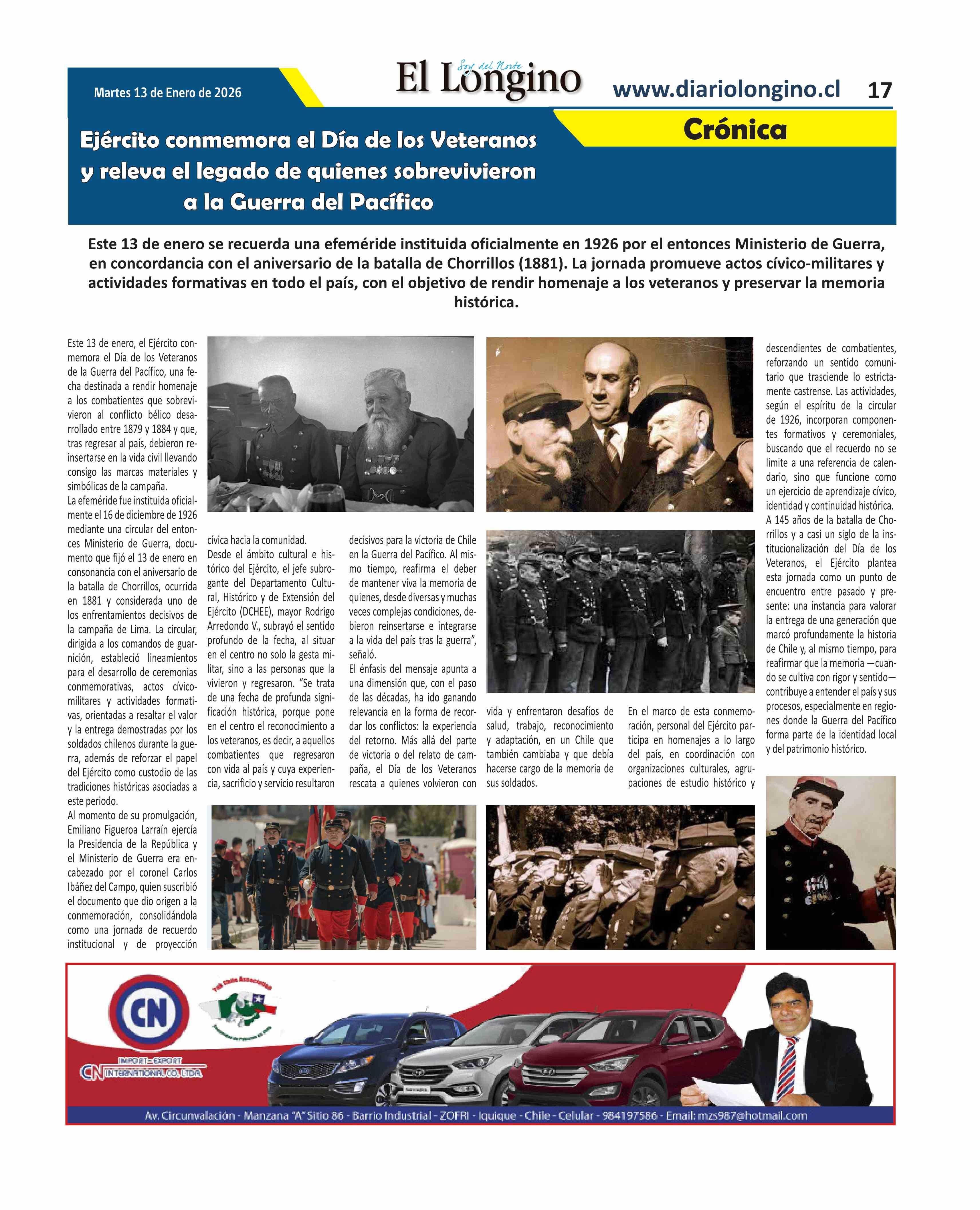 Ejército conmemora el Día de los Veteranos y releva el legado de quienes sobrevivieron a la Guerra del Pacífico 13-01-2026 El Longino |