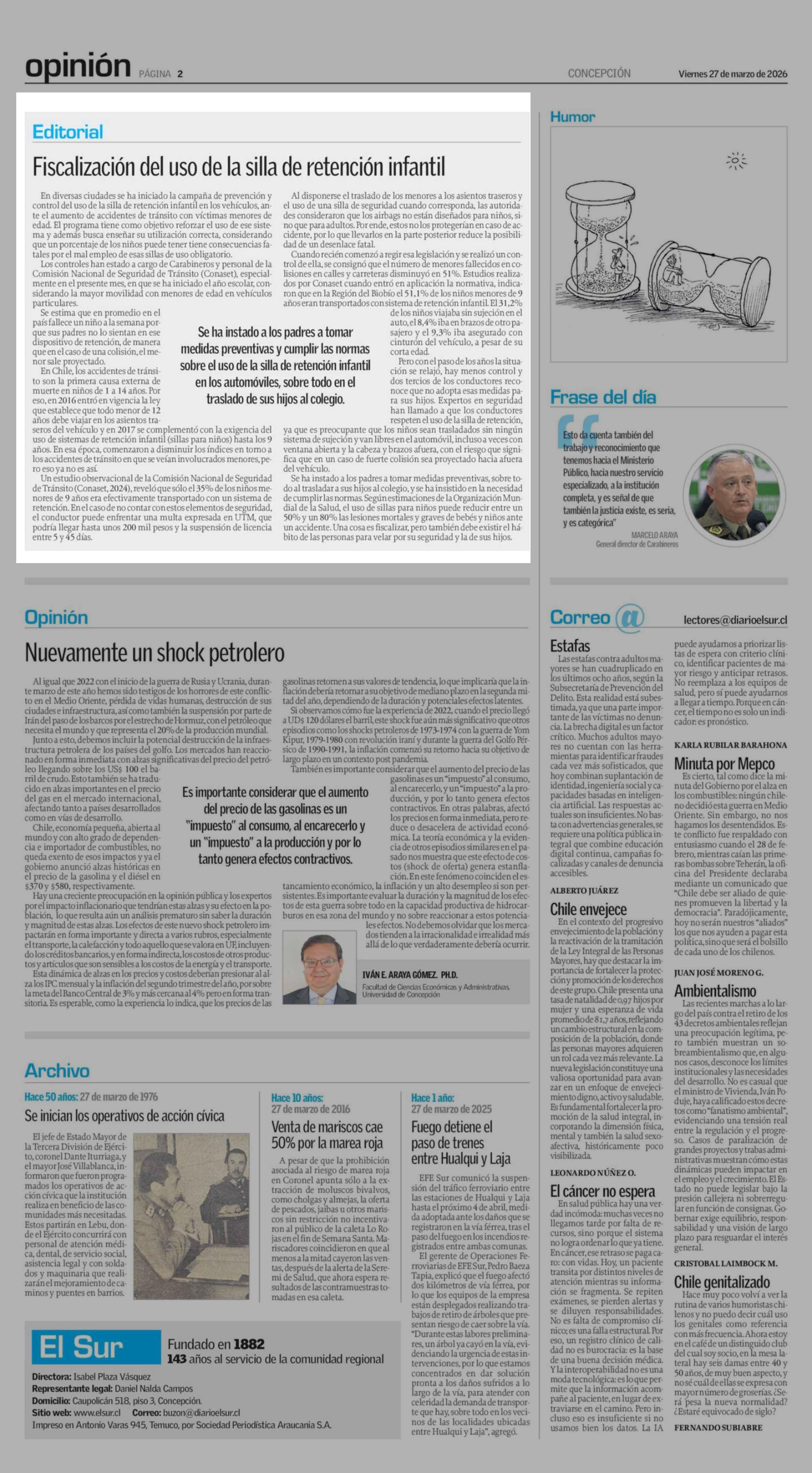 EDITORIAL: Editorial Fiscalización del uso de la silla de retención infantil 27-03-2026 El Sur |