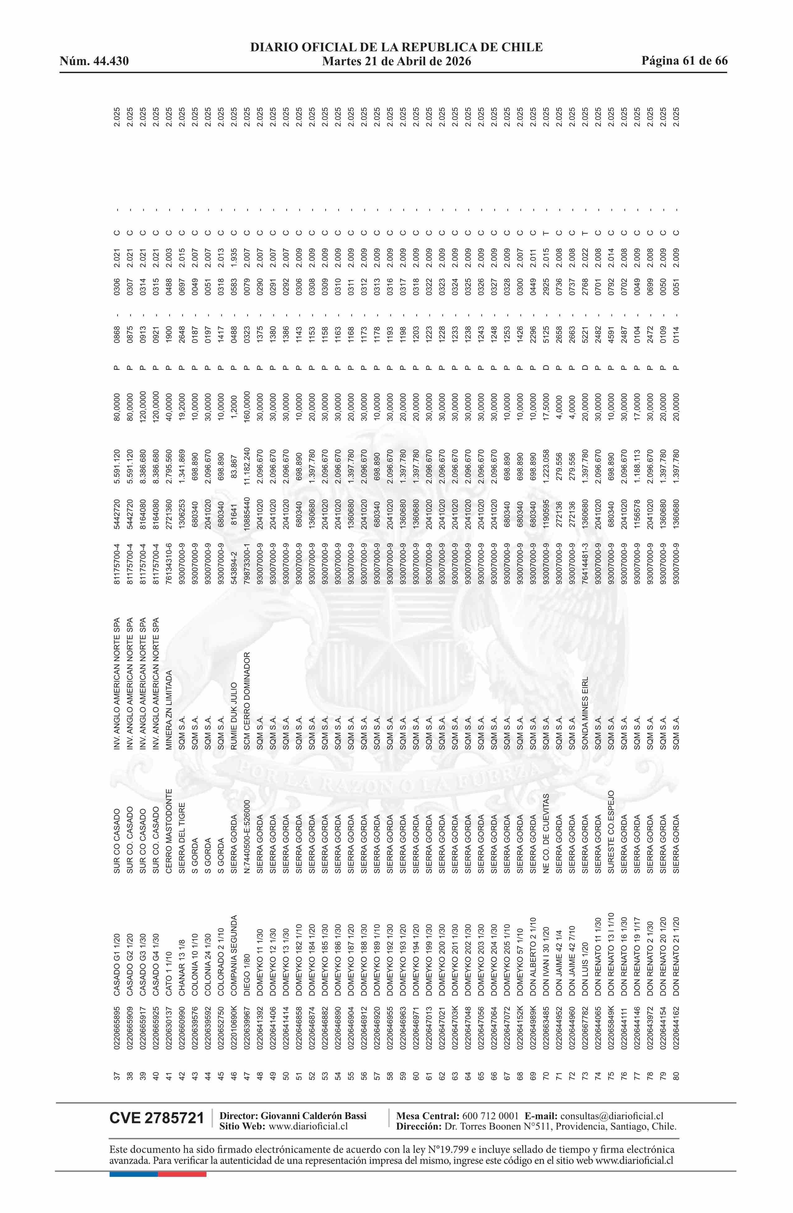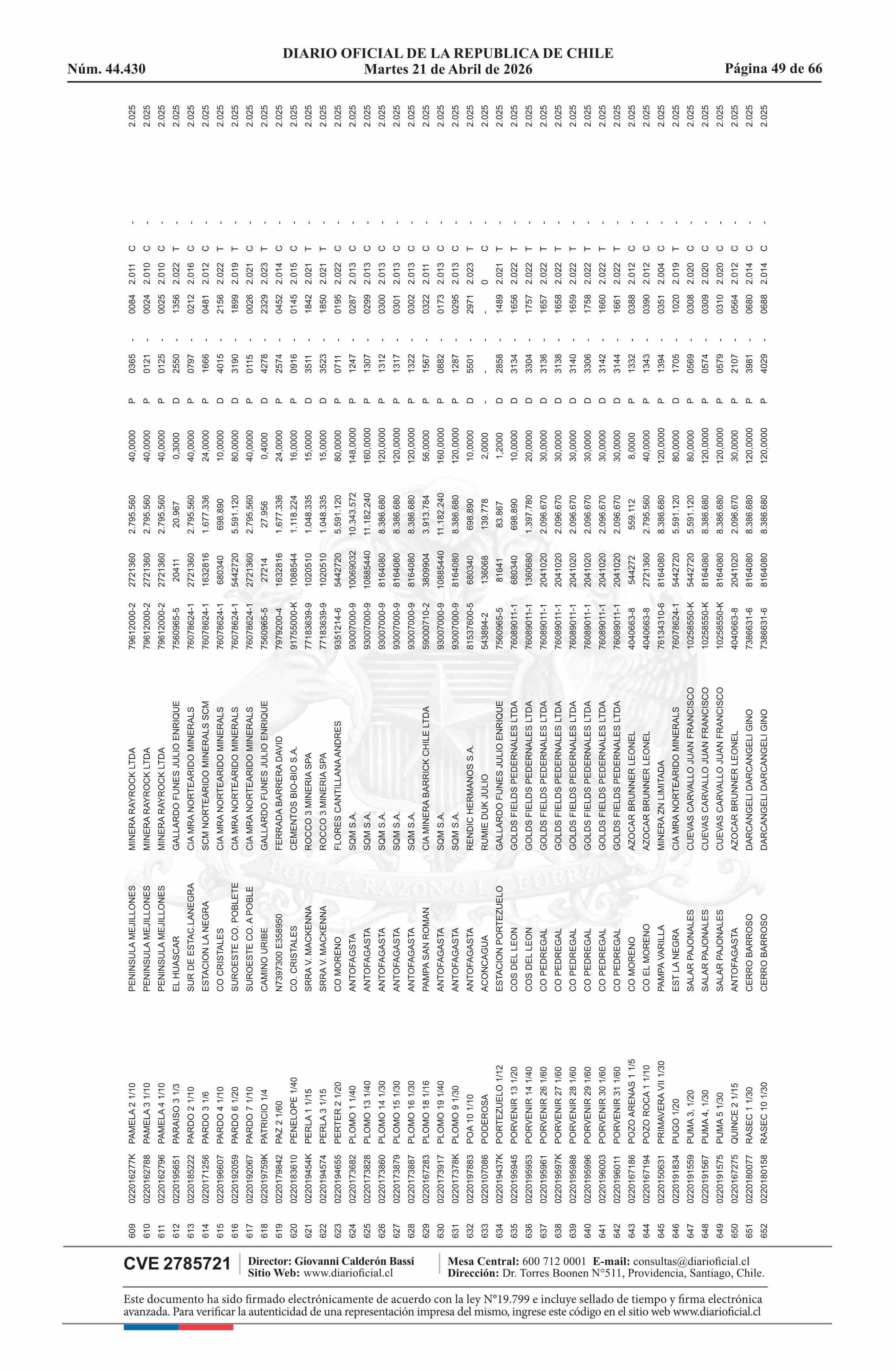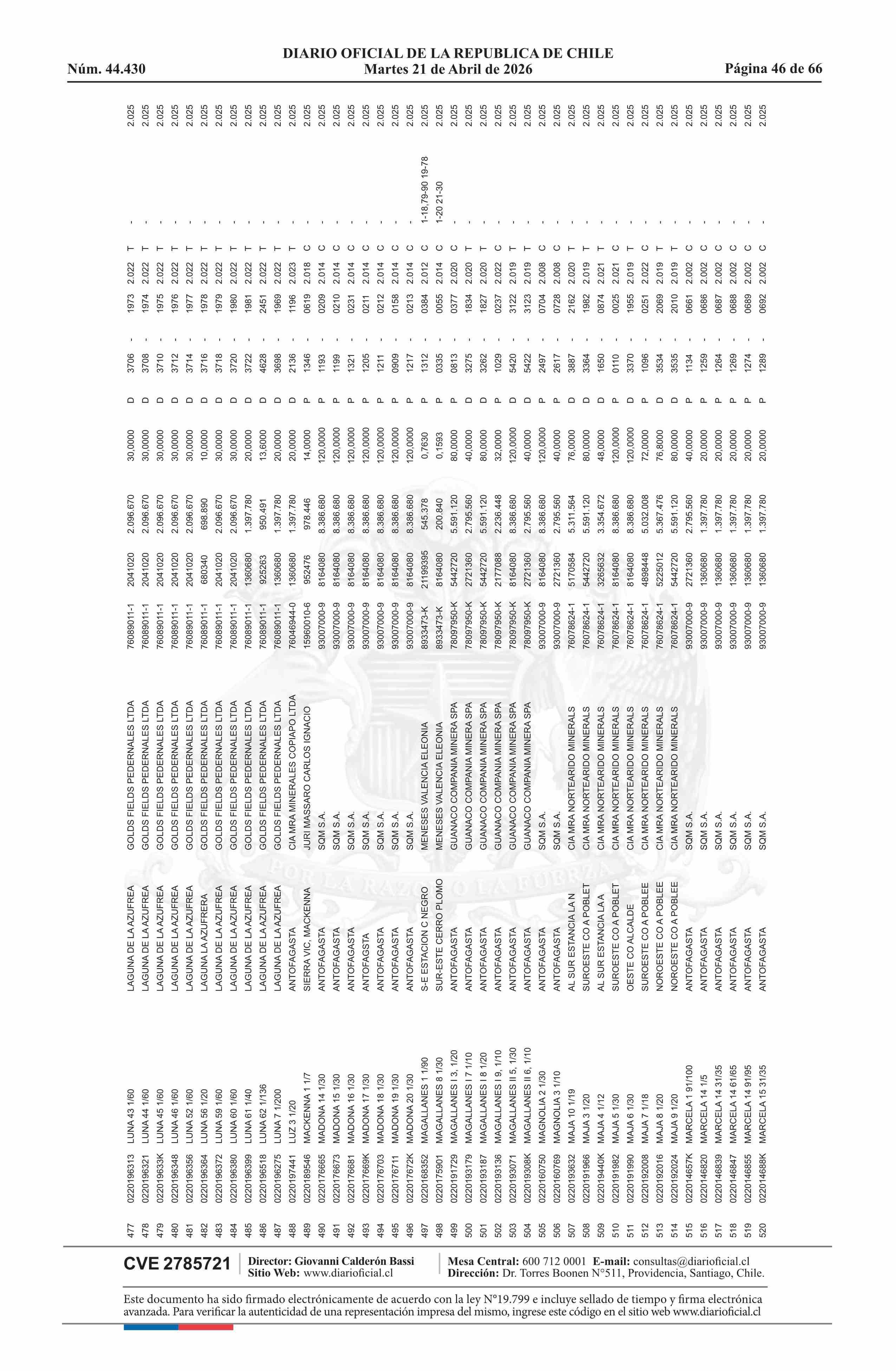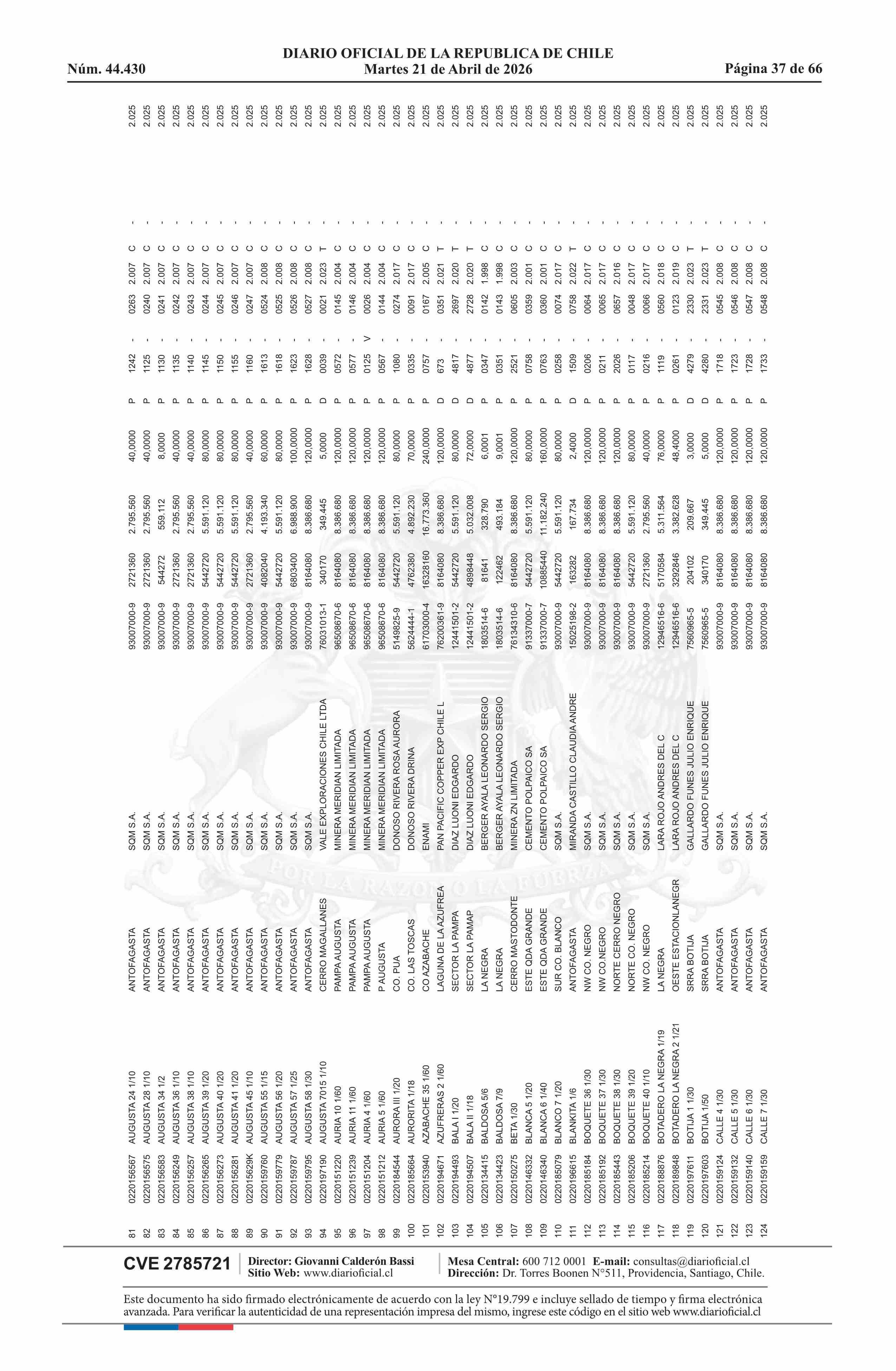 Fuente: DIARIO OFICIAL CHILE - BOLETÍN OFICIAL DE MINERÍA (DIARIO OFICIAL CHILE – BOM – NÓMINA REMATE) Página(s): 1-66