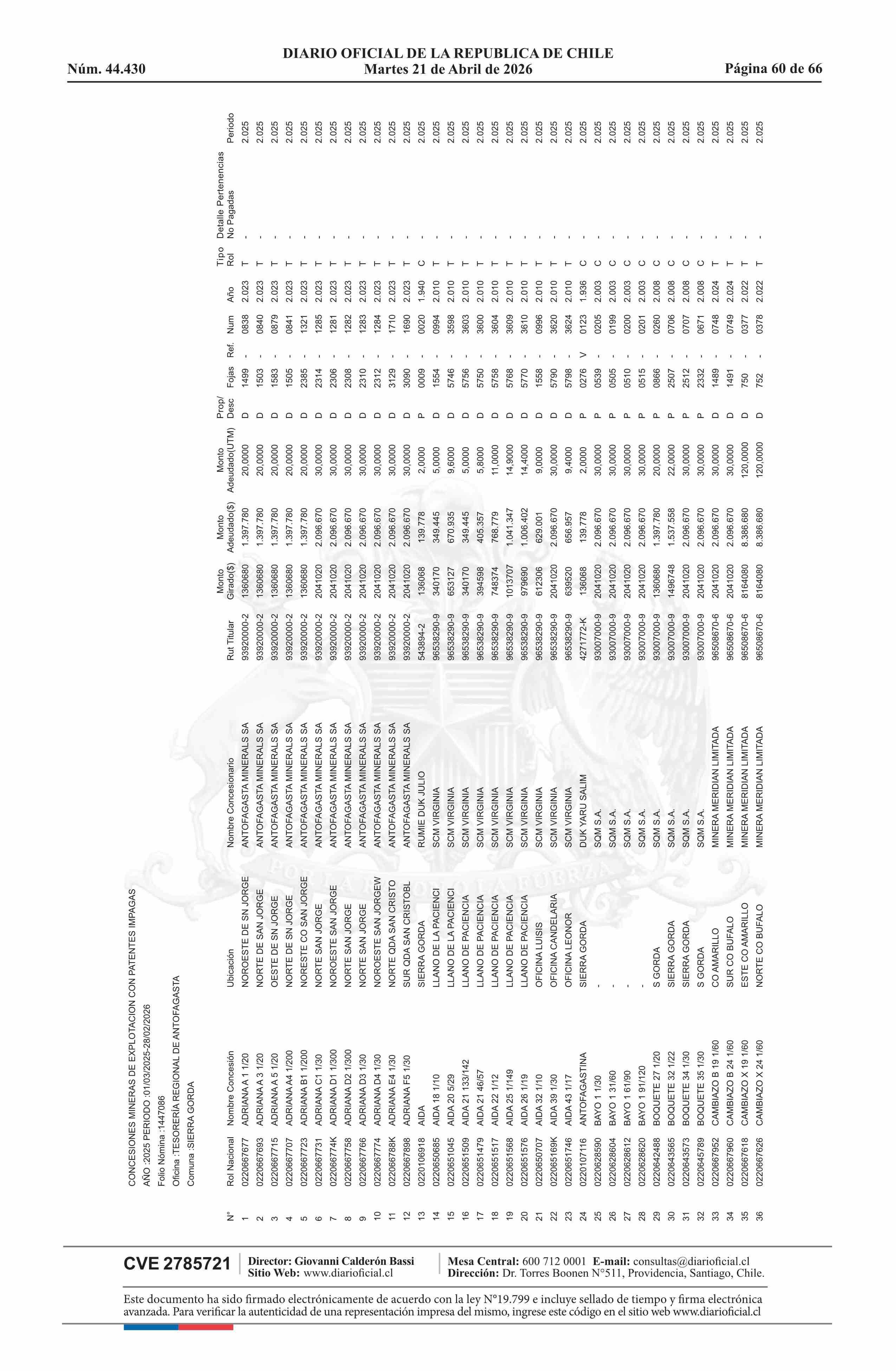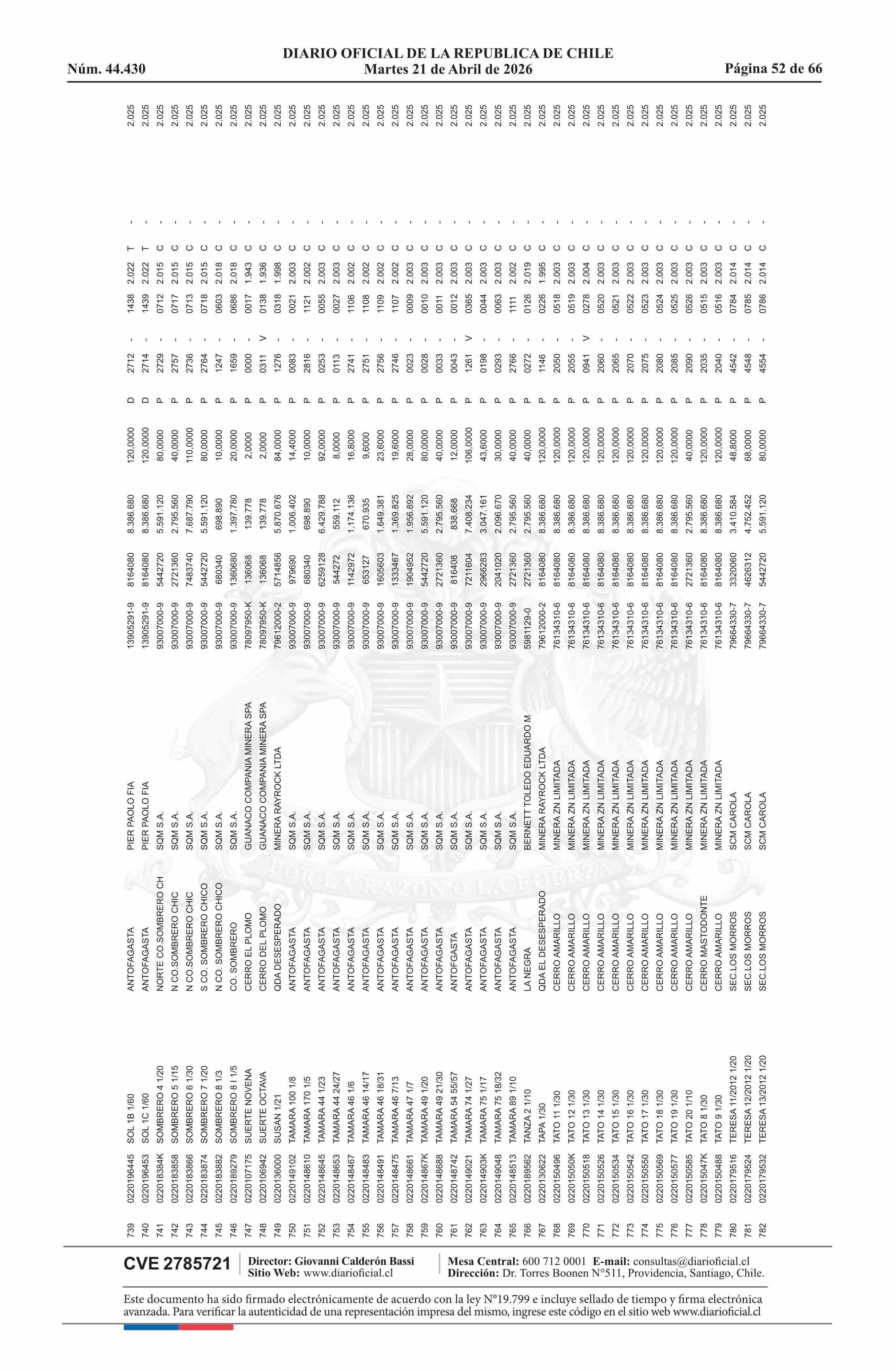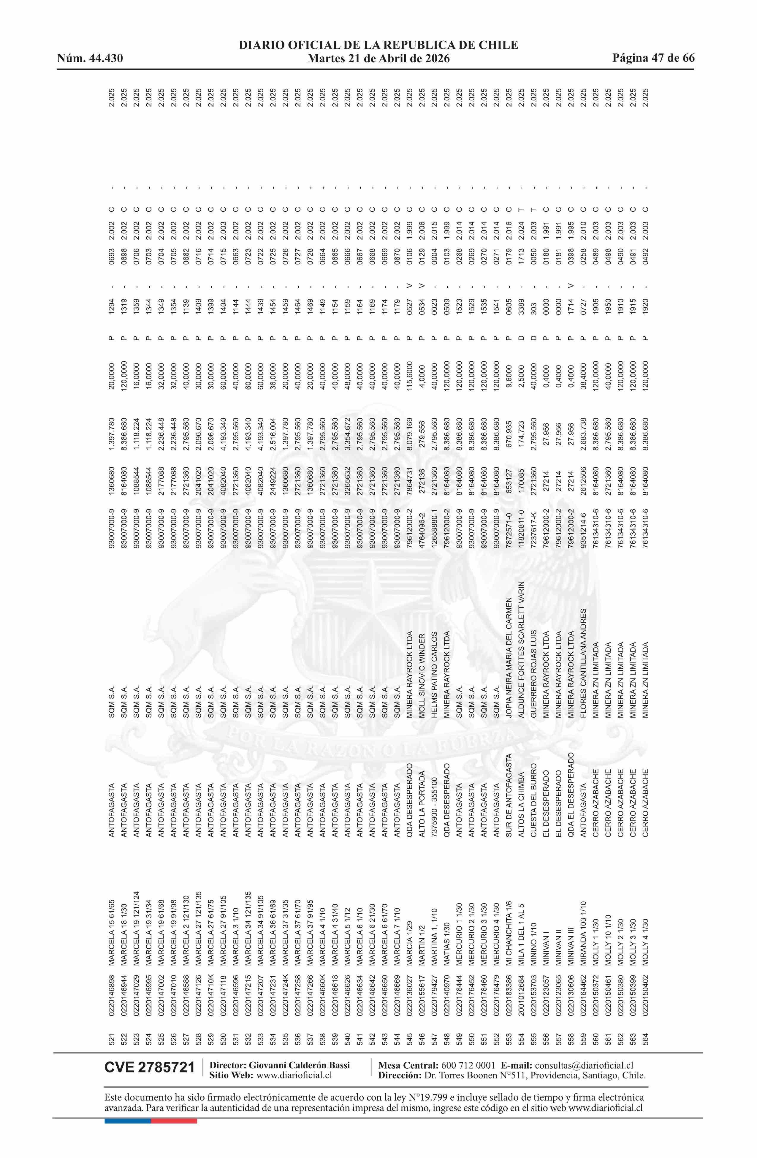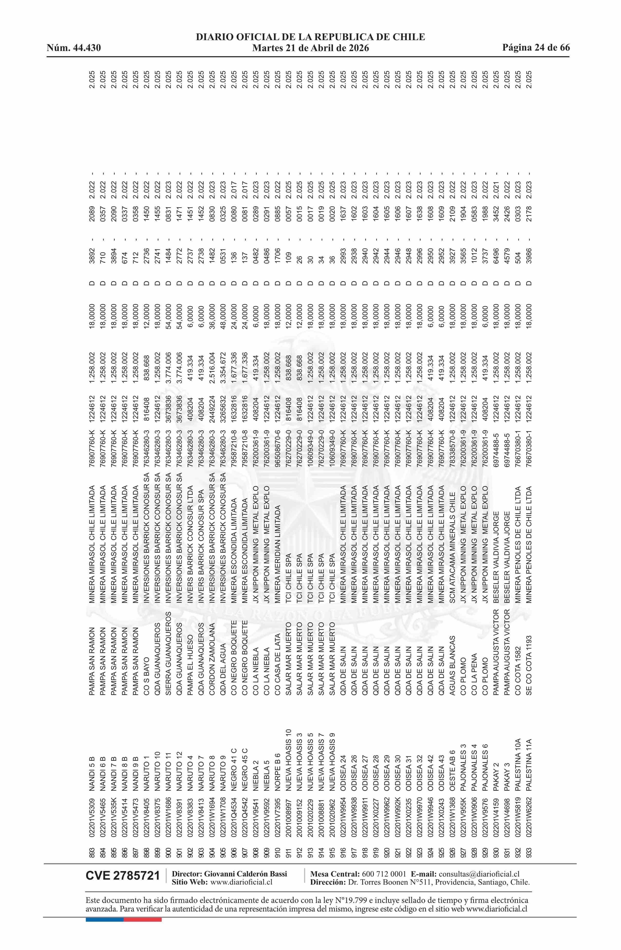Fuente: DIARIO OFICIAL CHILE - BOLETÍN OFICIAL DE MINERÍA (DIARIO OFICIAL CHILE – BOM – NÓMINA REMATE) Página(s): 1-66