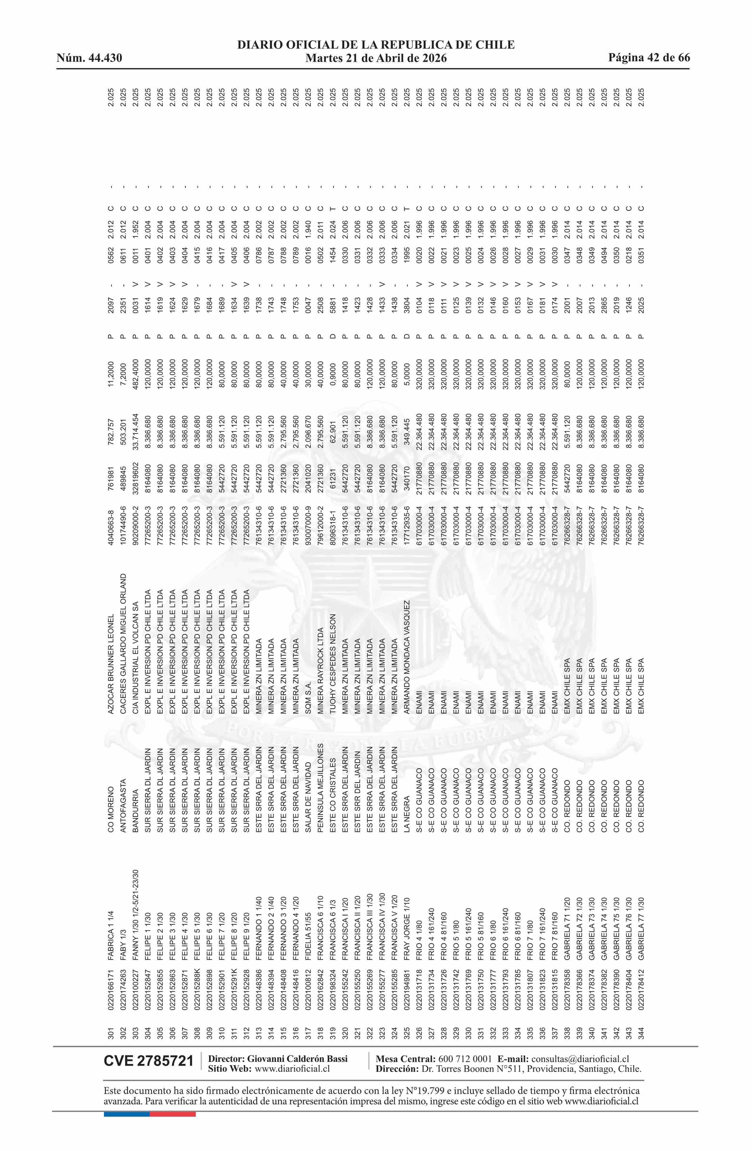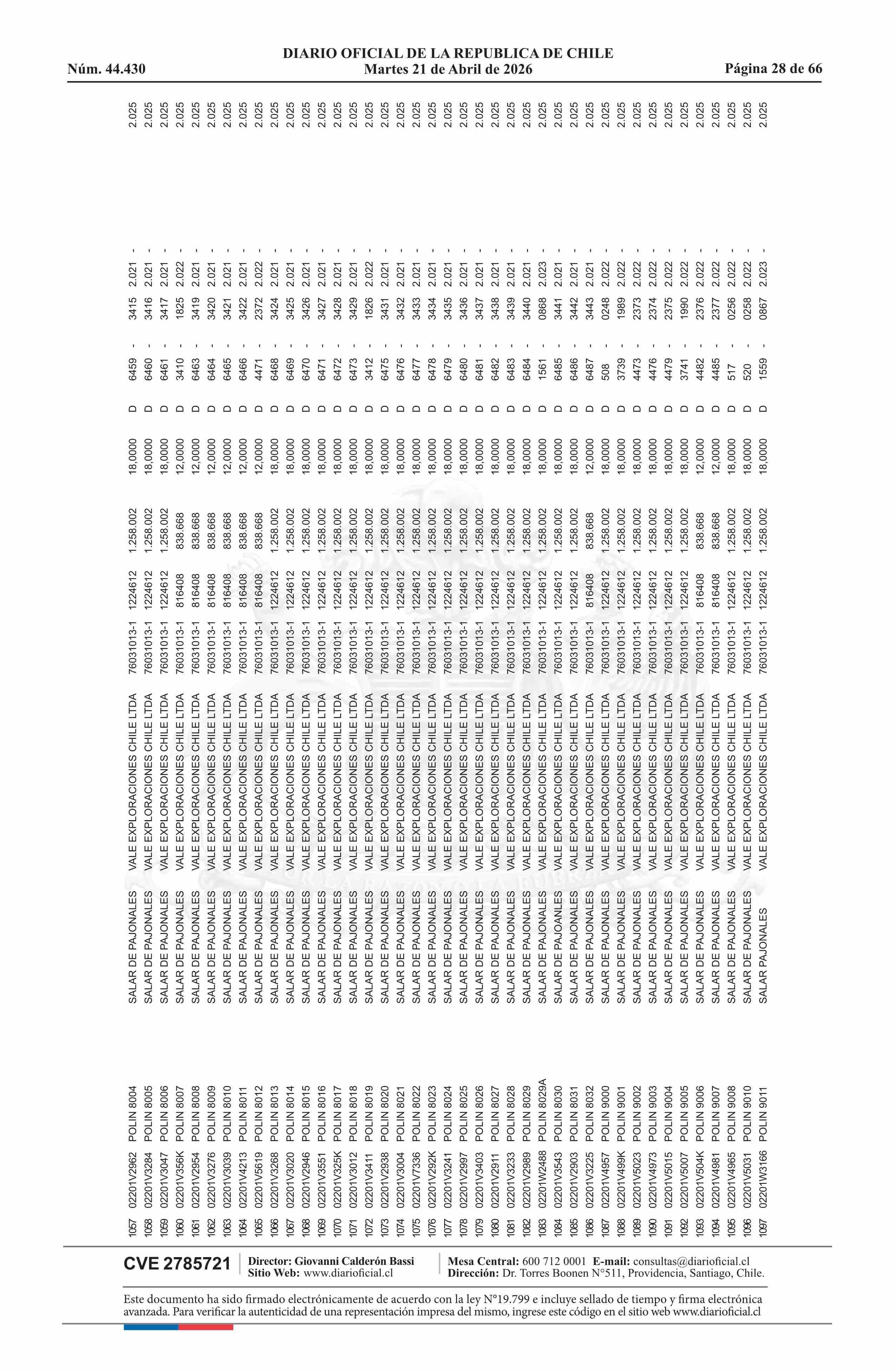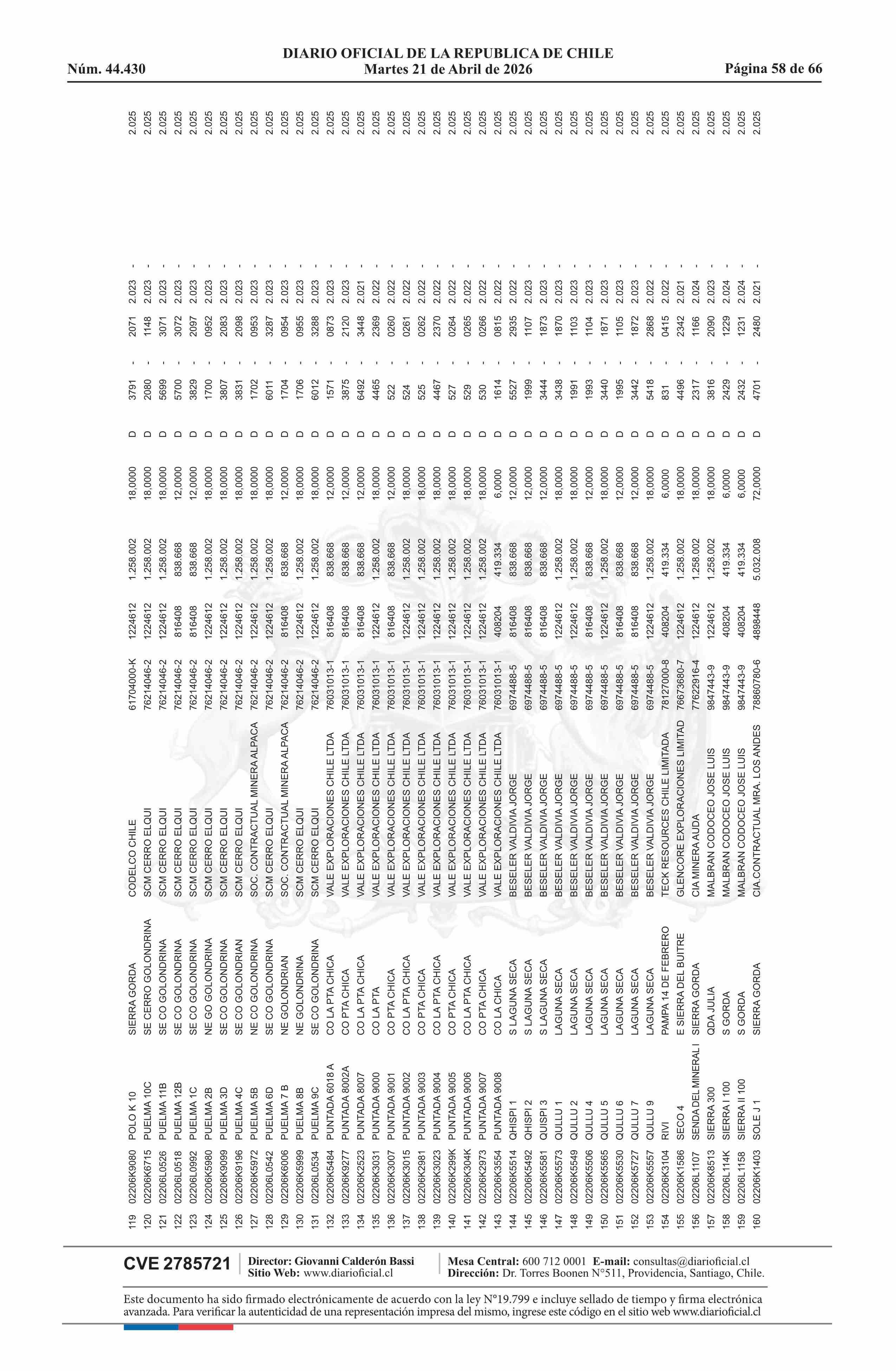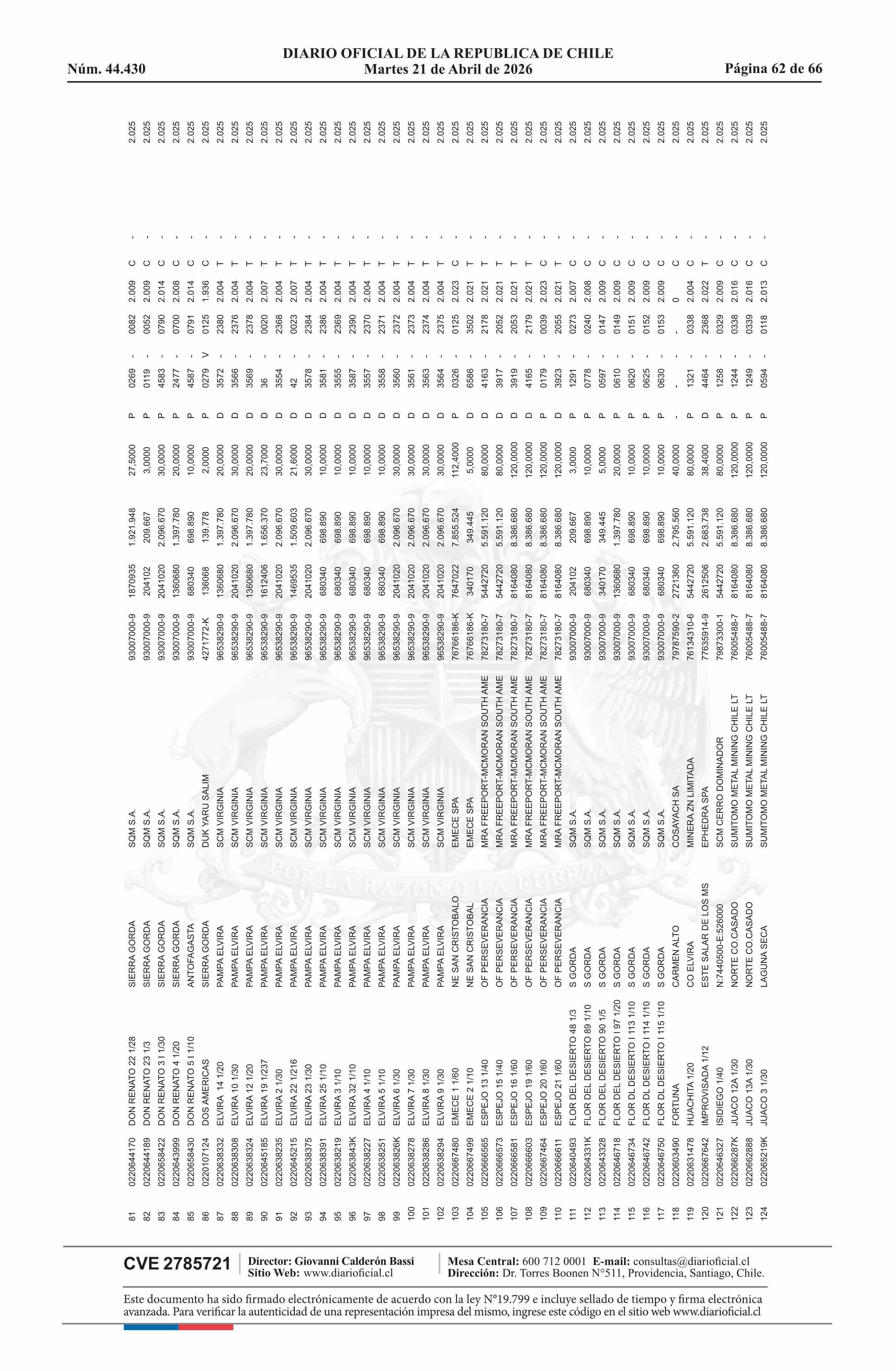 Fuente: DIARIO OFICIAL CHILE - BOLETÍN OFICIAL DE MINERÍA (DIARIO OFICIAL CHILE – BOM – NÓMINA REMATE) Página(s): 1-66