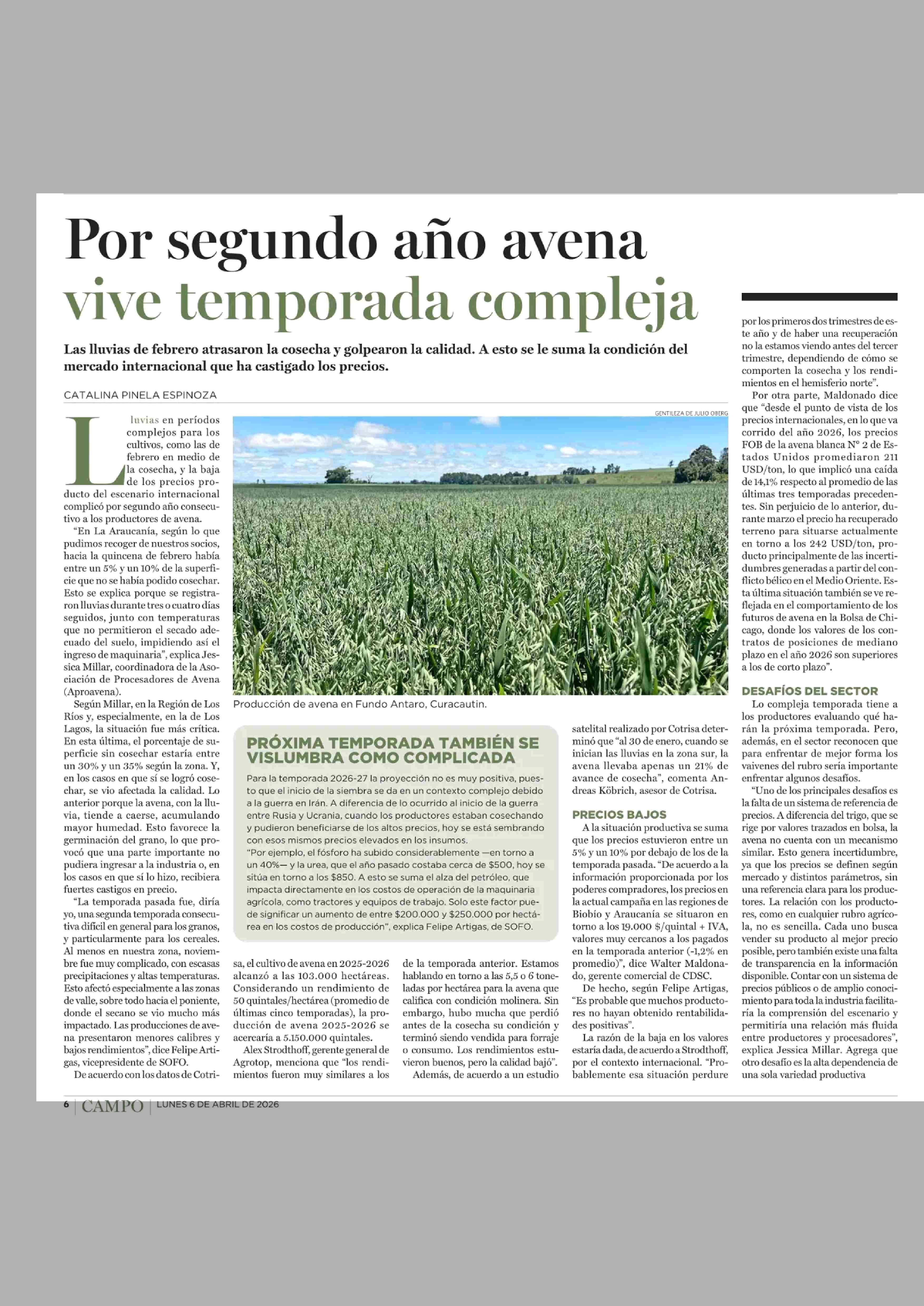 Título: Por segundo año avena vive temporada compleja
