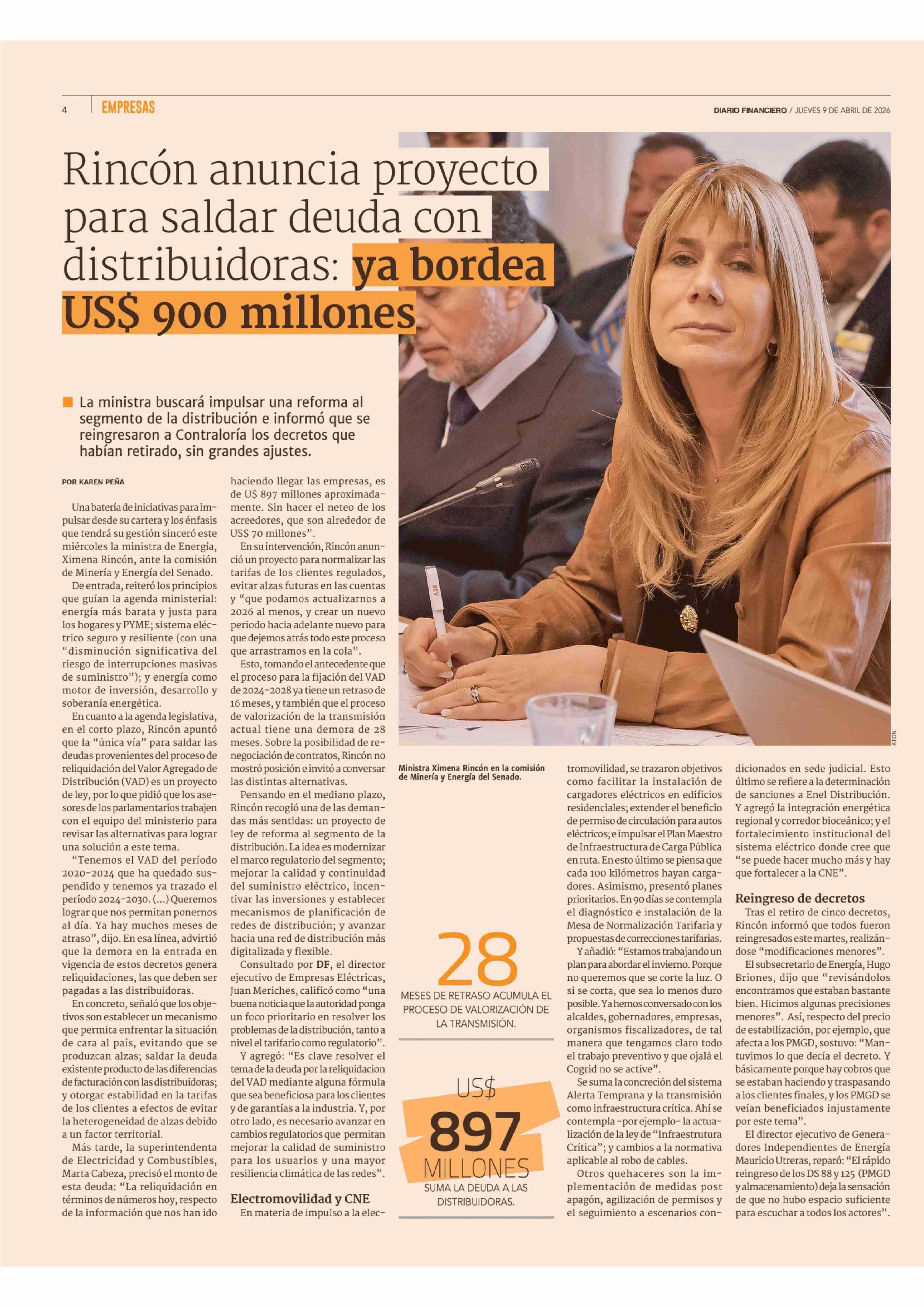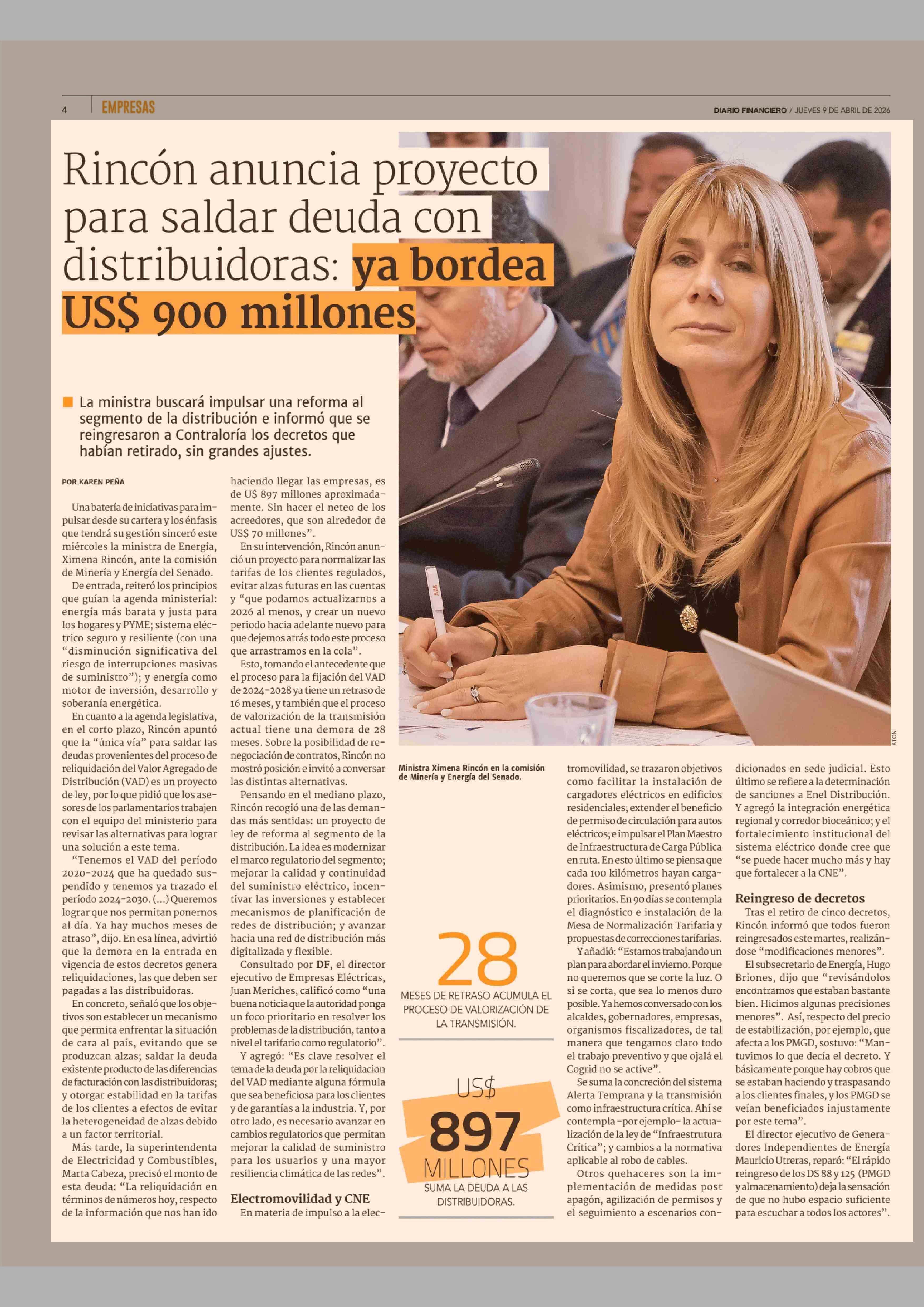 Rincón anuncia proyecto para saldar deuda con distribuidoras: ya bordea US$ 900 millones 09-04-2026 Diario Financiero |