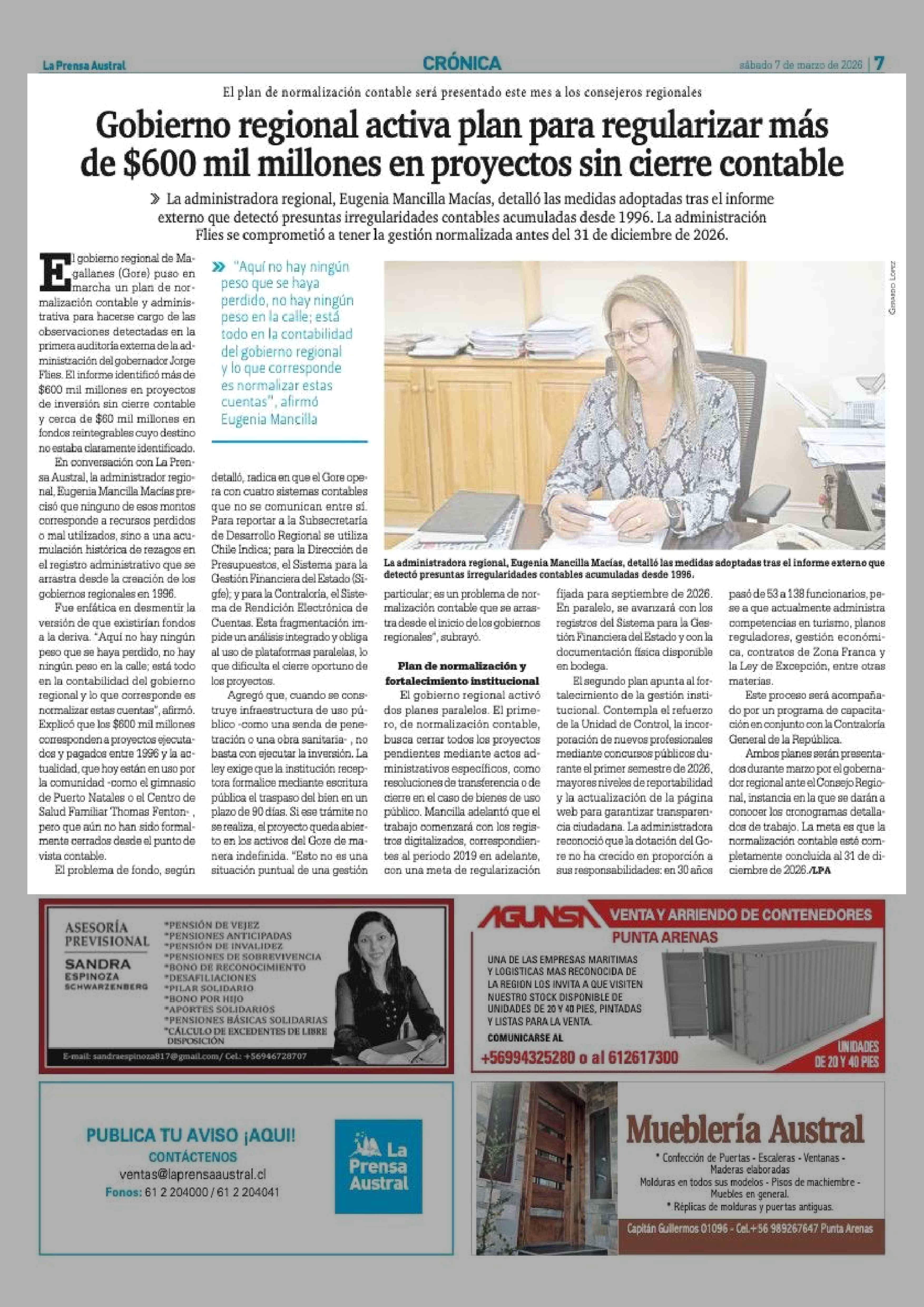Gobierno regional activa plan para regularizar más de $600 mil millones en proyectos sin cierre contable 07-03-2026 La Prensa Austral |