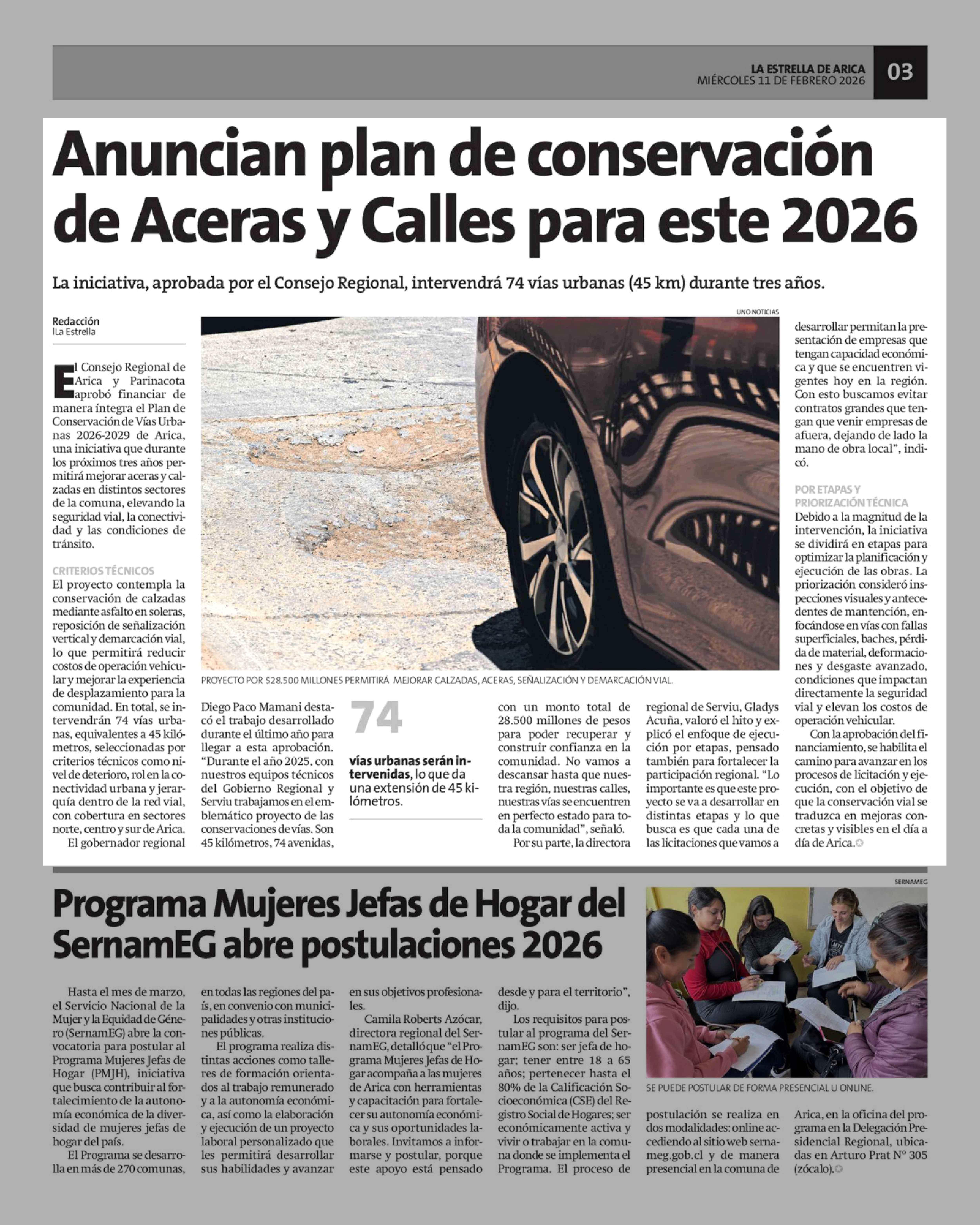 Anuncian plan de conservación de Aceras y Calles para este 2026 11-02-2026 La Estrella de Arica |