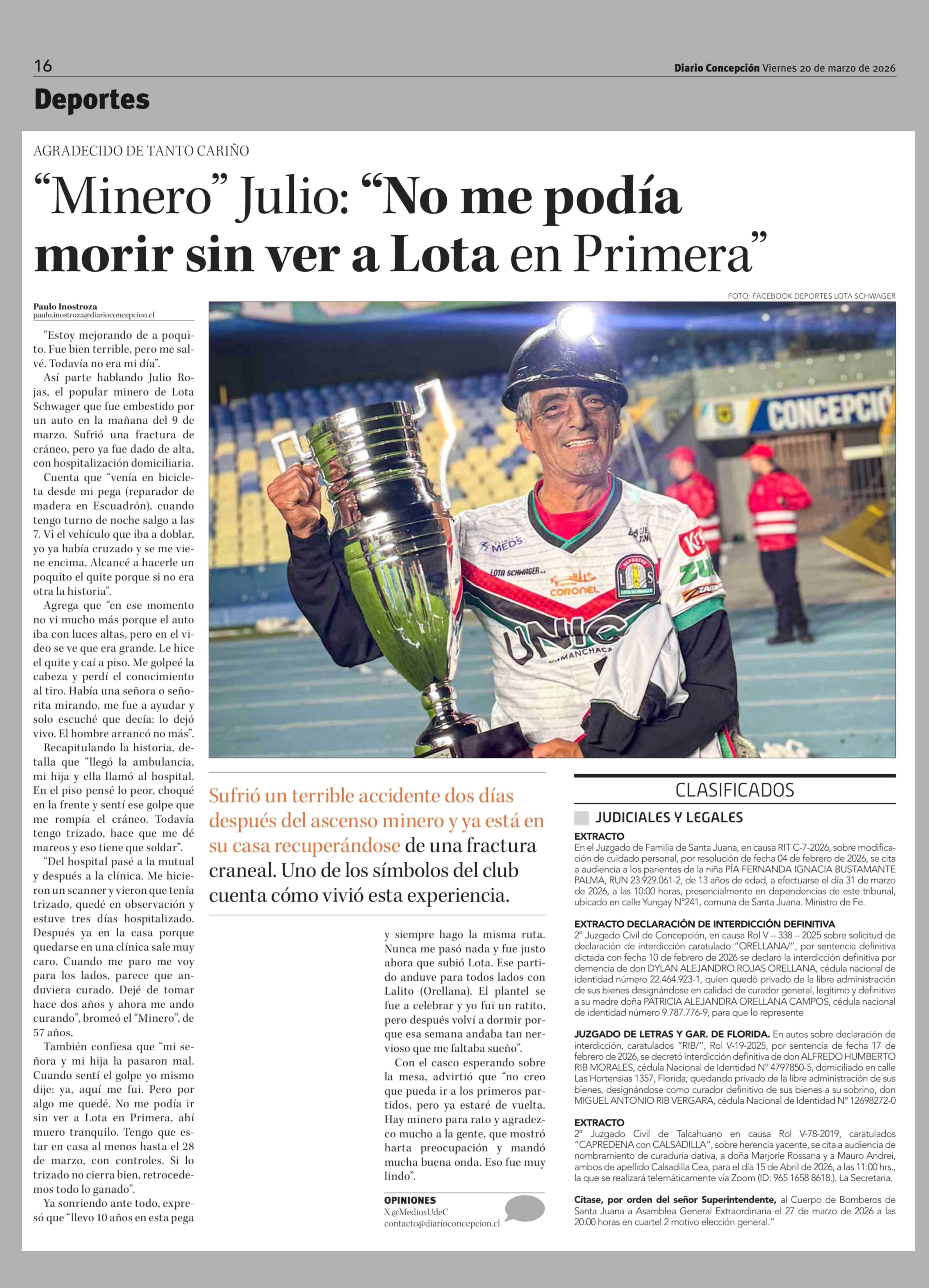 "Minero" Julio: "No me podía morir sin ver a Lota en Primera" 20-03-2026 Diario Concepción |