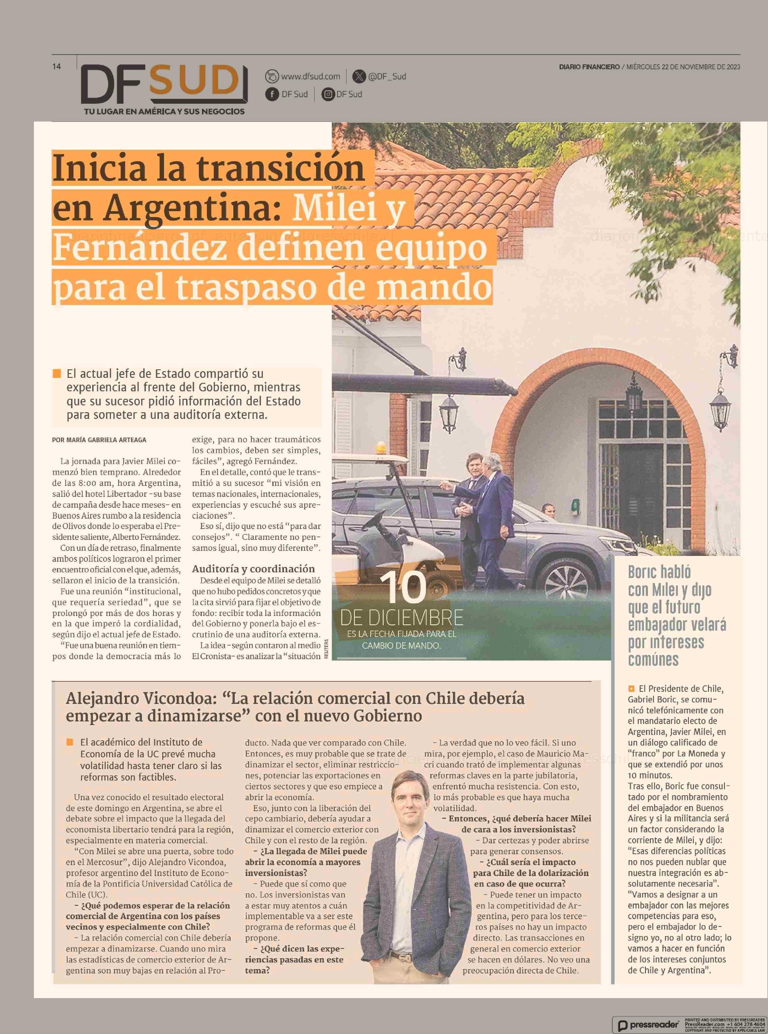 Inicia la transición en Argentina: Milei y Fernández definen equipo para el traspaso de mando 22-11-2023 Diario Financiero |