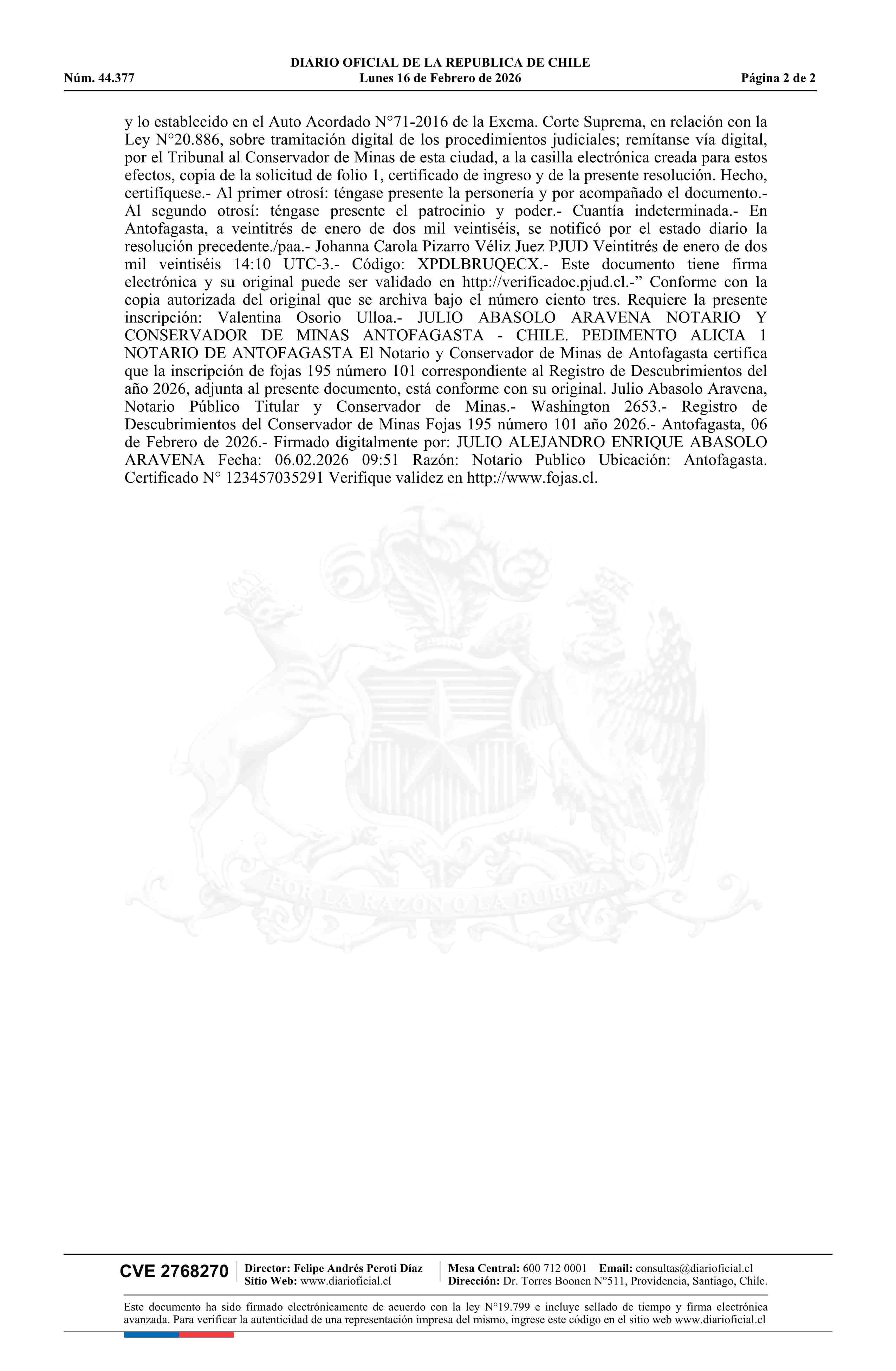 ALICIA 1 / Minera Meridian Limitada 16-02-2026 DIARIO OFICIAL CHILE - BOLETÍN OFICIAL DE MINERÍA |