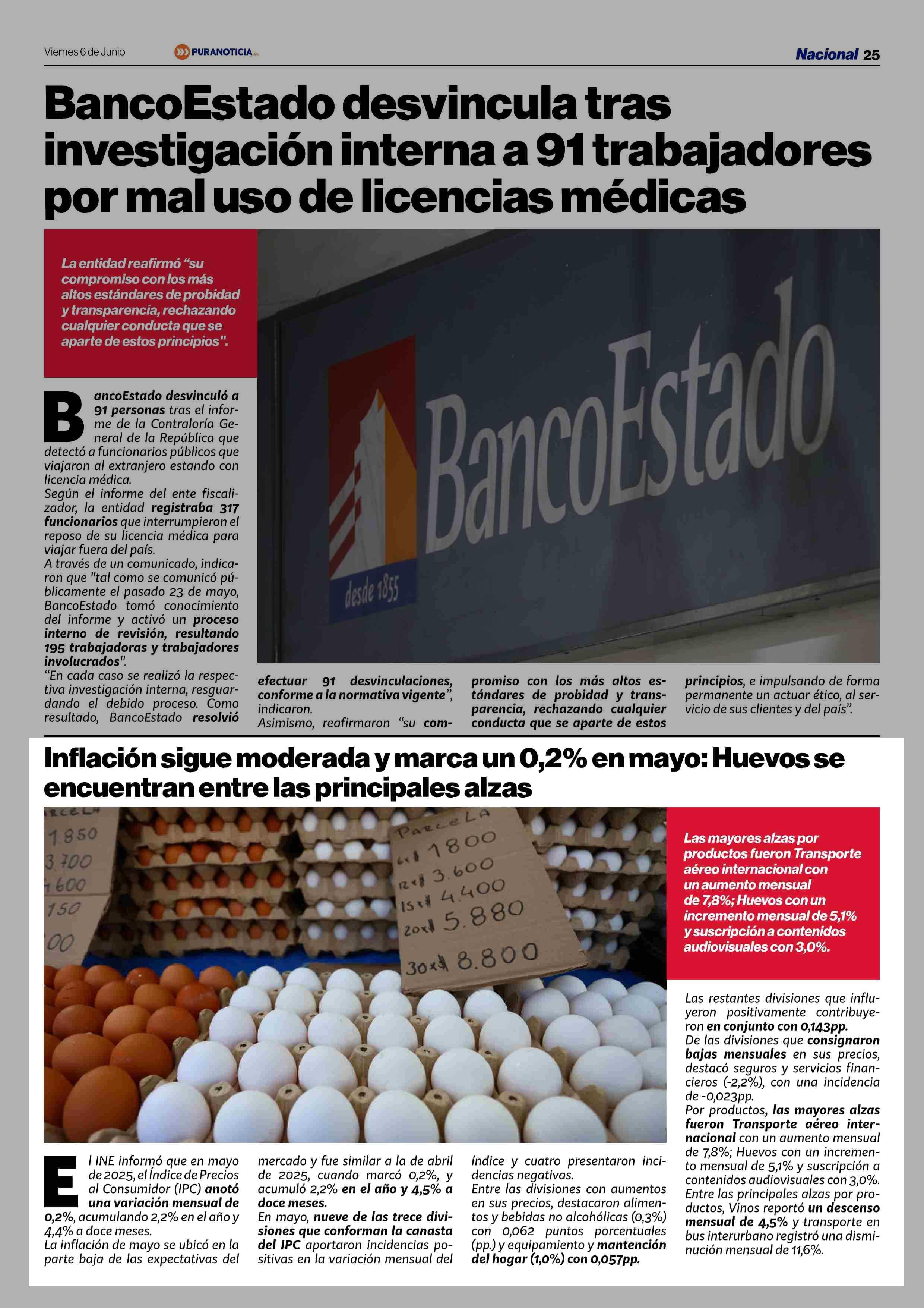 Inflación sigue moderada y marca un 0,2% en mayo: Huevos se encuentran entre las principales alzas 06-06-2025 Puranoticia.cl |